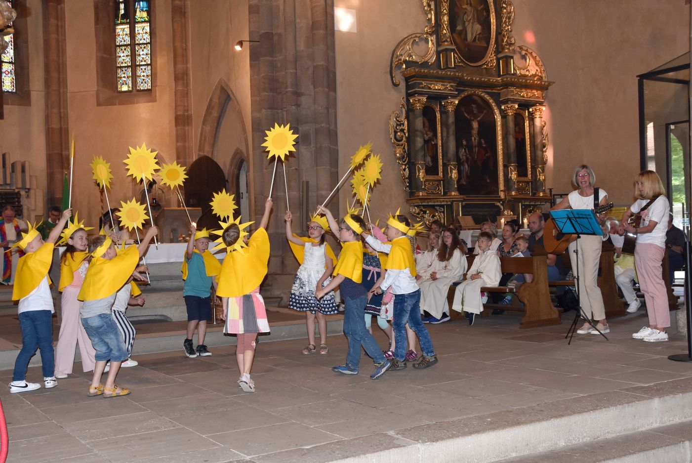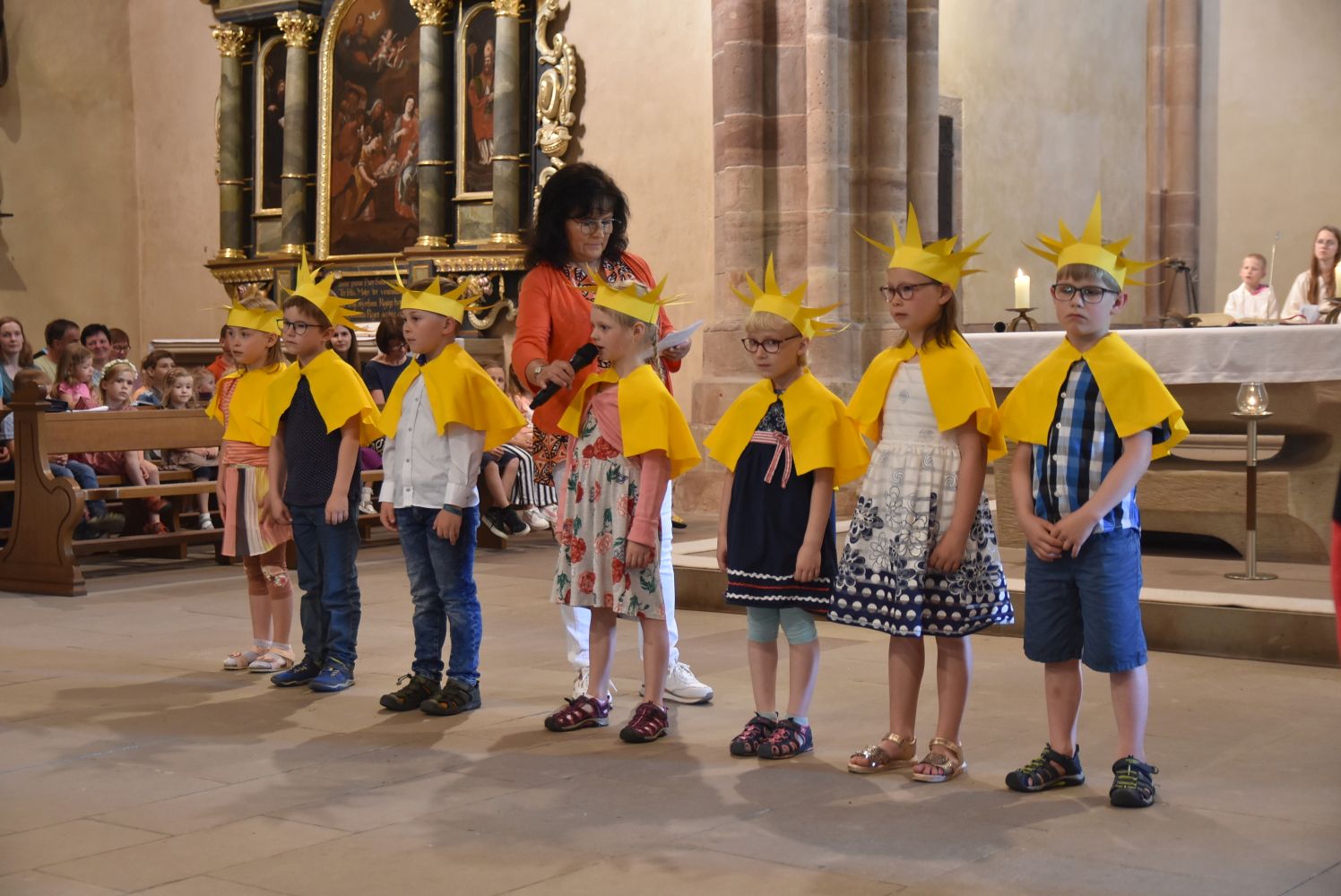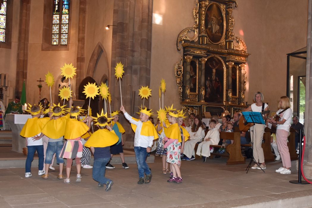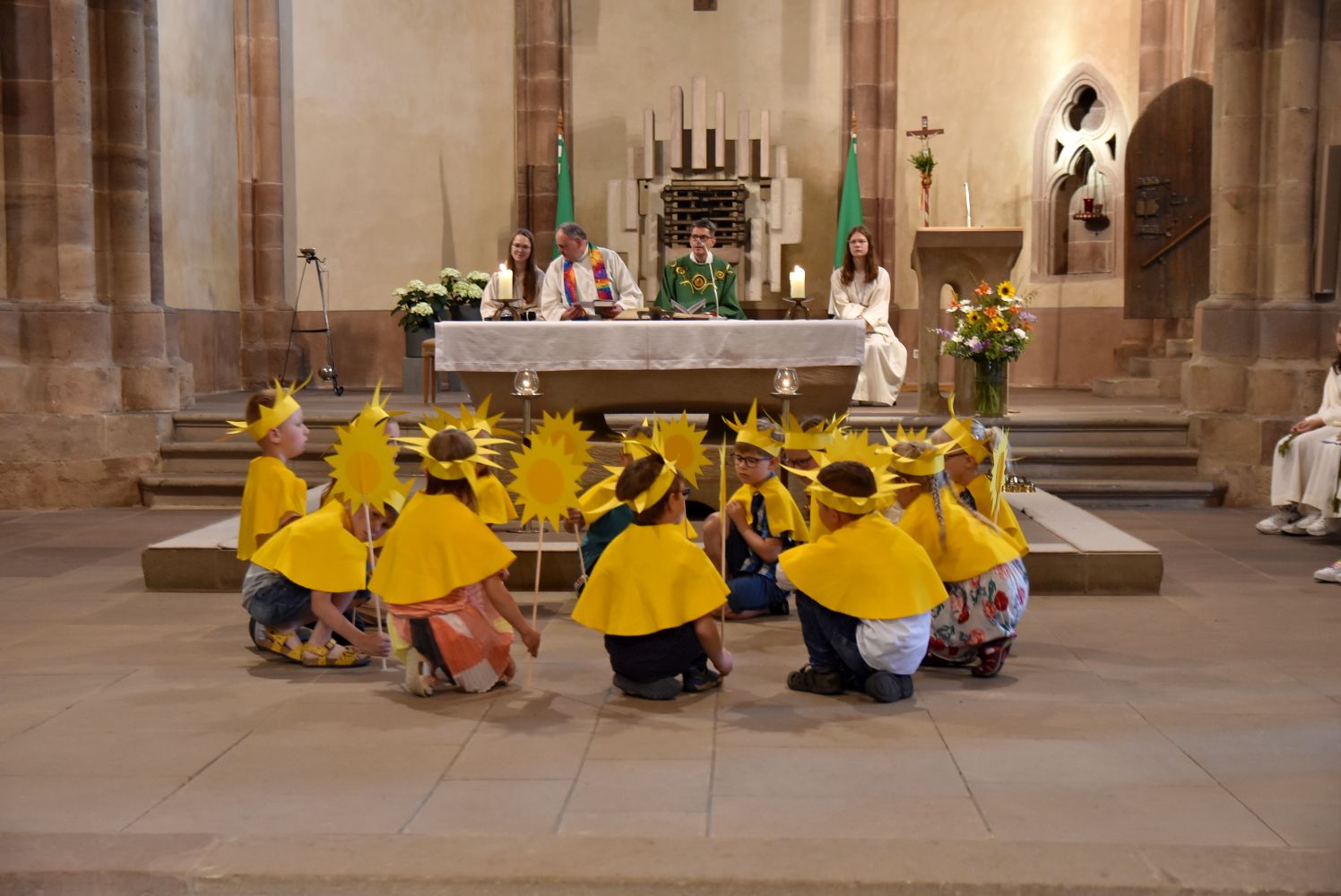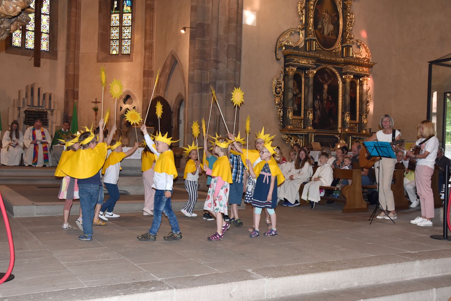 Gestaltet wurde diese vom Kindergarten unter dem Thema: „Sonnenstrahlen dringen bis ins Herz hinein“ (Kornelia Diemerling, Gabriele Lorenz-Füller, Caroline Uhl). Als Sonnenstrahlen traten die Schulanfängerkinder der Kita auf und trugen vor, warum sie als Sonnenstrahlen wichtig sind. Ebenso wurden von ihnen die Fürbitten vorgetragen. Beeindruckend war der Tanz als Sonnenstrahlen. Am Schluss des Gottesdienstes überreichten sie Pfarrer Markus Blümel je einen Sonnenstrahl mit guten Wünschen.