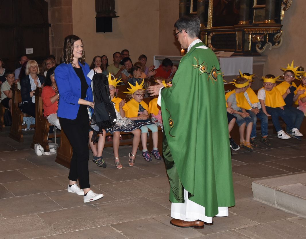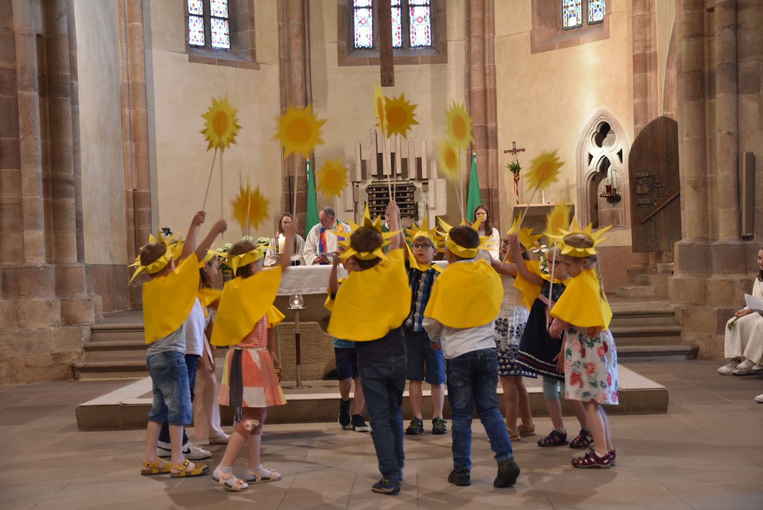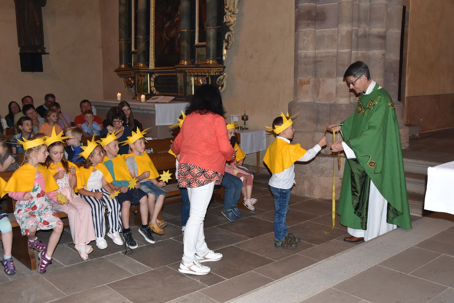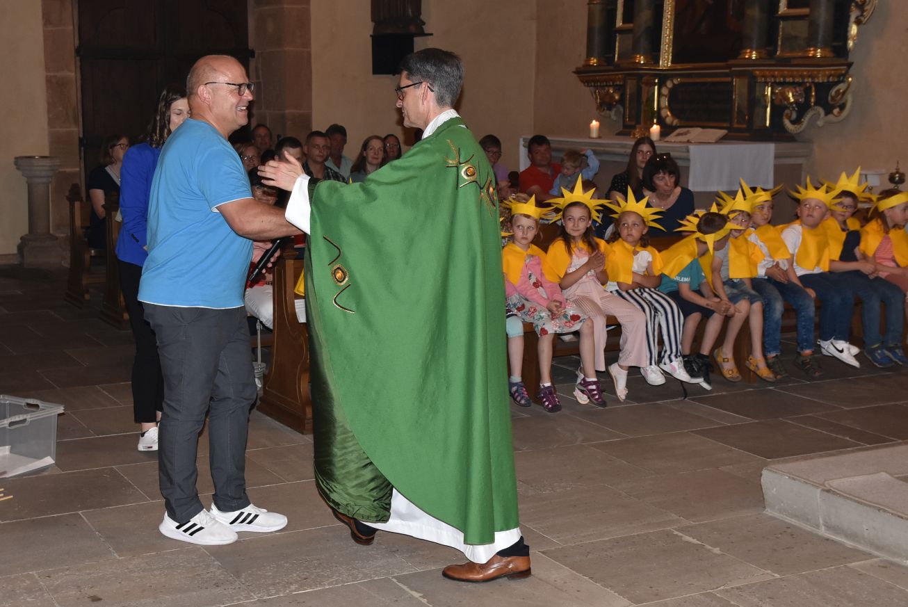 Gestaltet wurde diese vom Kindergarten unter dem Thema: „Sonnenstrahlen dringen bis ins Herz hinein“ (Kornelia Diemerling, Gabriele Lorenz-Füller, Caroline Uhl). Als Sonnenstrahlen traten die Schulanfängerkinder der Kita auf und trugen vor, warum sie als Sonnenstrahlen wichtig sind. Ebenso wurden von ihnen die Fürbitten vorgetragen. Beeindruckend war der Tanz als Sonnenstrahlen. Am Schluss des Gottesdienstes überreichten sie Pfarrer Markus Blümel je einen Sonnenstrahl mit guten Wünschen.