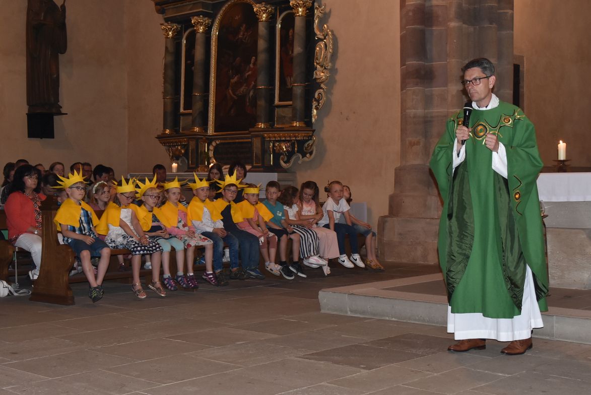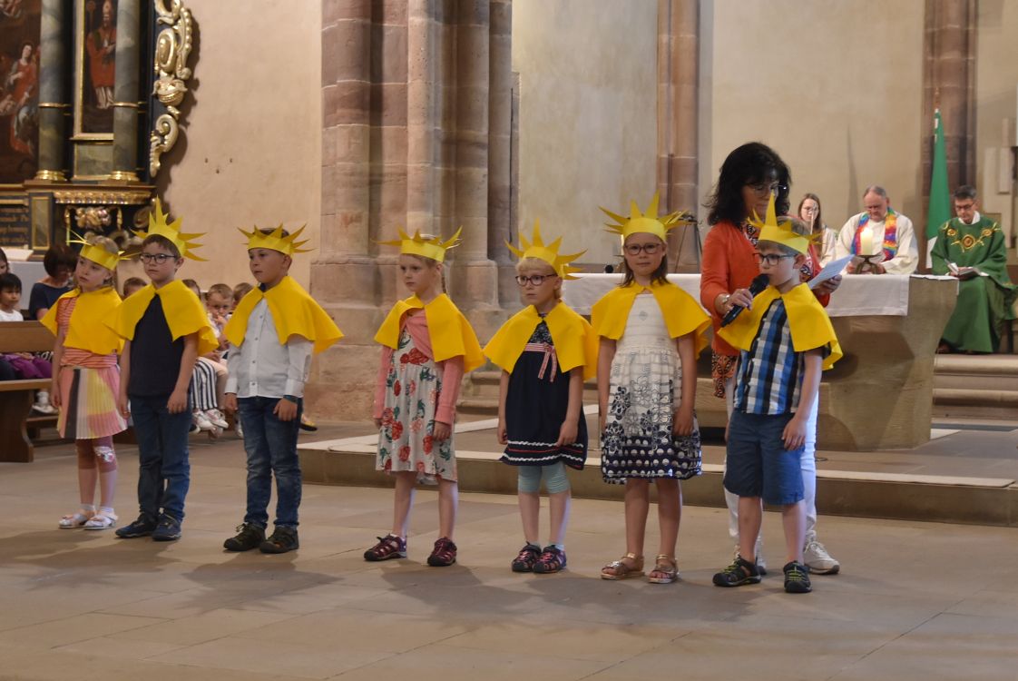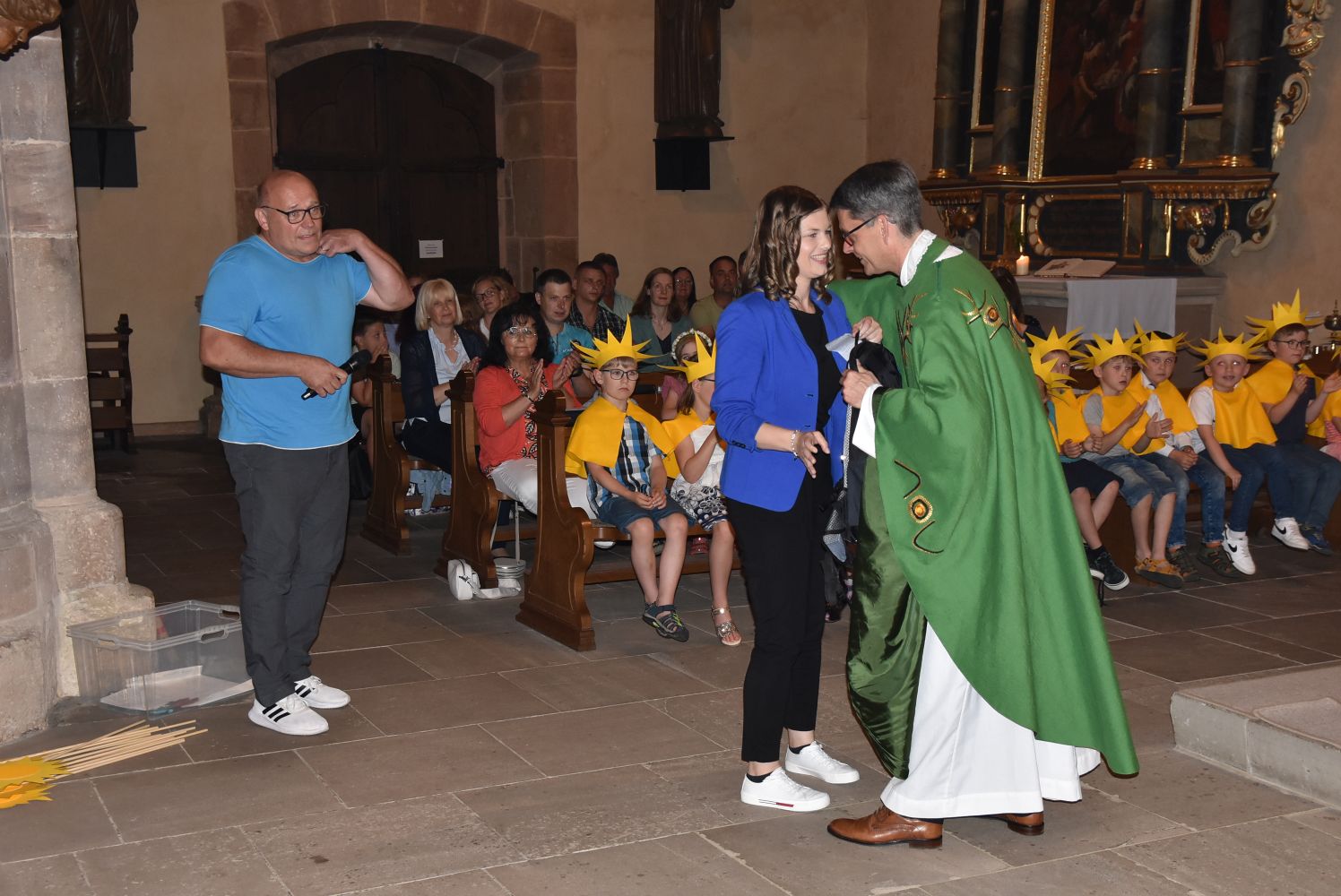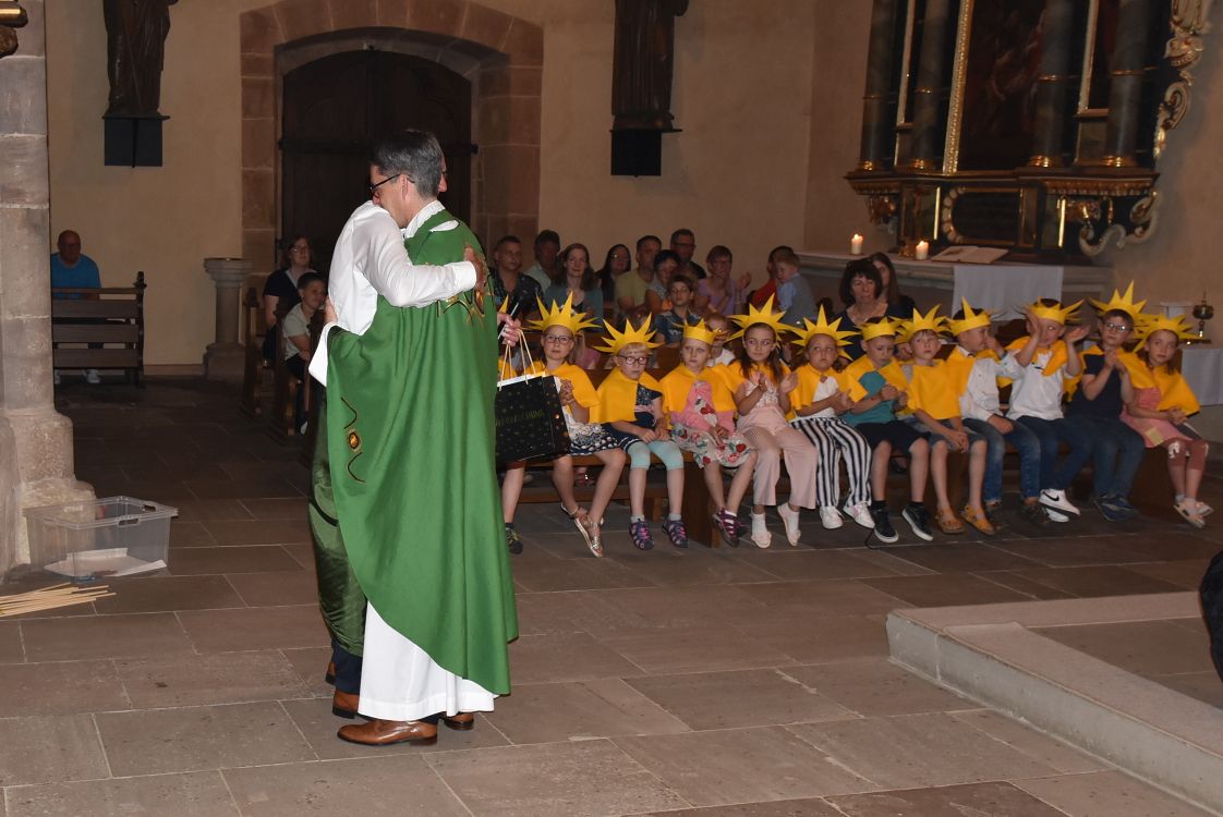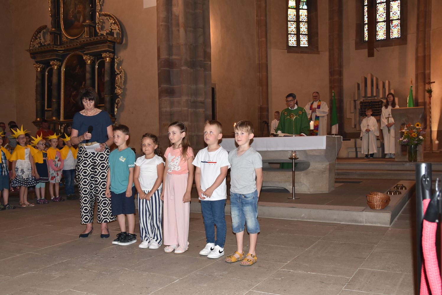 Gestaltet wurde diese vom Kindergarten unter dem Thema: „Sonnenstrahlen dringen bis ins Herz hinein“ (Kornelia Diemerling, Gabriele Lorenz-Füller, Caroline Uhl). Als Sonnenstrahlen traten die Schulanfängerkinder der Kita auf und trugen vor, warum sie als Sonnenstrahlen wichtig sind. Ebenso wurden von ihnen die Fürbitten vorgetragen. Beeindruckend war der Tanz als Sonnenstrahlen. Am Schluss des Gottesdienstes überreichten sie Pfarrer Markus Blümel je einen Sonnenstrahl mit guten Wünschen.