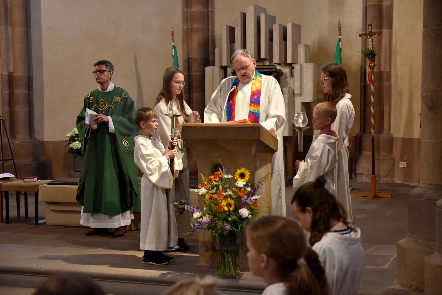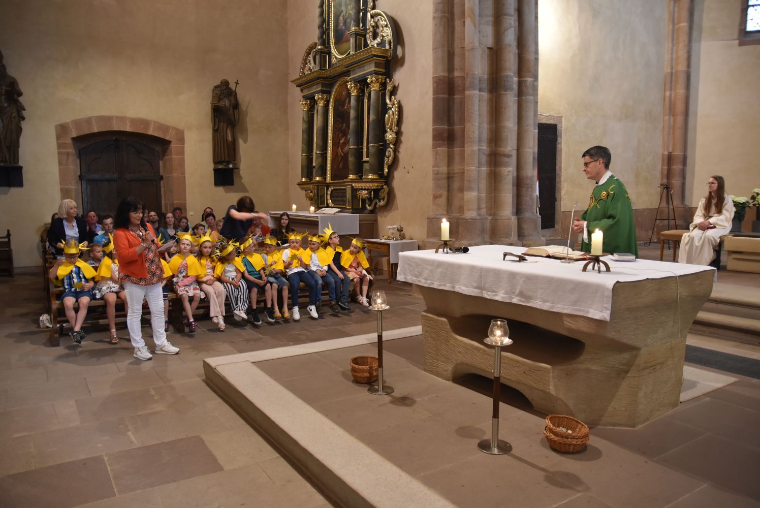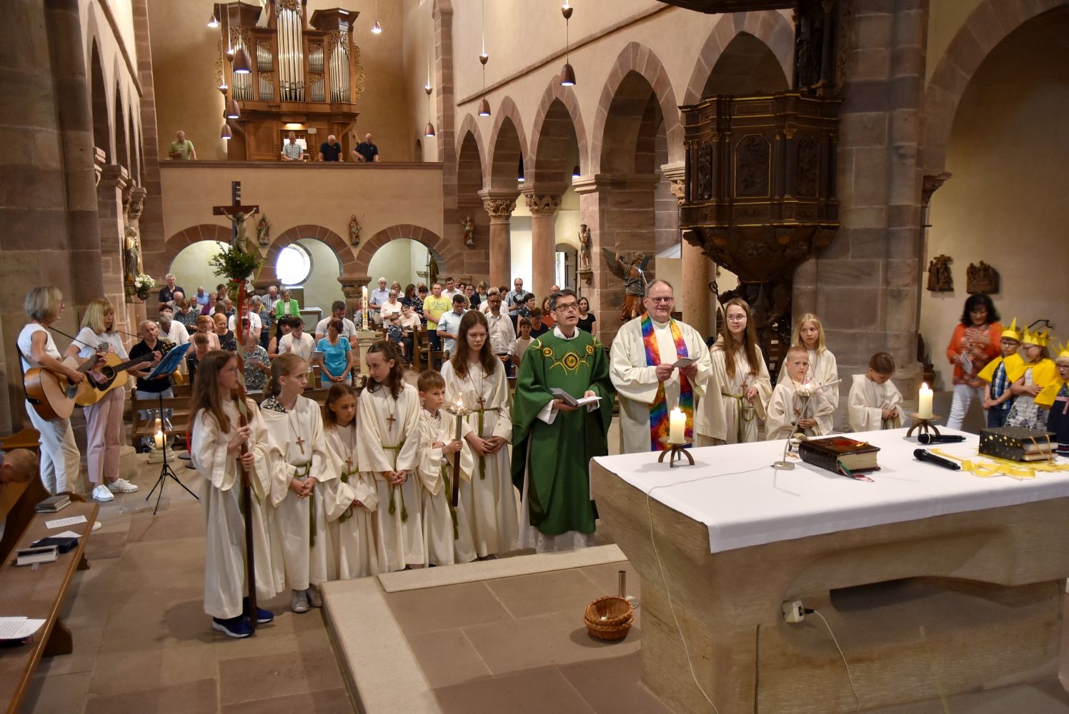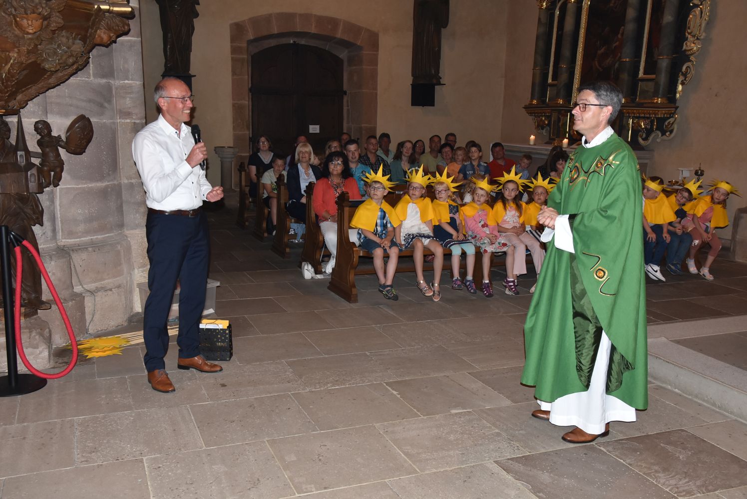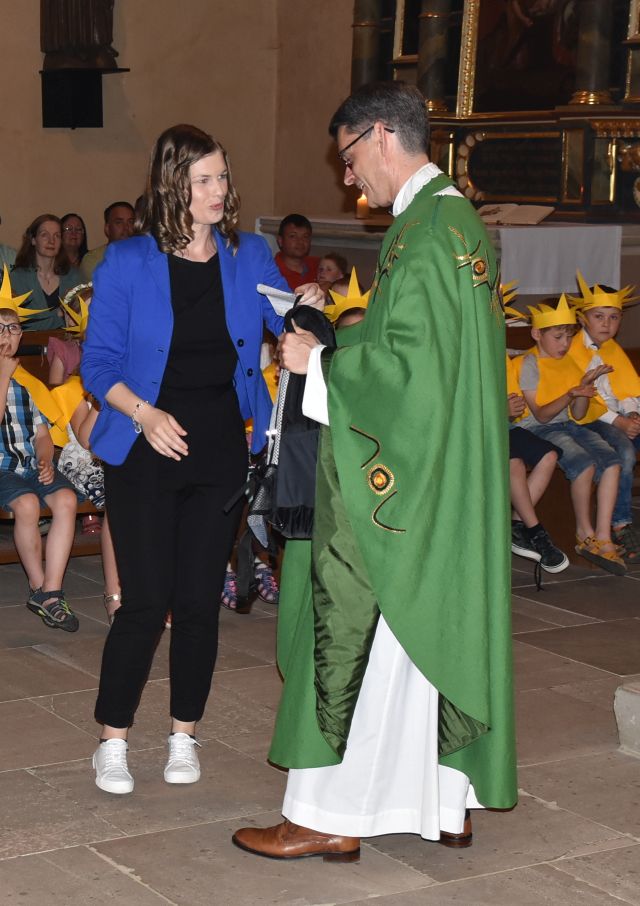 Gestaltet wurde diese vom Kindergarten unter dem Thema: „Sonnenstrahlen dringen bis ins Herz hinein“ (Kornelia Diemerling, Gabriele Lorenz-Füller, Caroline Uhl). Als Sonnenstrahlen traten die Schulanfängerkinder der Kita auf und trugen vor, warum sie als Sonnenstrahlen wichtig sind. Ebenso wurden von ihnen die Fürbitten vorgetragen. Beeindruckend war der Tanz als Sonnenstrahlen. Am Schluss des Gottesdienstes überreichten sie Pfarrer Markus Blümel je einen Sonnenstrahl mit guten Wünschen.