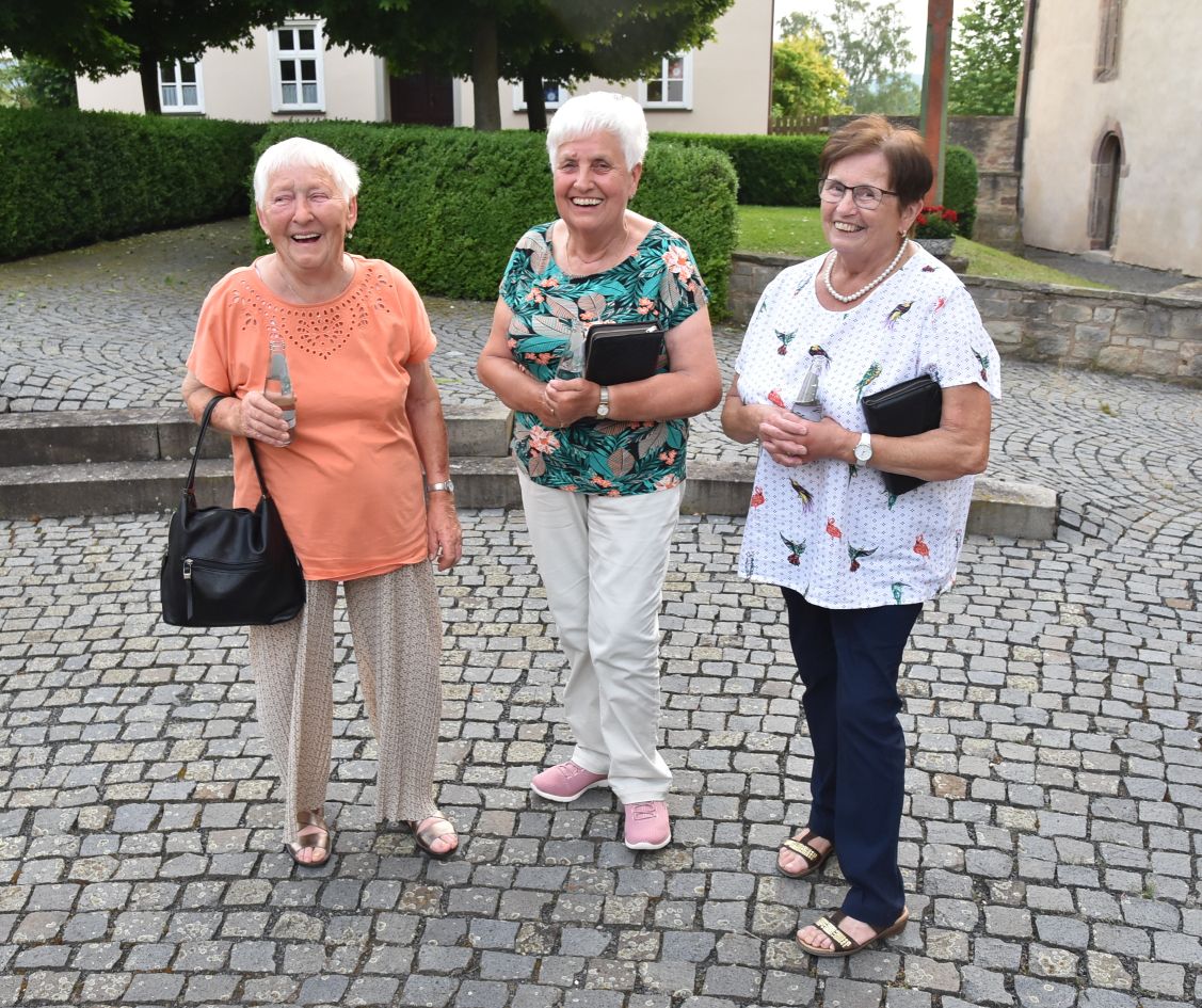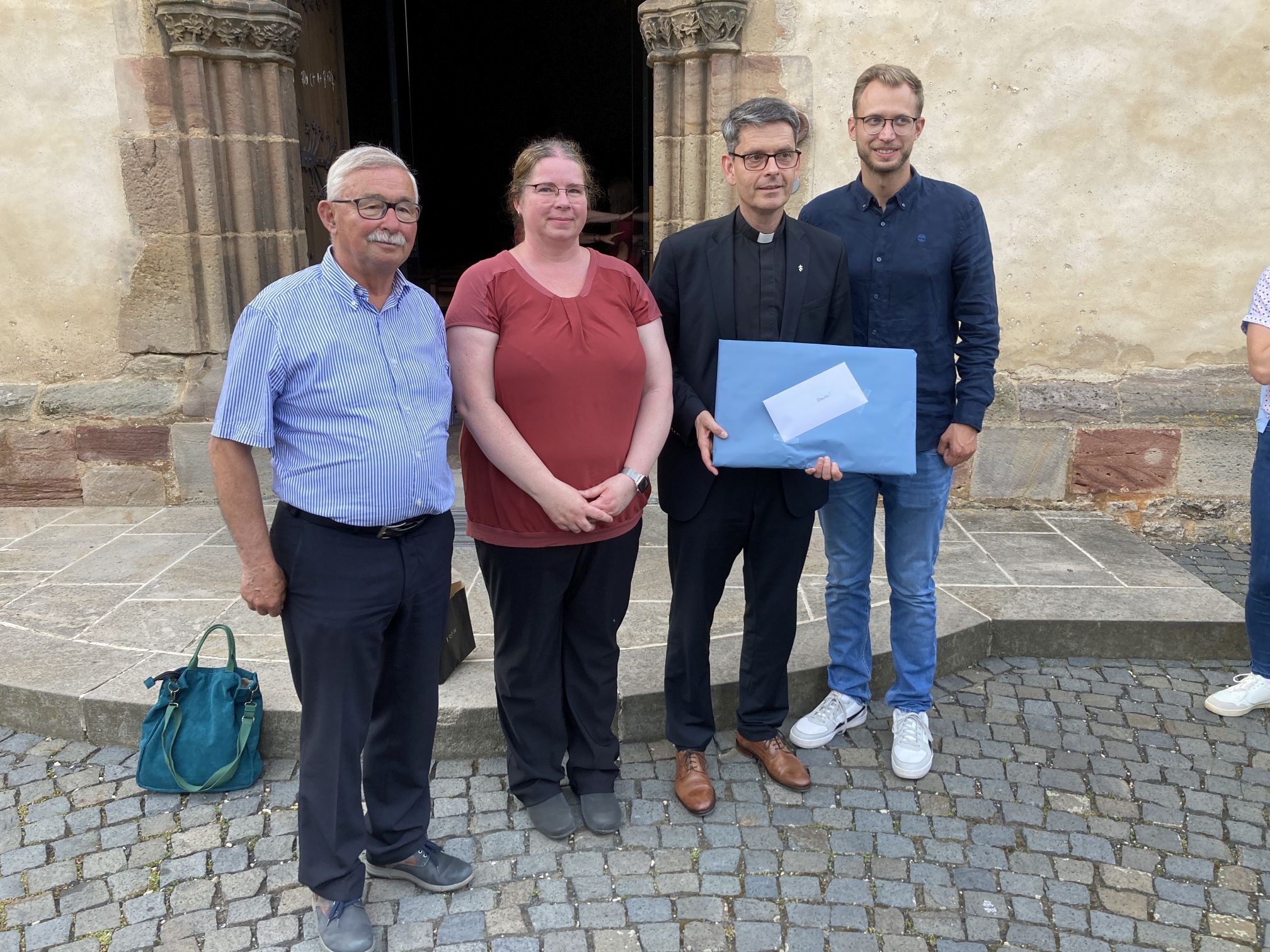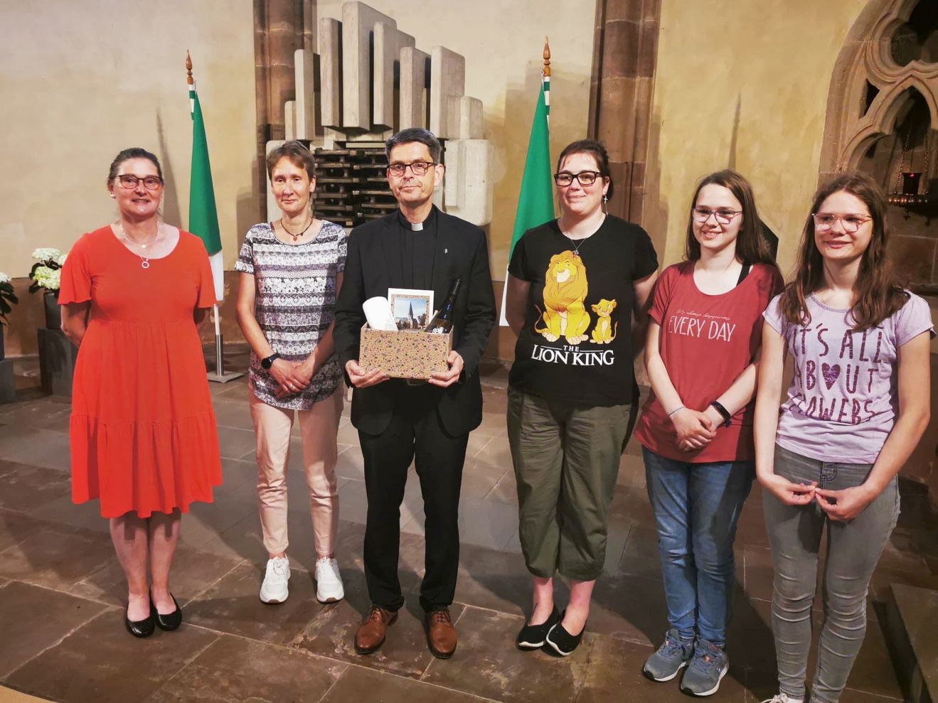 Für den Pfarrgemeinde- und Verwaltungsrat dankten Nadine Lenz und Matthias Budenz. Nadine Lenz betonte, dass Markus Blümel als leitenden Pfarrer fünf Jahre die Kirchengemeinde begleitet habe. Er habe es am Anfang nicht immer leicht mit der selbstständigen Pfarrei gehabt. „Was will denn der Eiterfelder Pfarrer hier bei uns?“ Diesen Satz oder in ähnlicher Form habe er zu Beginn des Öfteren zu hören bekommen. Aber er habe sich nicht entmutigen lassen. Mit dem Vertrauen darauf, dass Gott einen guten Plan habe, sei er von Beginn an offen und mit Herzenswärme in der Gemeinde dabei gewesen. Das habe Halt und Zuversicht gegeben. Halt und Zuversicht bestärkten auch darin, dass die Gemeinde natürlich weiterhin sehr gerne einen eigenen Pfarrer hätte, der am liebsten auch im Rasdorfer Pfarrhaus wohnen solle. Pfarrer Markus Blümel habe es ermöglicht, dass dieses Gefühl weiterhin zu spüren sei. In gemeinsamer Abstimmung dürfe Pfarrer Ulrich Piesche weiterhin zu 90% in Rasdorf zelebrieren. Man hätte dadurch in Kauf nehmen müssen, dass er als Pfarrer selten in Rasdorf gewesen sei, aber man könne eben nicht jeden Sonnenstrahl mitnehmen. Im Namen des Pfarrgemeinderates, gemeinsam mit dem Verwaltungsrat und allen Untergruppen bedankten sich Nadine Lenz als Sprecherin des PGR auch im Namen der Kirchengemeinde für den unermüdlichen Einsatz. Insbesondere auch für das Vertrauen, dass er den Ehrenamtlichen entgegengebracht habe und so Freiräume gestaltet werden konnten. So habe der PGR bspw. auch mal den Gottesdienstablauf auf den Kopf stellen und ein Theaterstück vor der Kirche aufführen können. Ein Theaterstück führe der PGR auch wieder mit Kindern ab 3 Jahren am 6. August in der Kirche zum Thema Arche Noah auf. Er sei dazu herzliche eingeladen, um auch den ein oder anderen Bekannten wieder zu treffen. Damit dafür die Fahrradtour nach Rasdorf nicht so weit erscheine, habe man in das Geschenk Fahrradrucksack mit Rasdorf-Logo ausreichend Proviant gepackt. Gott habe einen guten Plan, so habe er es in der Abschiedsansprache formuliert. Im Vertrauen darauf, dass Gott einen guten Plan habe, der nicht immer sofort verständlich erscheine, bleiben die Pfarrgemeinde mit ihm verbunden im Gebet.