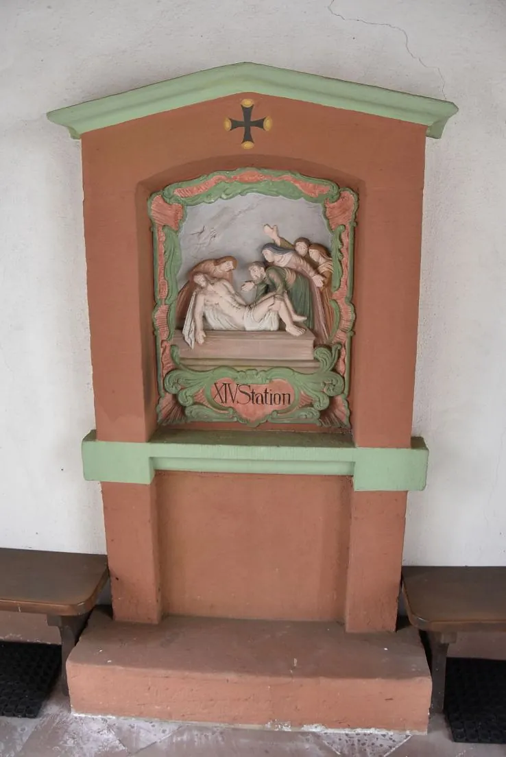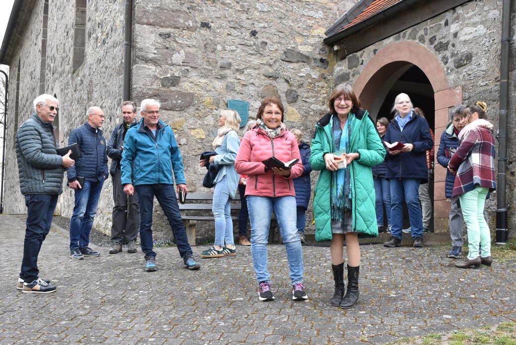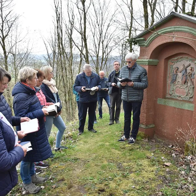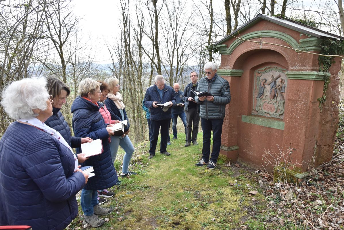 Der Kreuzweg am Gehilfersberg am Nachmittag des Palmsonntags gehört schon viele Jahre zur Tradition des kirchlichen Lebens in Rasdorf. In diesem Jahr hatten sich viele Mitbetende eingefunden. Die Stationen beginnen am Weg etwas unterhalb der Wallfahrtskirche. Die Stationen 1-11 sind rund um den Berggipfel angeordnet und tangieren den Friedhofswald Gehilfersberg. Gegenüber der Seiteneingangstür der Wallfahrtskirche befindet sich die 12. Station, sowie die 13. Station auf der gegenüberliegenden Seite. Abschluss des Kreuzweges ist an der 14. Station im Vorraum des Haupteingangs zur Wallfahrtskirche.