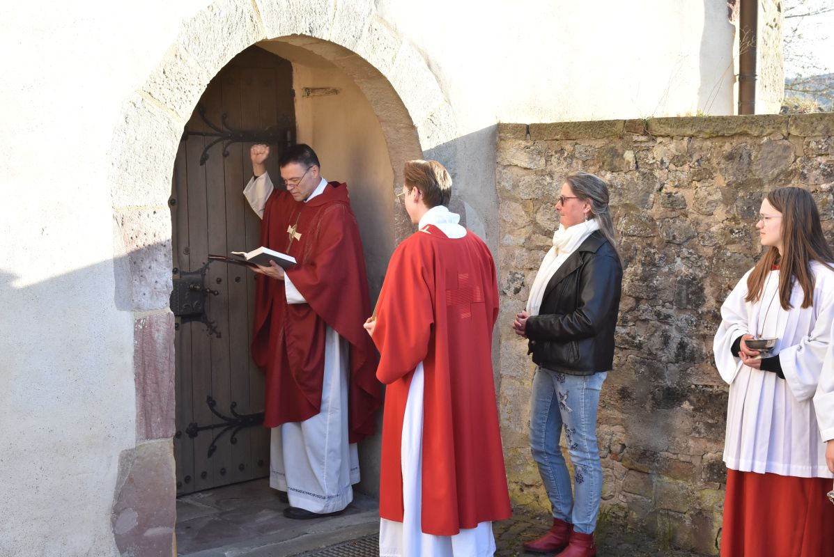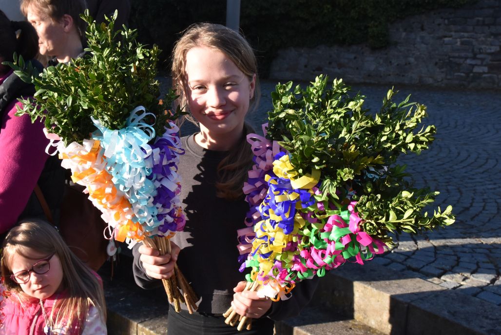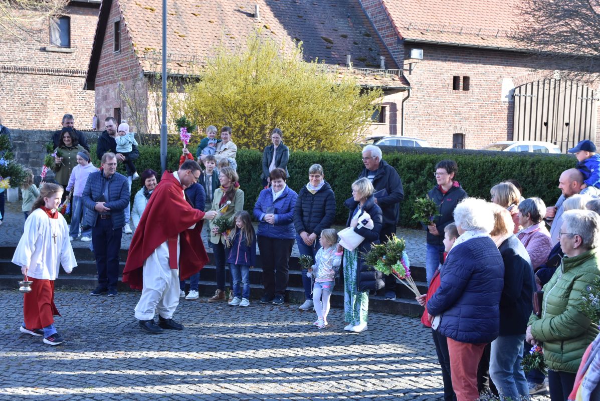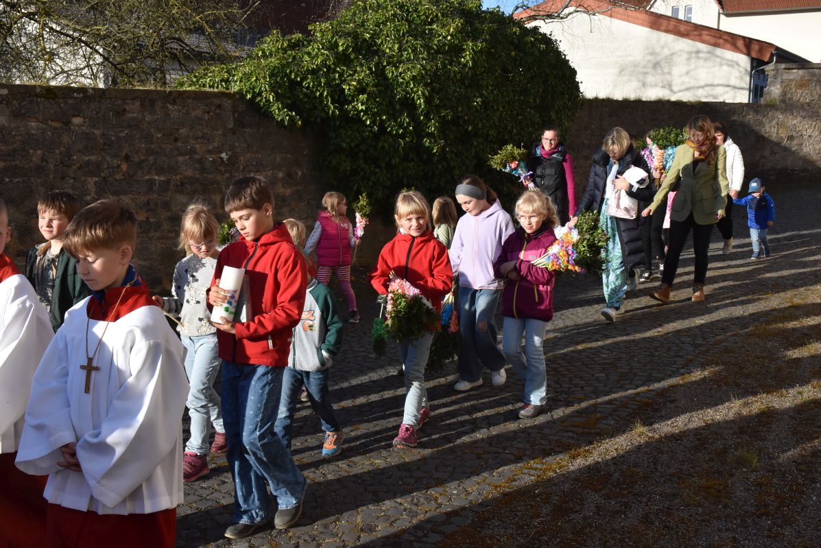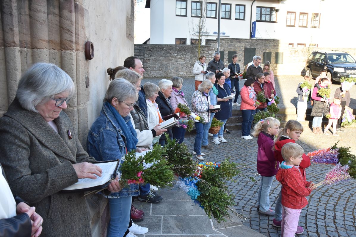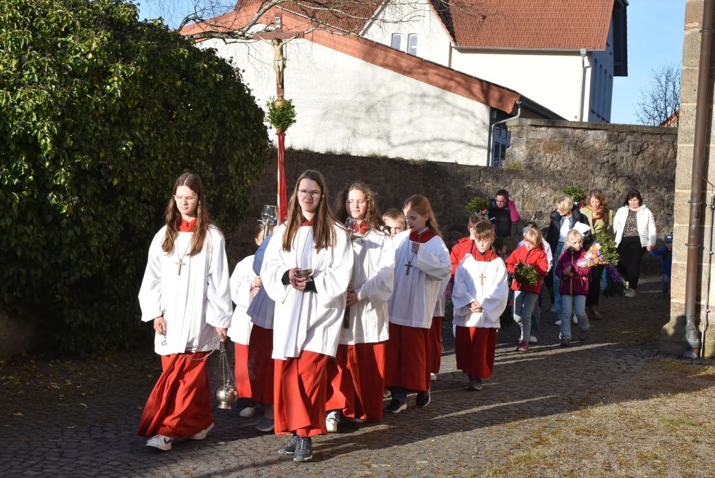 Einen eindrucksvollen Gottesdienst gab es am Palmsonntag in der Stiftskirche in Rasdorf. Zur Segnung der Palmsträußen hatten sich die Kirchenbesucher rund um den Brunnen vor der Stiftskirche versammelt. Pfarrer Markus Günther eröffnete die Feier und Diakon Marcel Krawietz verlas das Evangelium zum Palmsonntag. Nach der Segnung der Palmsträuße zog die gesamte Gemeinde zum Nordeingang der Stiftskirche. Pfarrer Markus Günther klopfte gegen die verschlossene Tür, die geöffnet wurde und alle zogen durch diese in die Kirche. Bildlich wurde so der Einzug Jesu in Jerusalem nachvollzogen. Danach folgte die Liturgie zum Palmsonntag.