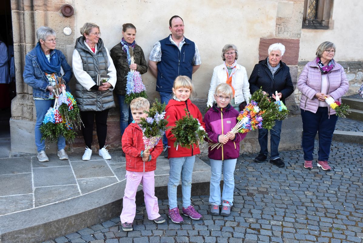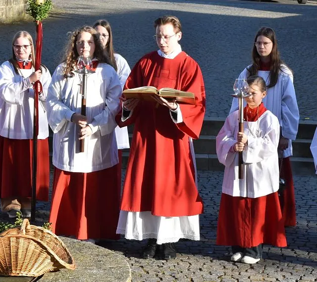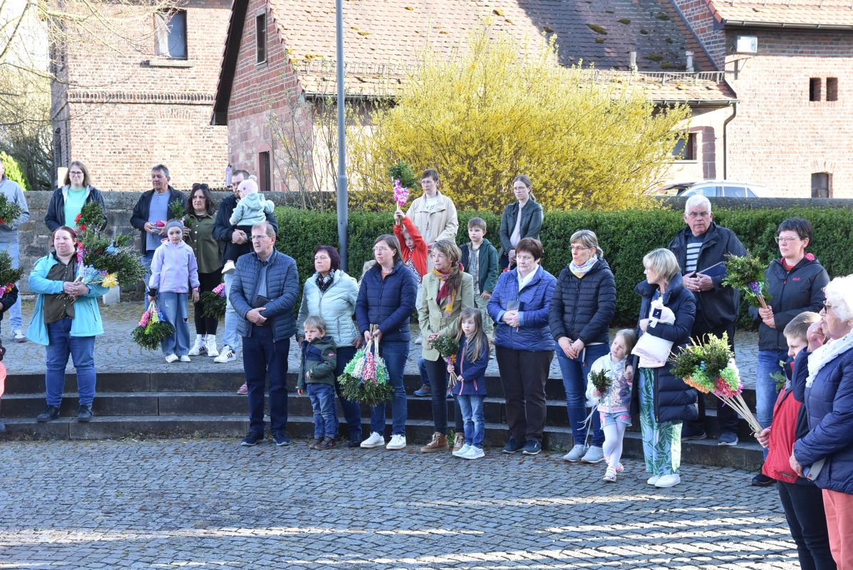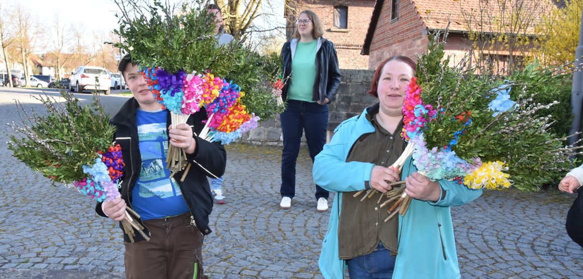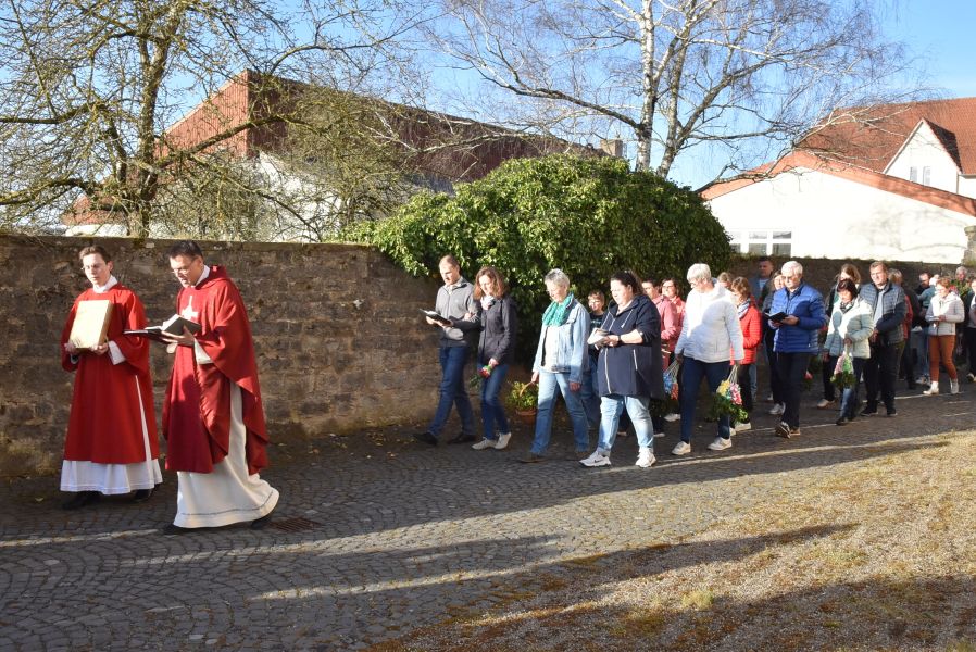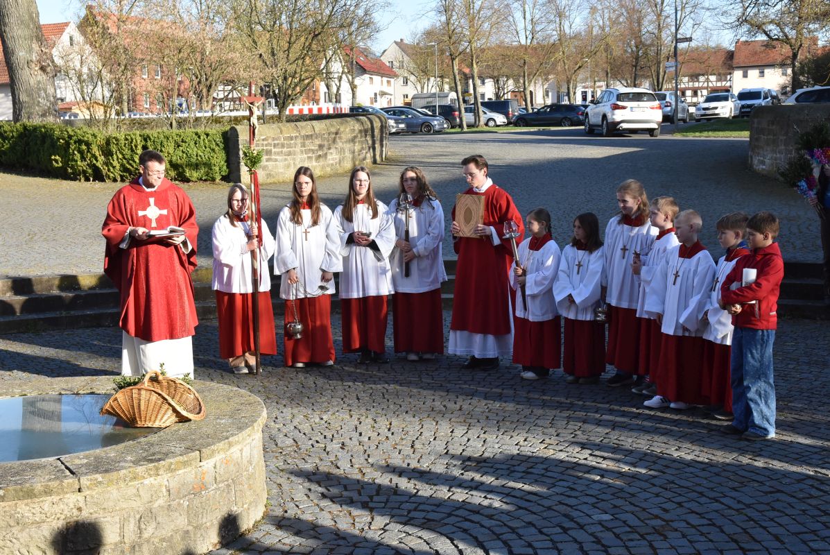 Einen eindrucksvollen Gottesdienst gab es am Palmsonntag in der Stiftskirche in Rasdorf. Zur Segnung der Palmsträußen hatten sich die Kirchenbesucher rund um den Brunnen vor der Stiftskirche versammelt. Pfarrer Markus Günther eröffnete die Feier und Diakon Marcel Krawietz verlas das Evangelium zum Palmsonntag. Nach der Segnung der Palmsträuße zog die gesamte Gemeinde zum Nordeingang der Stiftskirche. Pfarrer Markus Günther klopfte gegen die verschlossene Tür, die geöffnet wurde und alle zogen durch diese in die Kirche. Bildlich wurde so der Einzug Jesu in Jerusalem nachvollzogen. Danach folgte die Liturgie zum Palmsonntag.