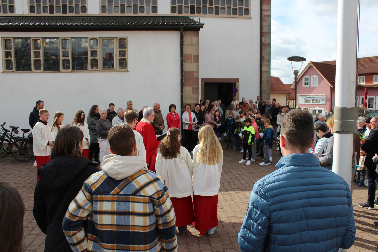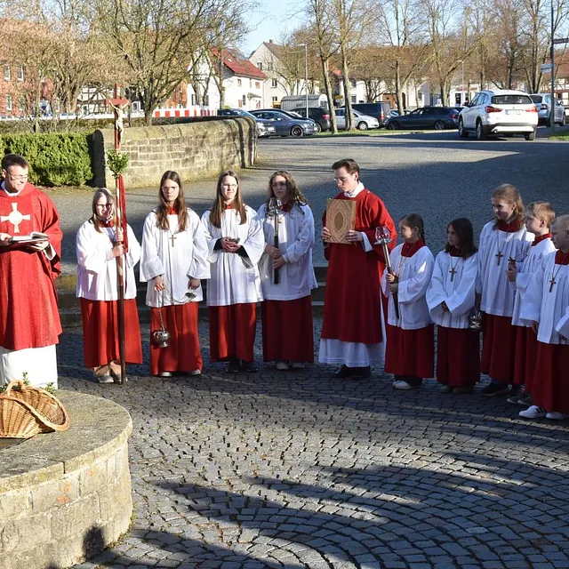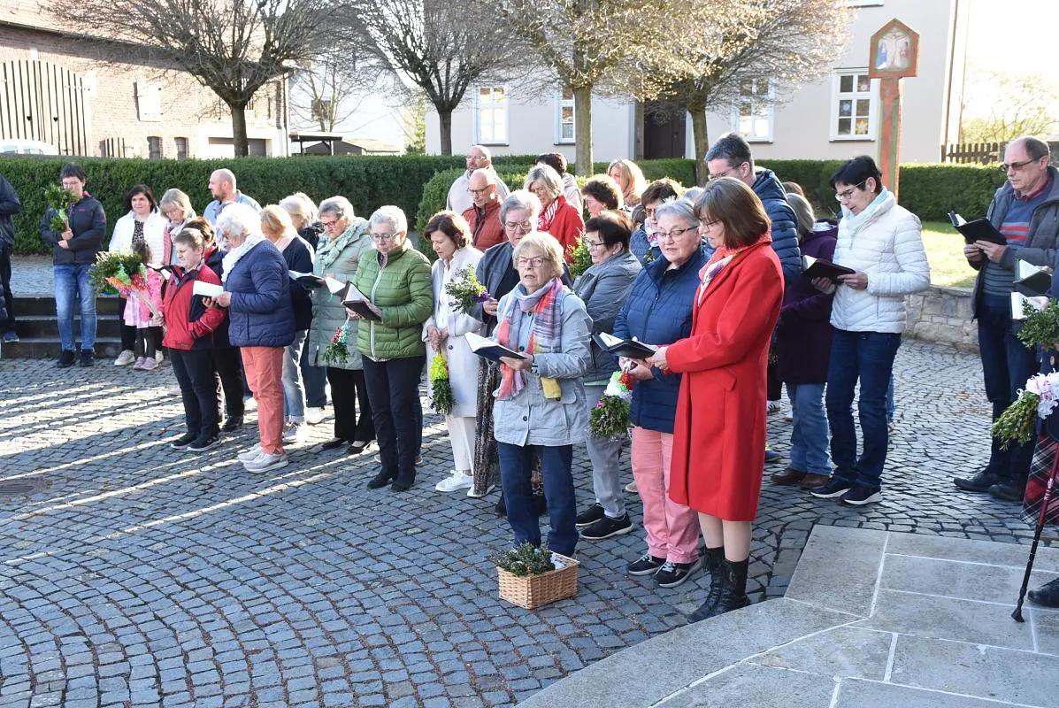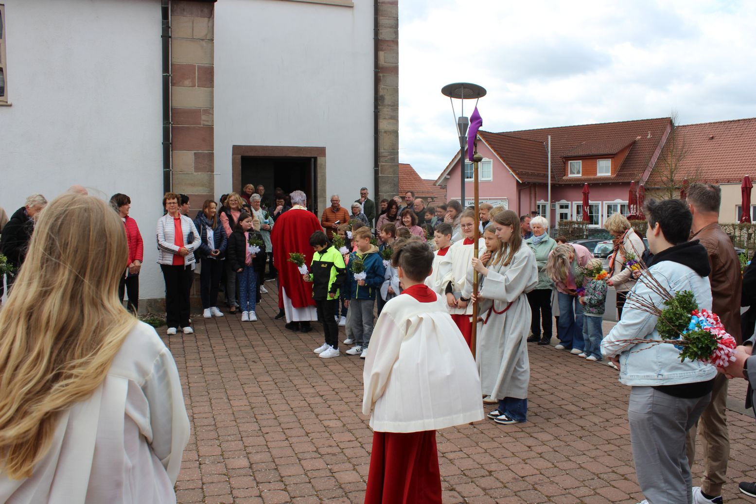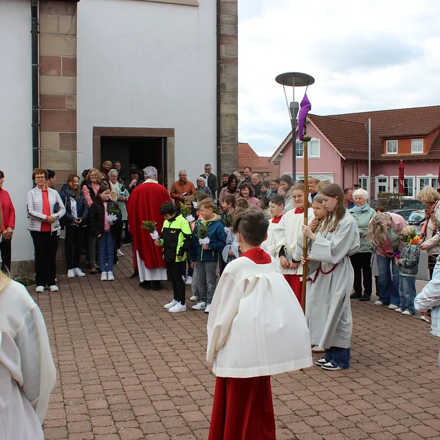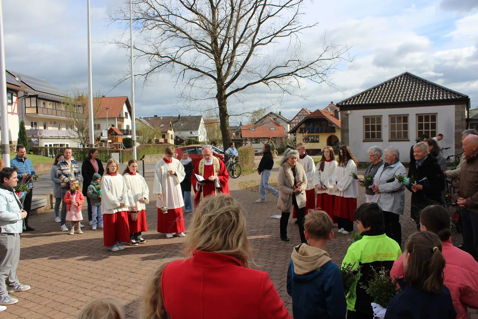 Einen eindrucksvollen Gottesdienst gab es am Palmsonntag in der Stiftskirche in Rasdorf. Zur Segnung der Palmsträußen hatten sich die Kirchenbesucher rund um den Brunnen vor der Stiftskirche versammelt. Pfarrer Markus Günther eröffnete die Feier und Diakon Marcel Krawietz verlas das Evangelium zum Palmsonntag. Nach der Segnung der Palmsträuße zog die gesamte Gemeinde zum Nordeingang der Stiftskirche. Pfarrer Markus Günther klopfte gegen die verschlossene Tür, die geöffnet wurde und alle zogen durch diese in die Kirche. Bildlich wurde so der Einzug Jesu in Jerusalem nachvollzogen. Danach folgte die Liturgie zum Palmsonntag.