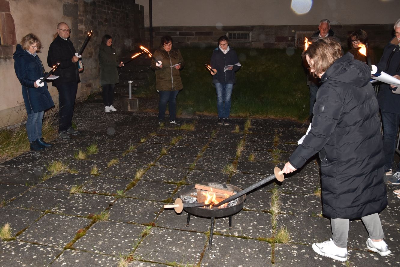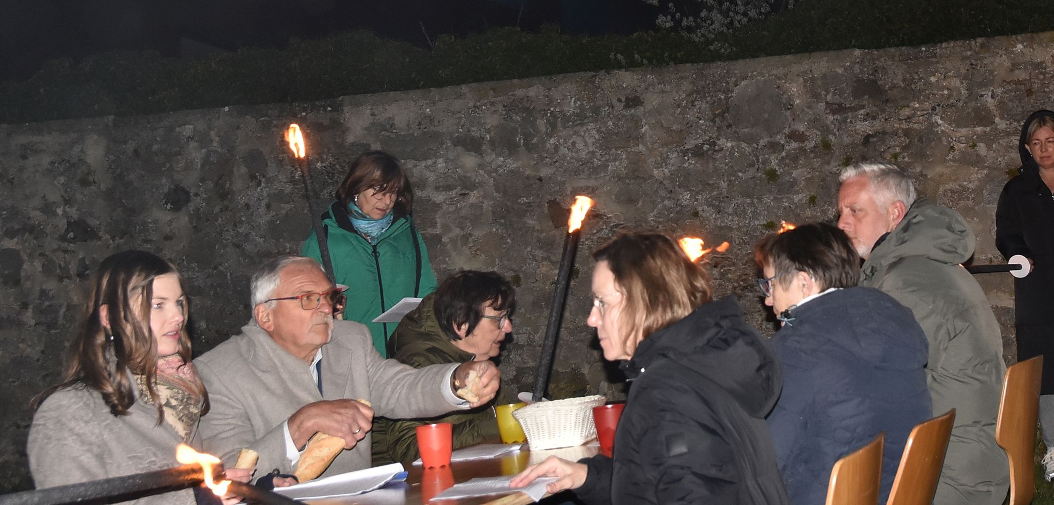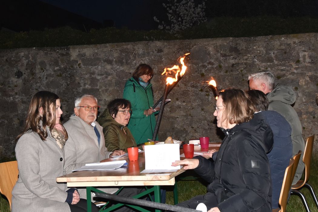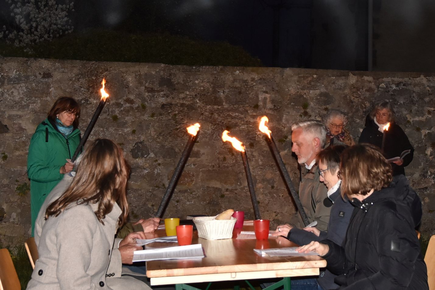 Eine etwas andere Ölbergandacht konnten die Mitbetenden in Rasdorf erleben. Unter dem Thema: „Den letzten Abend aus der Sicht von Petrus erleben und feiern“ zogen die Gläubigen nach der Eröffnung mit Fackeln in den Pfarrgarten der Stiftskirche. Dort erzählte Petrus, was er aus seiner Sicht mit Jesus erlebt hatte. Bei der ersten Station „Zusammenkommen“ wurde das letzte Abendmahl szenisch dargestellt. Die Jünger und Petrus verstehen noch nicht die Wandlungsworte. Die zweite Station „Dienen“ beinhaltete die Fußwaschung. Sie zeigt den Konflikt den Petrus hatte, sich von Jesus die Füße waschen zu lassen und die Bedeutung an Jesus teil zu haben. „Wachsam sein“, Petrus rätselt was Jesus da am Ölberg tut, denn er versteht das verzweifelte Gebet Jesu nicht. Nach all den Strapazen schläft Petrus ein, obwohl er wachen und beten sollte. Judas der Verräter, aber Petrus selbst verrät Jesus, als er gefragt wird, ob er nicht auch ein Jünger sei. Symbolhaft erklang bei der Station „Verraten“ zweimal ein Hahnenschrei. Vor dem Heiligen Grab in der Stiftskirche endete die Ölbergandacht mit dem „Schluss-Impuls“. Die Teilnehmenden konnten sich mit der Frage auseinandersetzen, wie sie ihren Glauben, ob gefragt oder ungefragt, bekennen. Sie konnten ein Licht am Heiligen Grab entzünden, als Zeichen, dass wir aus den Kartagen Hoffnung schöpfen können, dass Jesus Christus uns in unserem Leben bei Höhen und Tiefen begleitet.