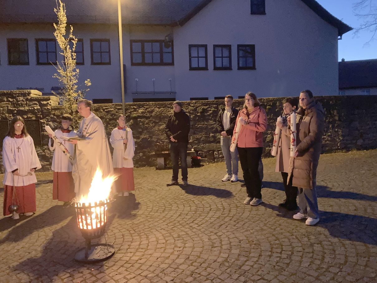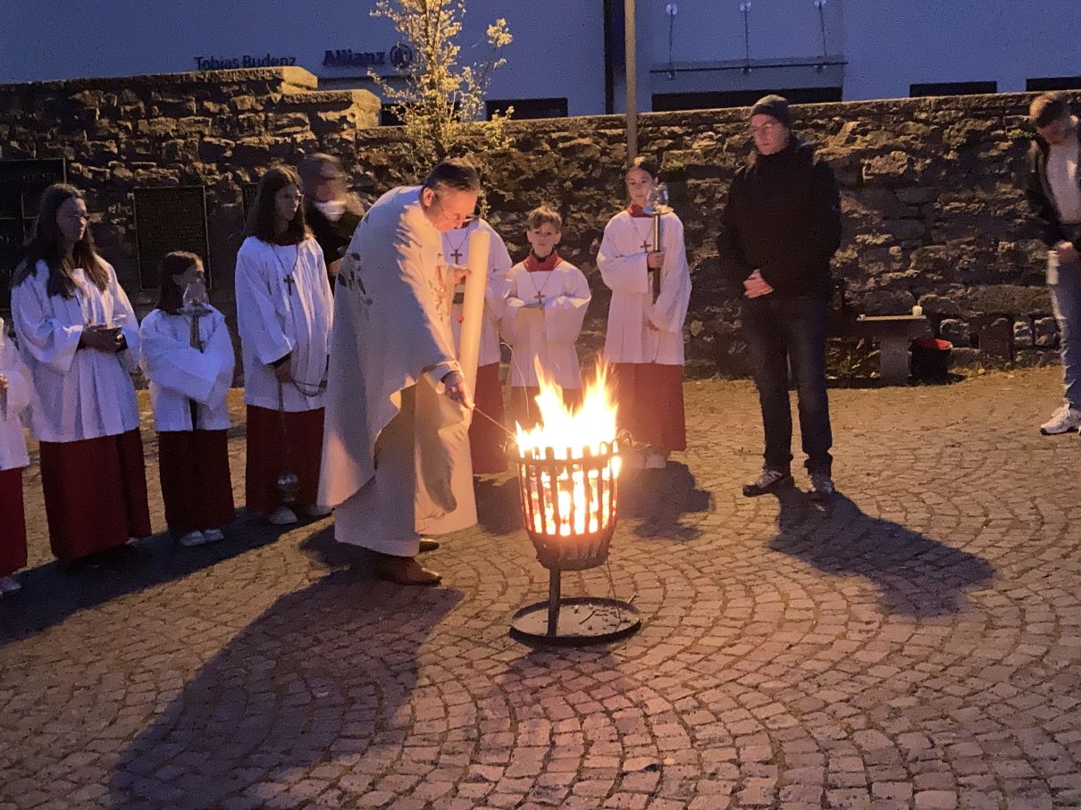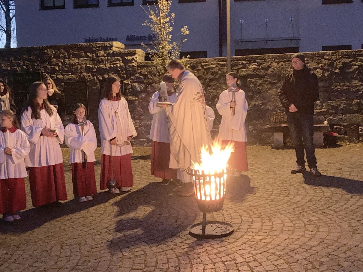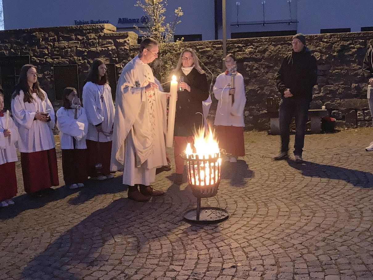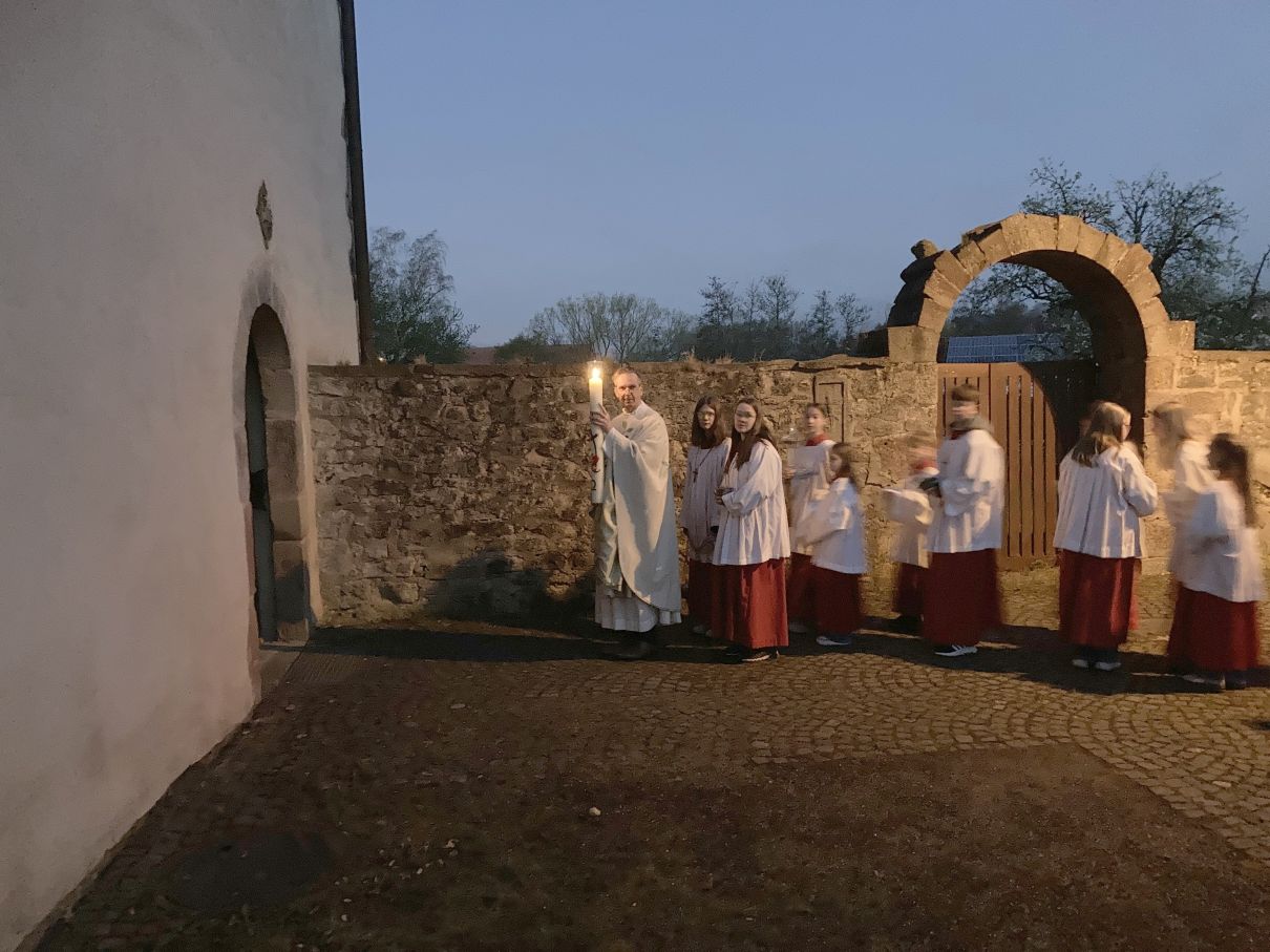 Einen feierlichen Auferstehungsgottesdienst feierten die Gläubigen mit Pfarrer Andreas Matthäi in der Stiftskirche in Rasdorf. Am frühen Morgen um 5.30 Uhr wurde die Osterkerze gesegnet und am lodernden Feuer entzündet. „Christus gestern und heute, Anfang und Ende, Alpha und Omega, sein ist die Zeit und die Ewigkeit, sein ist die Macht und die Herrlichkeit.“ In die Kreuzbalken und deren Schnittpunkt wurden fünf Weihrauchkörner mit den Worten eingefügt: „Durch deine heiligen Wunden, die leuchten in Herrlichkeit, behüte uns und bewahre uns Christus der Herr, Amen.“ Der langsam dämmernde Tag und der beginnende Gesang der ersten Vögel unterstrich in beeindruckender Weise das Ostergeheimnis. Jesus Christus ist wahrhaft von den Toten auferstanden – Halleluja. Danach zogen die Gläubigen durch den Kreuzgang in die dunkle Kirche, die beim „Lumen Christi- Deo gratias“ und dem Entzünden der Kerzen der Gottesdienstteilnehmer sich immer mehr erhellte. Nach dem Gloria erschallten die Glocken wieder und die Kirche erstrahlte in hellem Lampenlicht. Neu war, dass wegen Ermangelung eines Organisten/ Organistin die Osterlieder am Keyboard und mit der Gitarre begleitet wurden. Pfarrer Andreas Matthäi dankte den Küsterinnen, Messdienerinnen und Messdienern und allen Aktiven, die sich in die Vorbereitung und Durchführung des Gottesdienstes eingebracht hatten und den Gläubigen für ihr kommen. Er wünschte allen ein frohes und gesengtes Osterfest. Den Dank begleiteten die Teilnehmenden mit herzlichem Applaus.