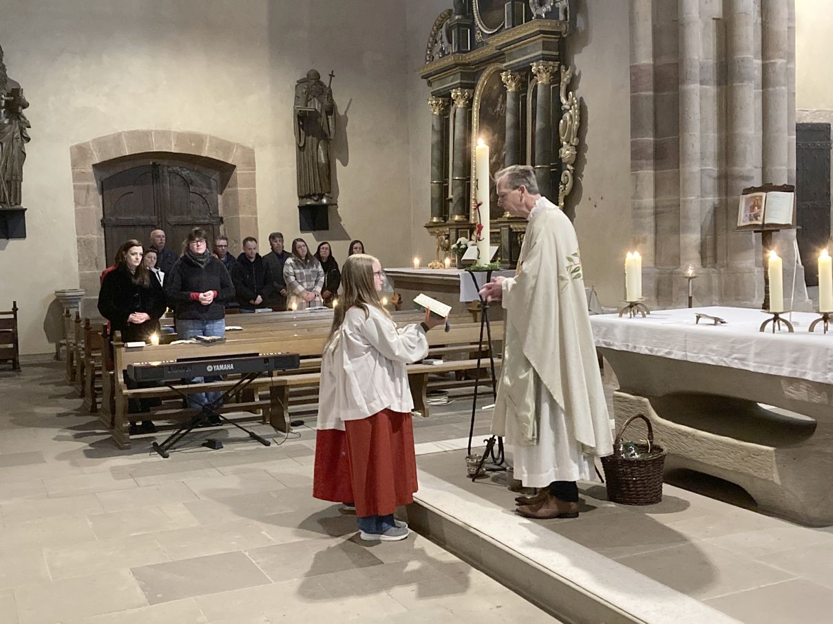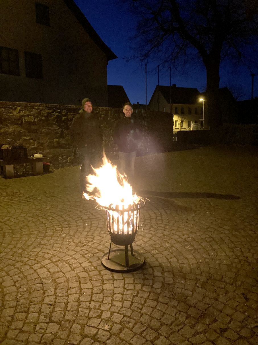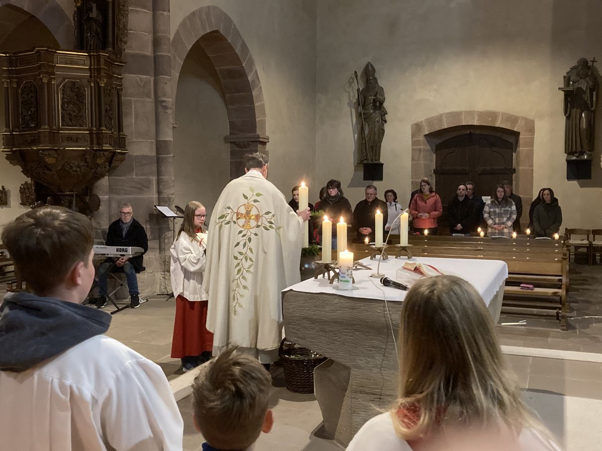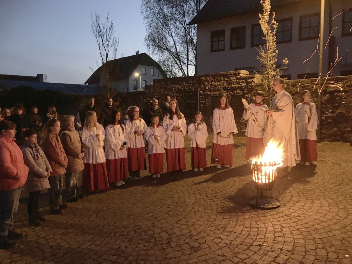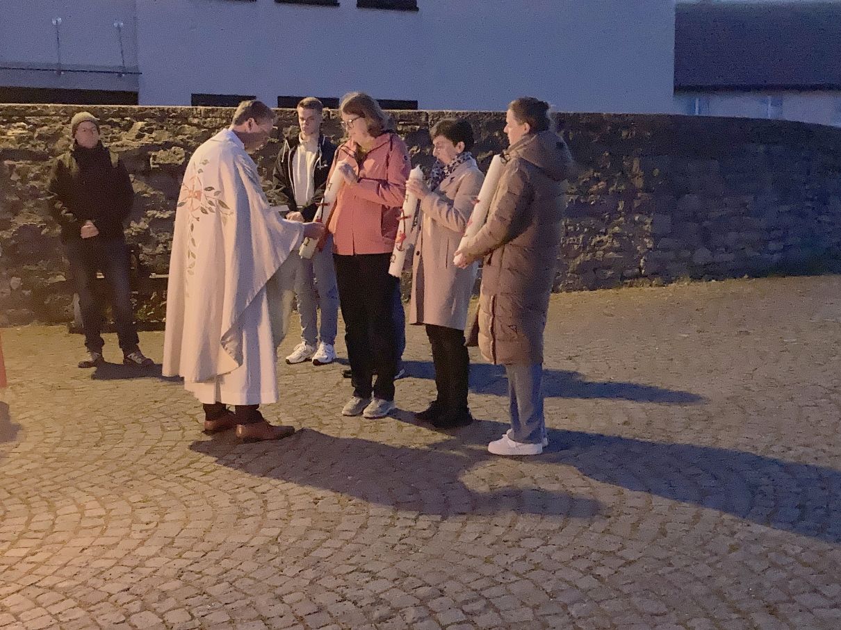 Einen feierlichen Auferstehungsgottesdienst feierten die Gläubigen mit Pfarrer Andreas Matthäi in der Stiftskirche in Rasdorf. Am frühen Morgen um 5.30 Uhr wurde die Osterkerze gesegnet und am lodernden Feuer entzündet. „Christus gestern und heute, Anfang und Ende, Alpha und Omega, sein ist die Zeit und die Ewigkeit, sein ist die Macht und die Herrlichkeit.“ In die Kreuzbalken und deren Schnittpunkt wurden fünf Weihrauchkörner mit den Worten eingefügt: „Durch deine heiligen Wunden, die leuchten in Herrlichkeit, behüte uns und bewahre uns Christus der Herr, Amen.“ Der langsam dämmernde Tag und der beginnende Gesang der ersten Vögel unterstrich in beeindruckender Weise das Ostergeheimnis. Jesus Christus ist wahrhaft von den Toten auferstanden – Halleluja. Danach zogen die Gläubigen durch den Kreuzgang in die dunkle Kirche, die beim „Lumen Christi- Deo gratias“ und dem Entzünden der Kerzen der Gottesdienstteilnehmer sich immer mehr erhellte. Nach dem Gloria erschallten die Glocken wieder und die Kirche erstrahlte in hellem Lampenlicht. Neu war, dass wegen Ermangelung eines Organisten/ Organistin die Osterlieder am Keyboard und mit der Gitarre begleitet wurden. Pfarrer Andreas Matthäi dankte den Küsterinnen, Messdienerinnen und Messdienern und allen Aktiven, die sich in die Vorbereitung und Durchführung des Gottesdienstes eingebracht hatten und den Gläubigen für ihr kommen. Er wünschte allen ein frohes und gesengtes Osterfest. Den Dank begleiteten die Teilnehmenden mit herzlichem Applaus.