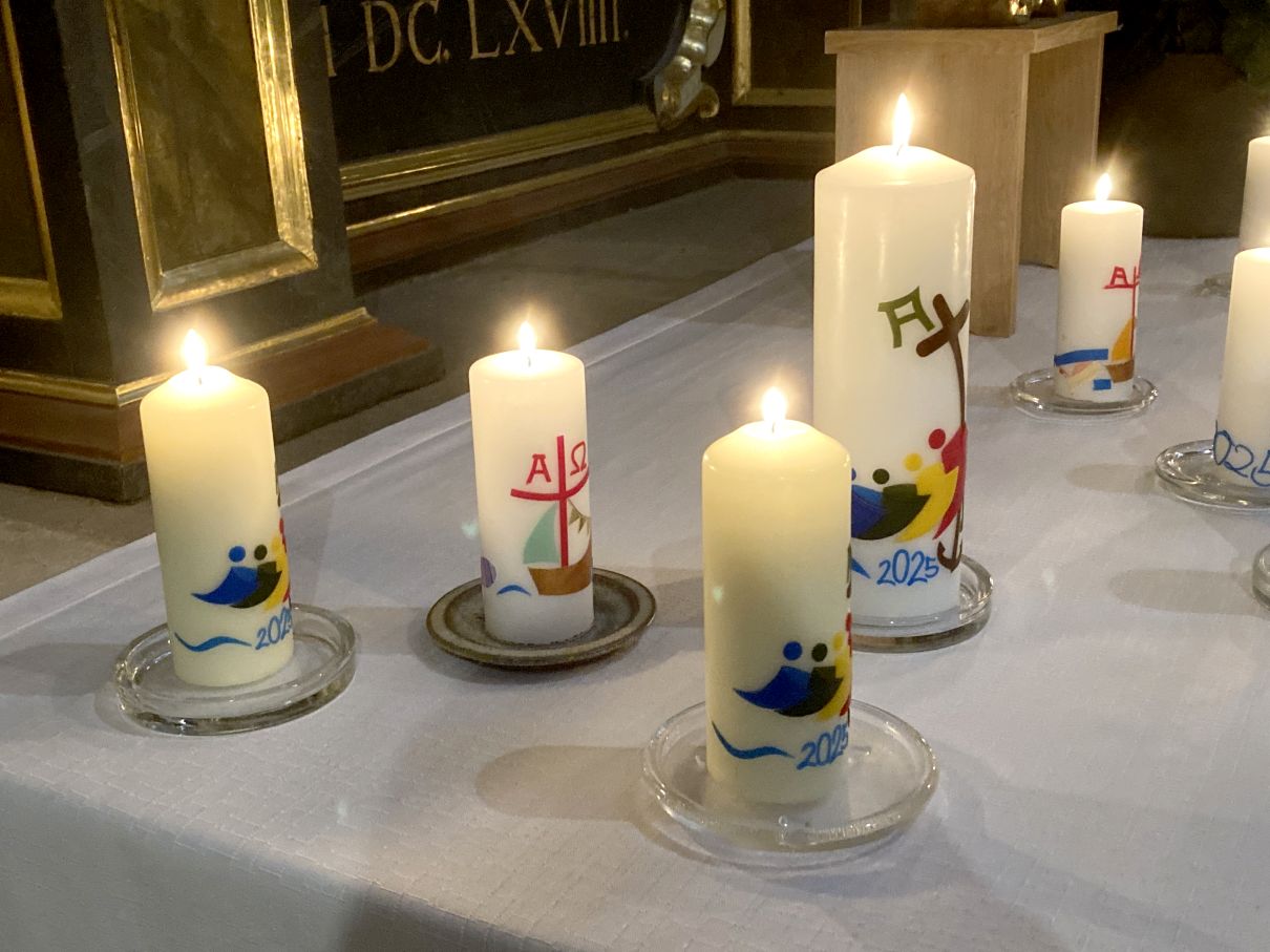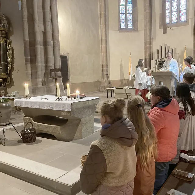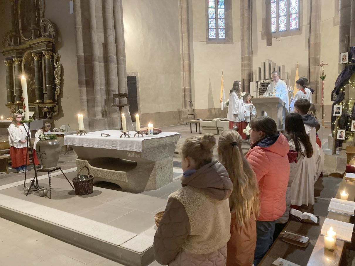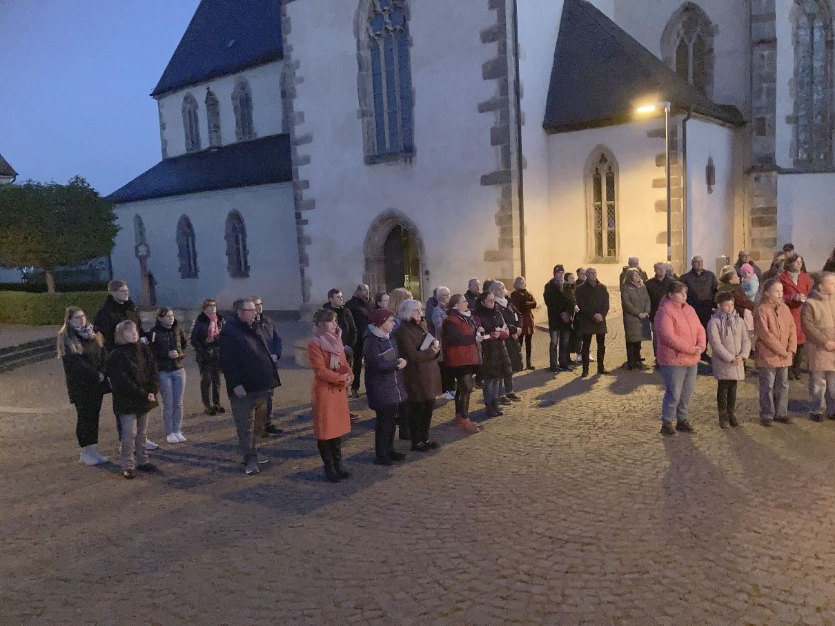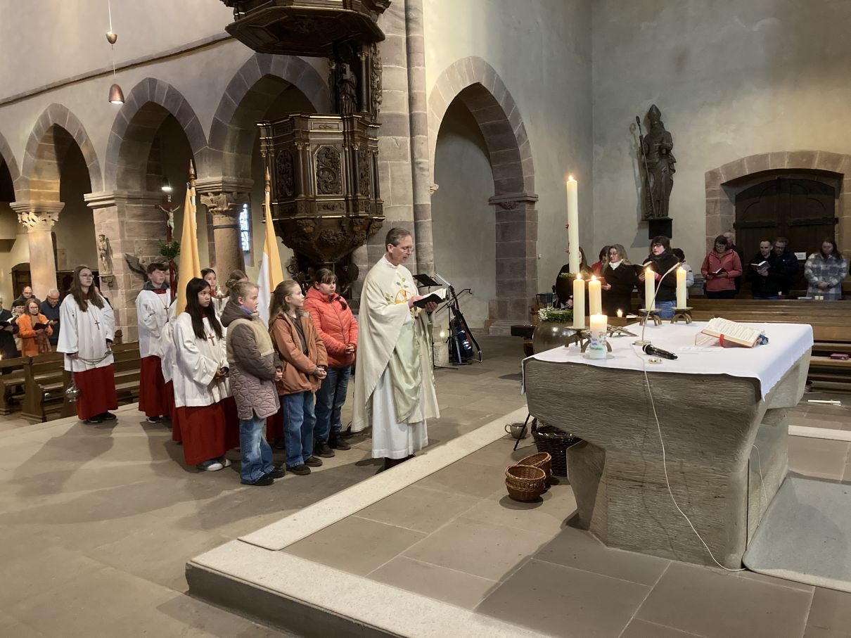 Einen feierlichen Auferstehungsgottesdienst feierten die Gläubigen mit Pfarrer Andreas Matthäi in der Stiftskirche in Rasdorf. Am frühen Morgen um 5.30 Uhr wurde die Osterkerze gesegnet und am lodernden Feuer entzündet. „Christus gestern und heute, Anfang und Ende, Alpha und Omega, sein ist die Zeit und die Ewigkeit, sein ist die Macht und die Herrlichkeit.“ In die Kreuzbalken und deren Schnittpunkt wurden fünf Weihrauchkörner mit den Worten eingefügt: „Durch deine heiligen Wunden, die leuchten in Herrlichkeit, behüte uns und bewahre uns Christus der Herr, Amen.“ Der langsam dämmernde Tag und der beginnende Gesang der ersten Vögel unterstrich in beeindruckender Weise das Ostergeheimnis. Jesus Christus ist wahrhaft von den Toten auferstanden – Halleluja. Danach zogen die Gläubigen durch den Kreuzgang in die dunkle Kirche, die beim „Lumen Christi- Deo gratias“ und dem Entzünden der Kerzen der Gottesdienstteilnehmer sich immer mehr erhellte. Nach dem Gloria erschallten die Glocken wieder und die Kirche erstrahlte in hellem Lampenlicht. Neu war, dass wegen Ermangelung eines Organisten/ Organistin die Osterlieder am Keyboard und mit der Gitarre begleitet wurden. Pfarrer Andreas Matthäi dankte den Küsterinnen, Messdienerinnen und Messdienern und allen Aktiven, die sich in die Vorbereitung und Durchführung des Gottesdienstes eingebracht hatten und den Gläubigen für ihr kommen. Er wünschte allen ein frohes und gesengtes Osterfest. Den Dank begleiteten die Teilnehmenden mit herzlichem Applaus.
