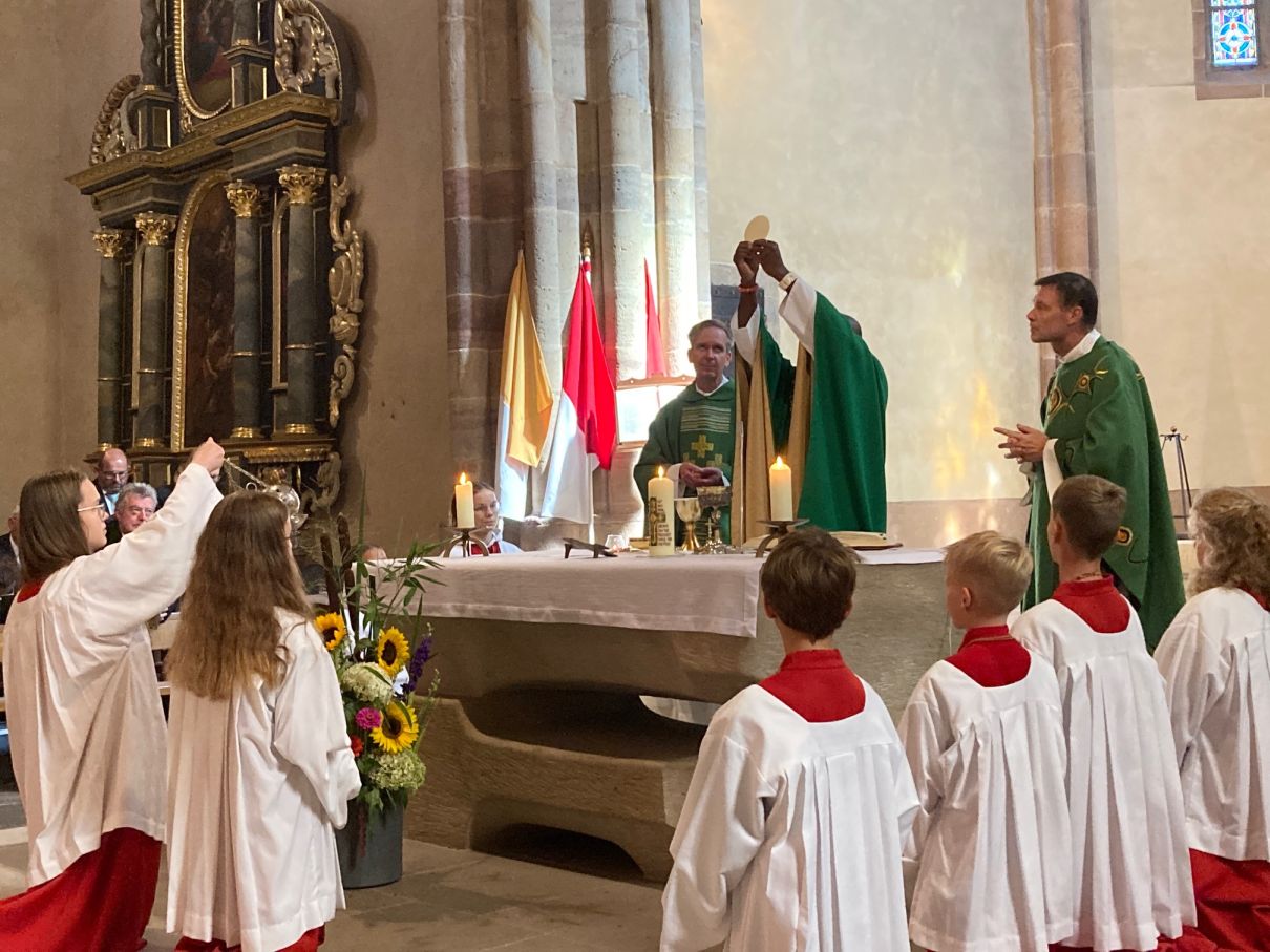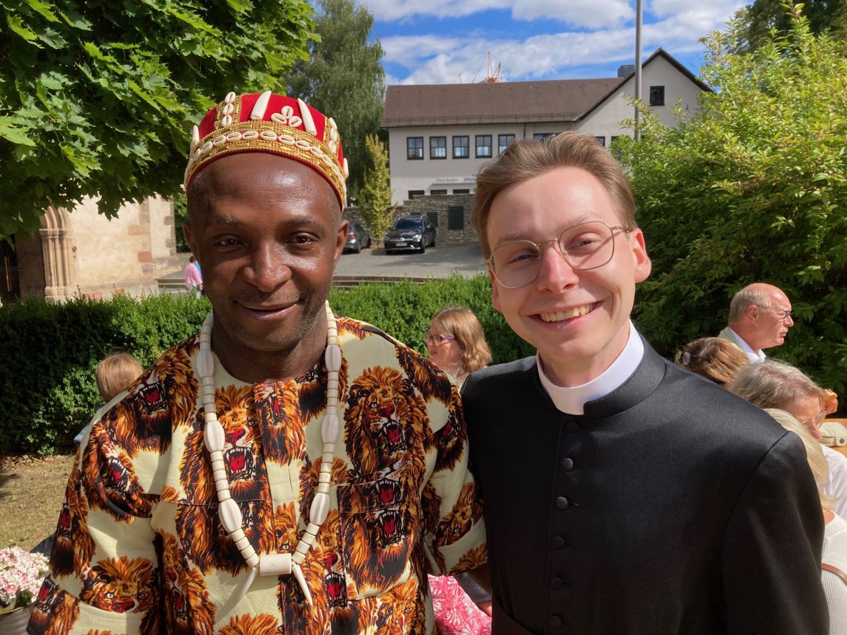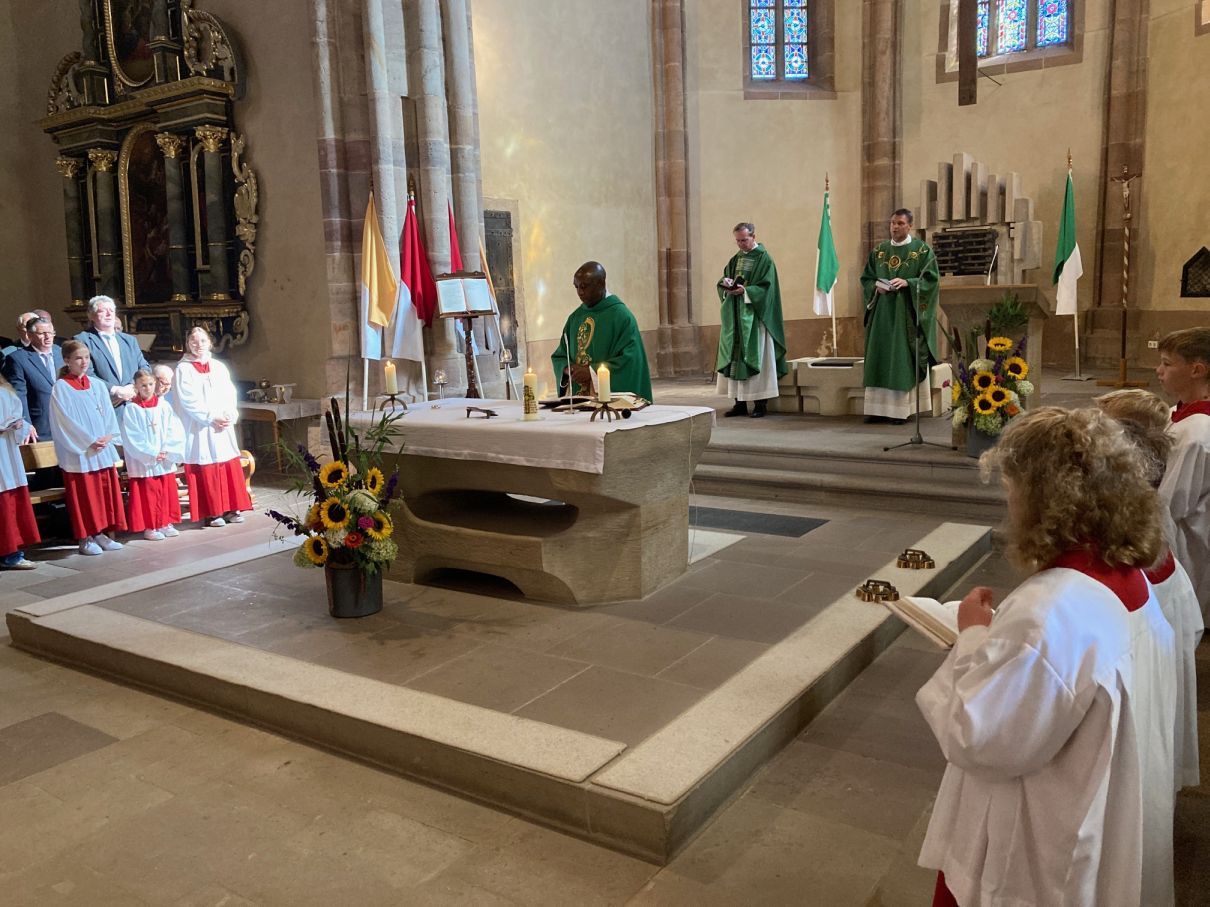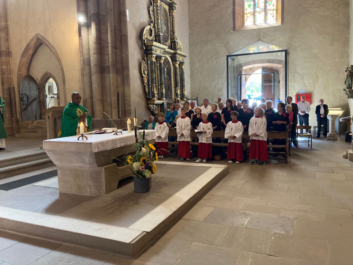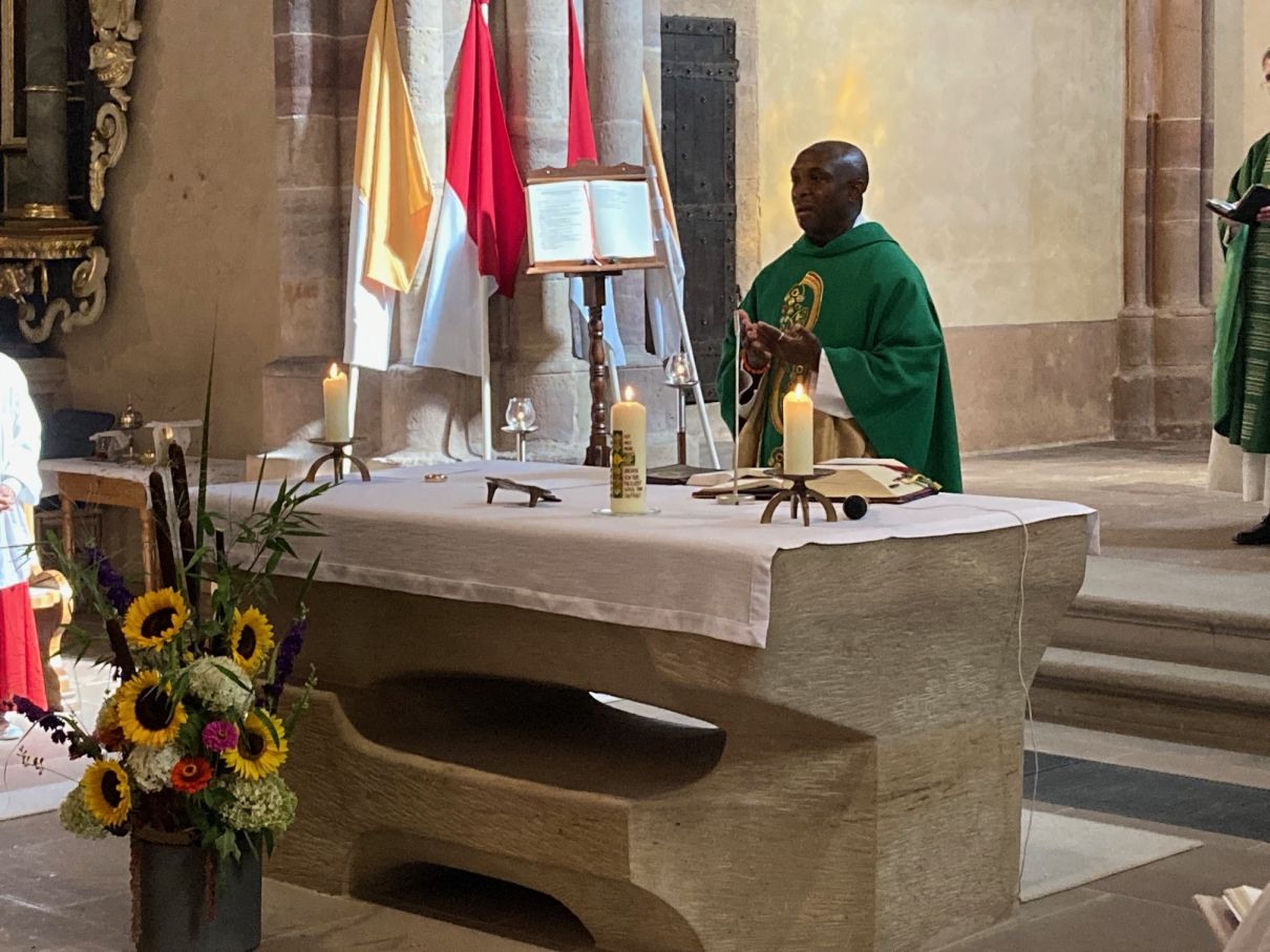 Mit einem festlichen Gottesdienst in der Stiftskirche in Rasdorf beging Pfarrer Aloysius Ndiukwu in Konzelebration mit den Pfarrern Markus Günther und Andreas Matthäi sein Silbernes Priesterjubiläum. Am Sonntag zuvor hatte er in Borsch, wo er tätig gewesen war, mit einem großen Fest und vielen befreundeten Priestern Abschied gefeiert. Leitender Pfarrer Markus Günther begrüßte Pfarrer Aloysius herzlich als neues bereicherndes Mitglied im Pastoralverbund Hessisches Kegelspiel zu den Heiligen 14 Nothelfern. In Anlehnung an das Sonntagevangelium betonte Festprediger Pfarrer Andreas Matthäi, dass er jetzt seinen neuen Platz eingenommen habe. Der Festgottesdienst in der Stiftskirche wurde musikalisch vom Gemischten Chor Ufhausen, verstärkt durch Sängerinnen und Sänger aus Buttlar und Soisdorf (Dirigent Winfried Rohm), sowie dem Männergesangverein Borsch und Rasdorf (Dirigentin Dorothe Abel-Brehl) mitgestaltet. An der Orgel spielte Michael Heller, Buttlar. Nach dem Gottesdienst hatte Pfarrer Aloysius zur Feier mit nigerianischem Gebäck, Würstchen und Getränken in den Vorgarten beim Rasdorfer Pfarrhaus eingeladen. Dort bestand auch die Möglichkeit, mit Pfarrer Aloysius, der sich traditionell gekleidet hatte, ins Gespräch zu kommen und ihn näher kennen zulernen. Pfarrer Aloysius bedankte sich bei allen, die ihn beim Ausrichten des Einführungsgottesdienstes unterstützt hatten, besonders beim Verwaltungsrat, der für das Stellen der Bänke und Tische und für die Bewirtung nach dem Gottesdienst zuständig war.