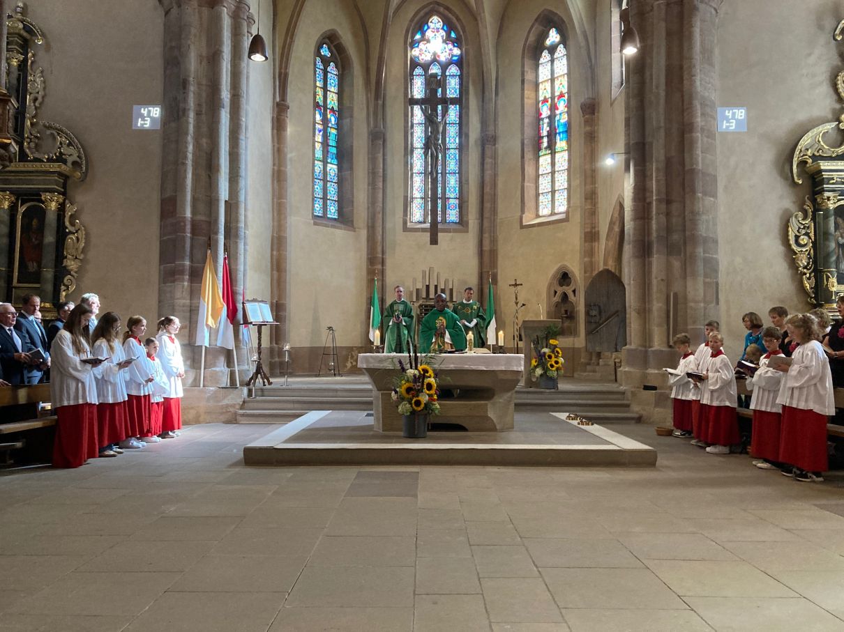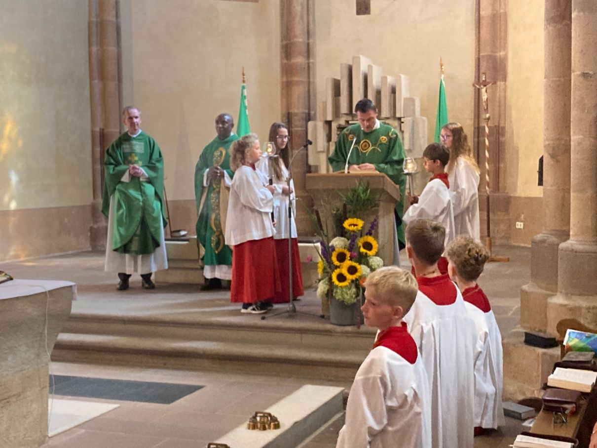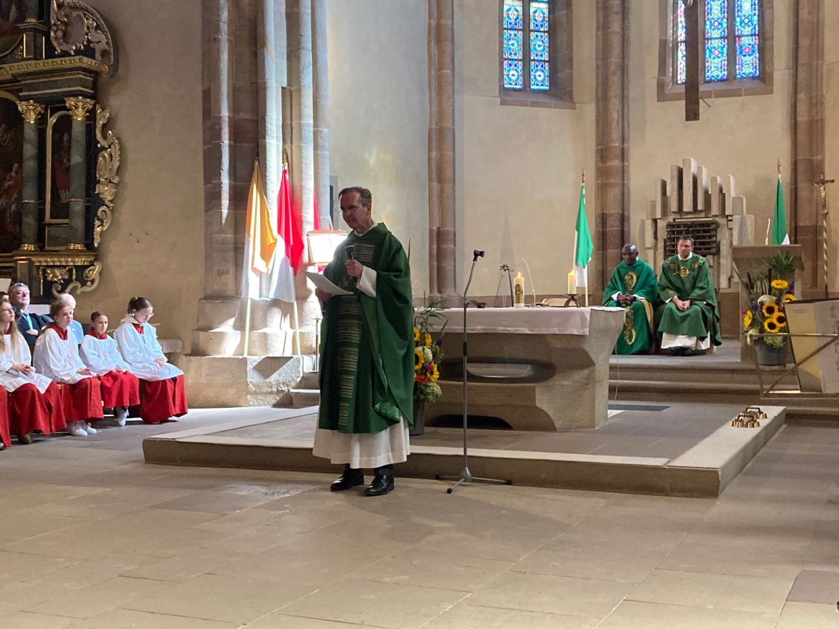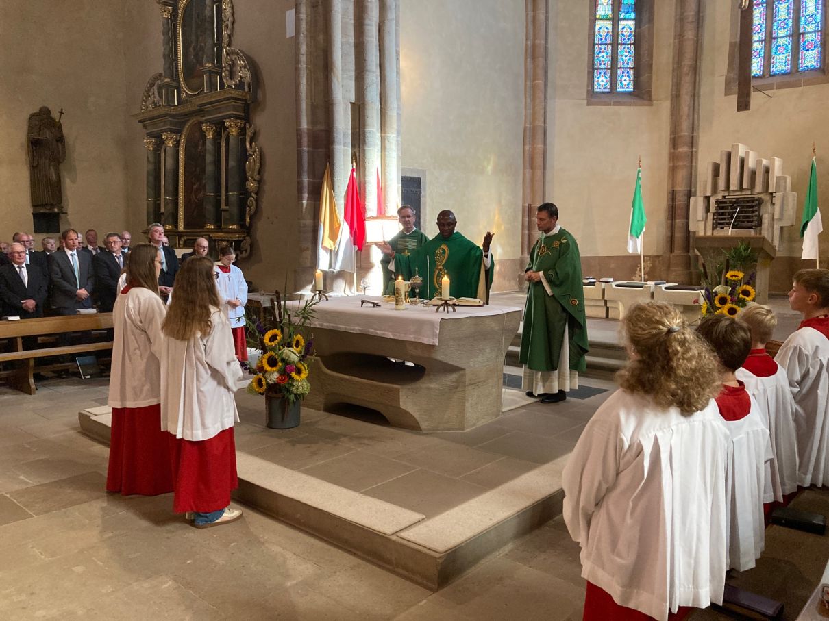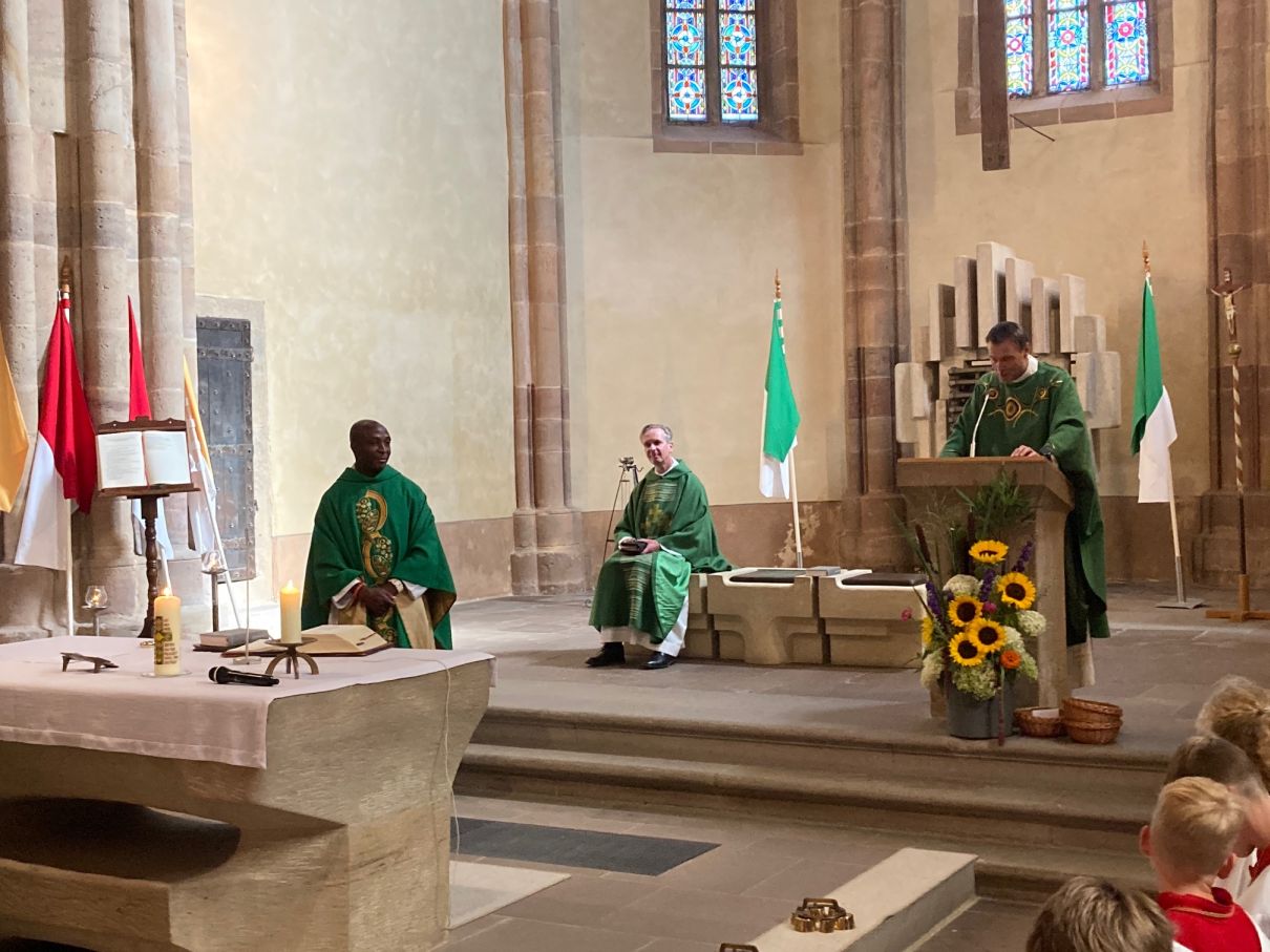 Mit einem festlichen Gottesdienst in der Stiftskirche in Rasdorf beging Pfarrer Aloysius Ndiukwu in Konzelebration mit den Pfarrern Markus Günther und Andreas Matthäi sein Silbernes Priesterjubiläum. Am Sonntag zuvor hatte er in Borsch, wo er tätig gewesen war, mit einem großen Fest und vielen befreundeten Priestern Abschied gefeiert. Leitender Pfarrer Markus Günther begrüßte Pfarrer Aloysius herzlich als neues bereicherndes Mitglied im Pastoralverbund Hessisches Kegelspiel zu den Heiligen 14 Nothelfern. In Anlehnung an das Sonntagevangelium betonte Festprediger Pfarrer Andreas Matthäi, dass er jetzt seinen neuen Platz eingenommen habe. Der Festgottesdienst in der Stiftskirche wurde musikalisch vom Gemischten Chor Ufhausen, verstärkt durch Sängerinnen und Sänger aus Buttlar und Soisdorf (Dirigent Winfried Rohm), sowie dem Männergesangverein Borsch und Rasdorf (Dirigentin Dorothe Abel-Brehl) mitgestaltet. An der Orgel spielte Michael Heller, Buttlar. Nach dem Gottesdienst hatte Pfarrer Aloysius zur Feier mit nigerianischem Gebäck, Würstchen und Getränken in den Vorgarten beim Rasdorfer Pfarrhaus eingeladen. Dort bestand auch die Möglichkeit, mit Pfarrer Aloysius, der sich traditionell gekleidet hatte, ins Gespräch zu kommen und ihn näher kennen zulernen. Pfarrer Aloysius bedankte sich bei allen, die ihn beim Ausrichten des Einführungsgottesdienstes unterstützt hatten, besonders beim Verwaltungsrat, der für das Stellen der Bänke und Tische und für die Bewirtung nach dem Gottesdienst zuständig war.