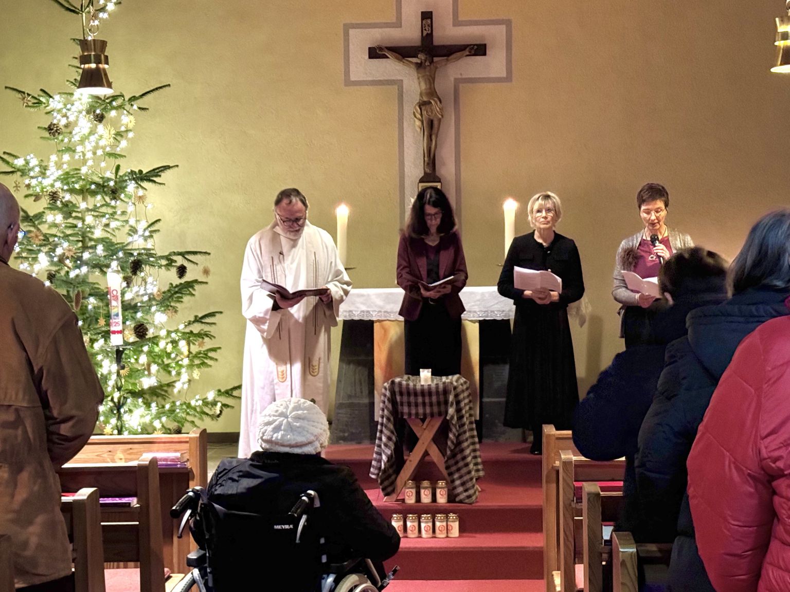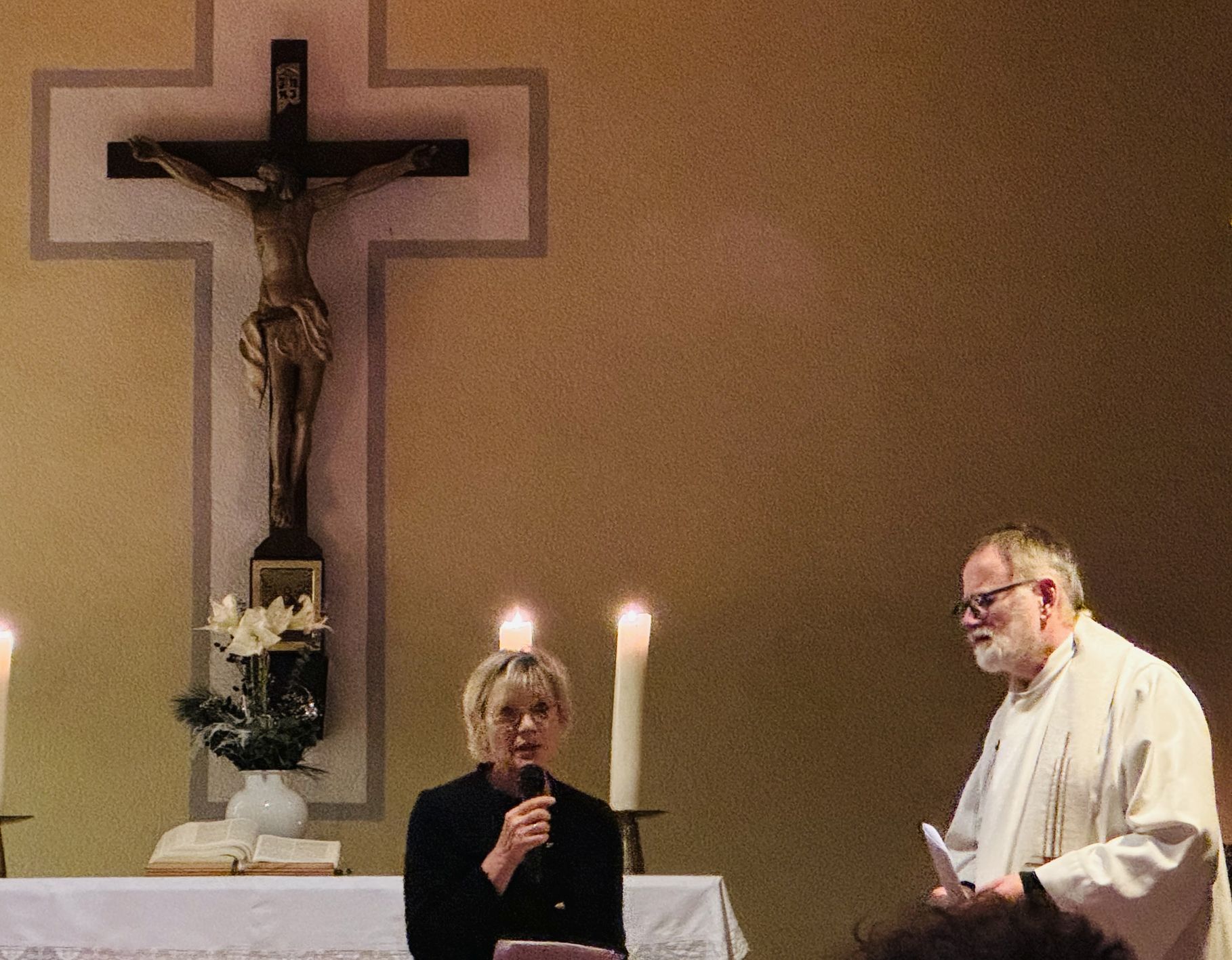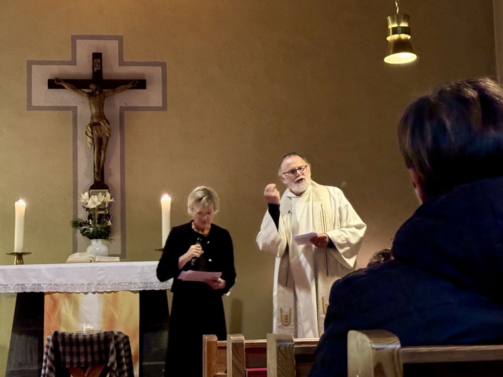 Einen reichhaltigen Rückblick und auch viel Stoff zum Nachdenken hat am frühen Silvesterabend der ökumenische Jahresabschlussgottesdienst in Eiterfeld den versammelten Christen angeboten. In der gut gefüllten Kreuzkirche trugen der evangelische Pfarrer Karl Gruber und die katholische Gemeindereferentin Maria-Martina Fischer gemeinsam zusammen, welche zentralen Ereignisse das scheidende Jahr bestimmt haben. Für die evangelische Gemeinde in Eiterfeld stand auf lokaler Ebene vieles im Zeichen des 70-jährigen Jubiläums ihrer Kirche, das mit verschiedenen Veranstaltungen gefeiert worden war. Der katholische Pastoralverbund hat mit Markus Günther einen neuen leitenden Pfarrer sowie Andreas Matthäi und Dr. Aloysius Ndiukwu als mitarbeitende Priester willkommen geheißen und die Priesterweihe von Kaplan Marcel Krawietz fröhlich mitgefeiert. Aber auch sehr persönliche Themen kamen zur Sprache, so zum Beispiel die Krebserkrankung von Pfarrer Gruber, der sich selbst, so erzählte er, das Feiern des Jahresabschlusses in seiner Kirche als Ziel gesetzt hatte. „Siehe, ich mache alles neu!“ – dieser zentrale Satz aus der Offenbarung des Johannes stand als Jahreslosung 2026 im Mittelpunkt der Dialogpredigt. Dieses Wort „Neu“ sei gleichzeitig ermutigend und herausfordernd, denn es beinhalte sowohl das hoffnungsvolle Neu-Anfangen wie das schwierigere Loslassen, konstatierte Gemeindereferentin Maria-Martina Fischer. Sie stellte sich und allen Anwesenden gleich zu Beginn die Frage: „Will ich das wirklich?“ Und Pfarrer Gruber knüpfte mit weiteren Fragen an, die zur Selbstreflexion anregen sollten: „Will ich mich von alten Gewohnheiten lösen?“ oder auch „Will ich meinen Reichtum gegen Armut tauschen?“. Anhand konkreter, authentischer Erfahrungen aus dem eigenen Leben – ernste Erkrankungen oder der unerwartete Tod eines nahen Angehörigen – und im Blick auf eine von Kriegen und Unsicherheit gekennzeichneten Weltlage zeigten die beiden Konzelebranten auf, dass Christen sich trotz ständiger Umwälzungen auf etwas verlassen können. Gottes Verheißung, die mit dem Kind in der Krippe Mensch wurde, eröffnet eine mutmachende Perspektive, aus der heraus sich der Einzelne für Veränderungen zum Guten einsetzen kann.