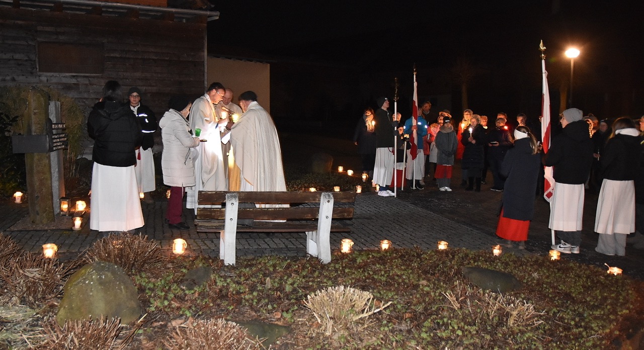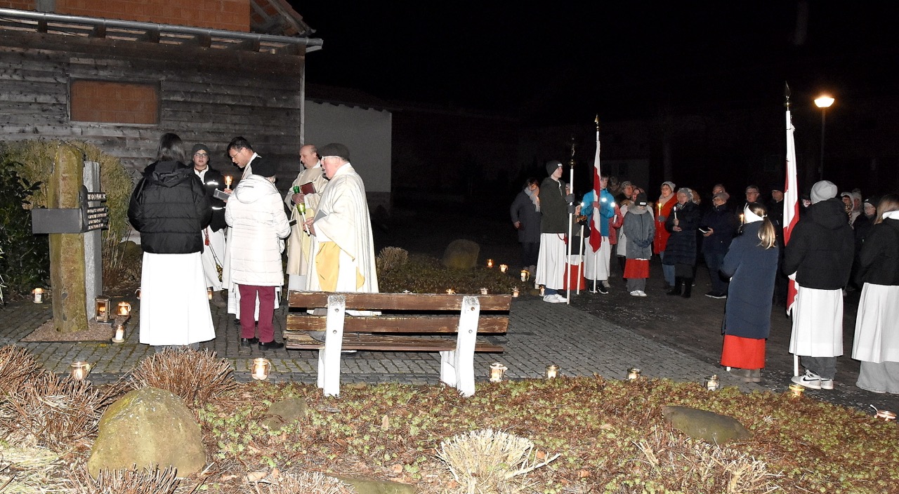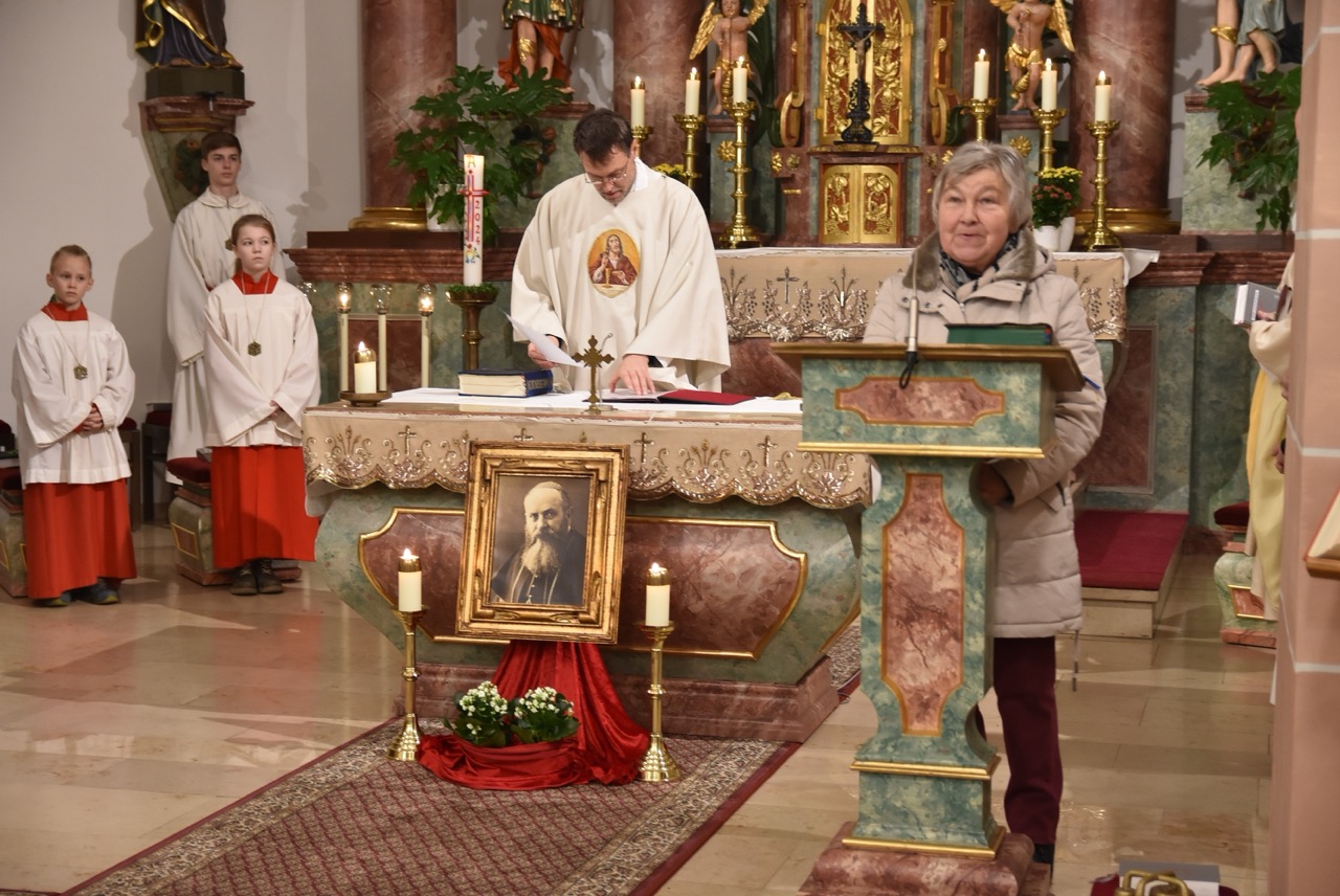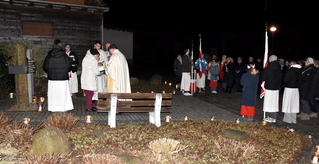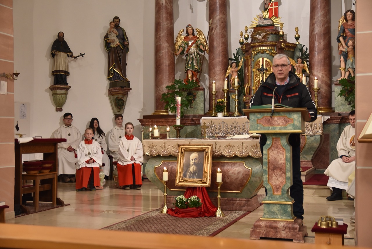 Nach der Eucharistiefeier, bei der Elisabeth Peter die Orgel spielte, lud Hildegard Sondergeld, Sprecherin des Pfarrgemeinderates zur Lichterprozession zum Gedenkort beim Geburtshaus von Abtbischof Bonifaz Sauer OSB ein. Zur dortigen Wortgottesfeier gehörten Gebete und Fürbitten für verfolgte Christen und den Frieden in der Welt. Außerdem verlas Martina Wolf einen sehr anrührenden Bericht über Bruder Gregor, der den Abt in der Haft begleitete. In diesem heißt es, dass der Abtbischof in einer Zelle von 4 qm, die mehr ein Käfig glich, gefangen gewesen sei. Er habe schlimmes Asthma gehabt, konnte nicht sitzen, nicht liegen, nicht schlafen und nicht essen. Viele Wunden hätten ihm Schmerzen bereitet. Im November 1949 habe sich seine Asthmakrankheit erheblich verschlechtert und so sei er, Bruder Gregor, ihm als Hilfe und Pflege zugeteilt worden. Als der Bruder Leute um Milch oder Eier bat, habe er zur Antwort bekommen: „Früher fraßen diese Tiere gutes Futter, sie sollen dafür jetzt Not leiden“. Kurz vor seinem Tod habe der Abtbischof gesagt: „Lass mich nachhause gehen“. Am 07. Februar 1950 um 6 Uhr morgens hat Abtbischof Bonifaz Sauer OSB seine Seele dem Schöpfer zurückgegeben. Niemand der Mitgefangenen hat vom Tod erfahren. Bruder Gregor habe noch einen Monat krank durch die anstrengende Pflege in der Zelle nur auf blanken Dielen gelegen. Der Gefängnisarzt, der nach dem Tod des Bischofs nach Südkorea geflüchtet sei und sich dort mit seiner Familie taufen ließ, habe sein Wissen über den Tod von Abtbischof Bonifaz Sauer OSB und den selbstlosen Dienst von Bruder Gregor mitgeteilt. Mit dem Segen den Pfarrer Markus Günther den Teilnehmenden zusprach, endet die Feier zum 75 Todestag.