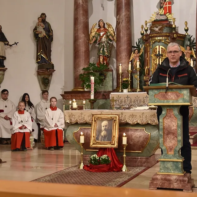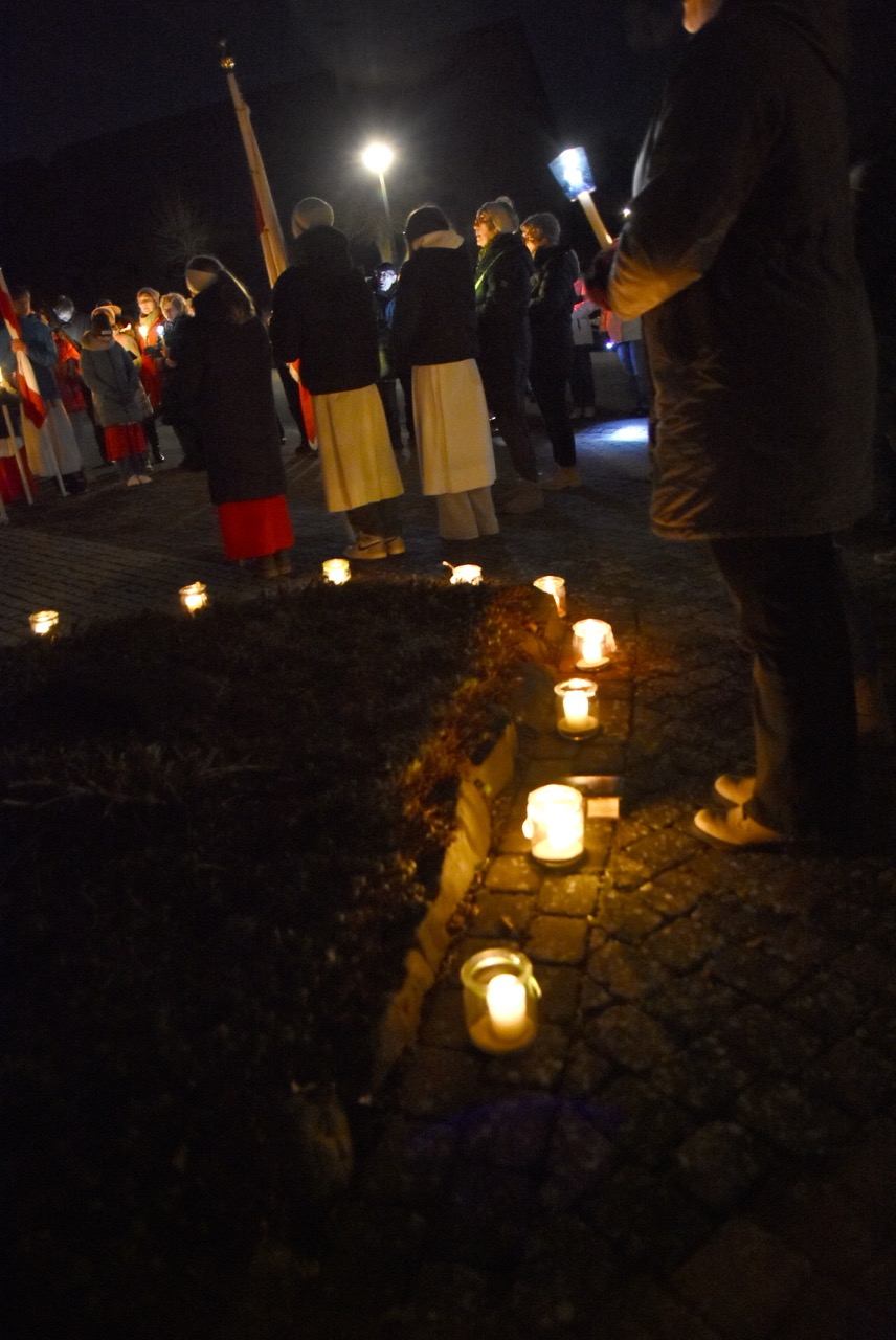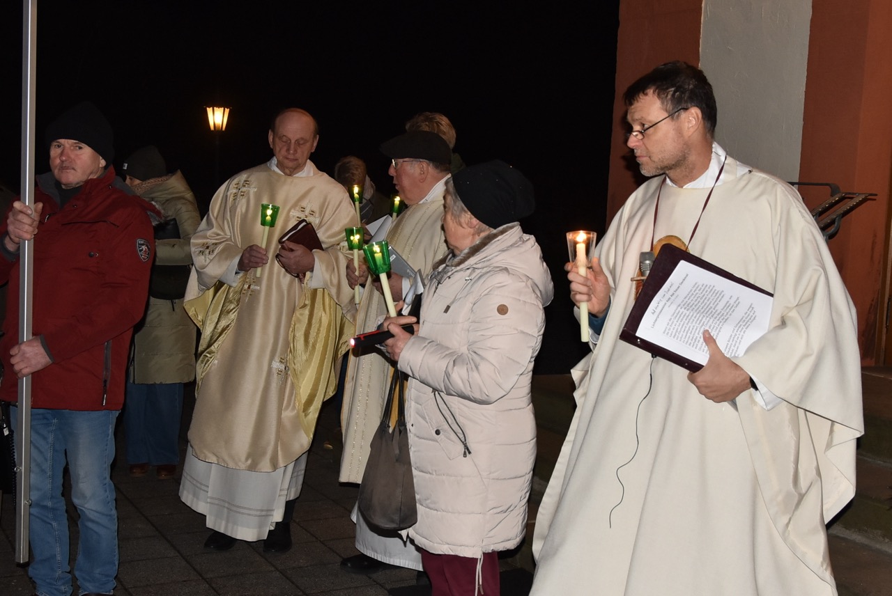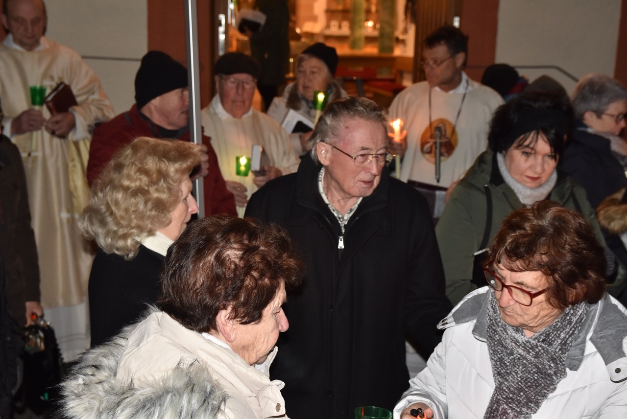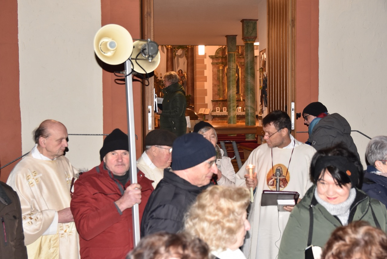 Nach der Eucharistiefeier, bei der Elisabeth Peter die Orgel spielte, lud Hildegard Sondergeld, Sprecherin des Pfarrgemeinderates zur Lichterprozession zum Gedenkort beim Geburtshaus von Abtbischof Bonifaz Sauer OSB ein. Zur dortigen Wortgottesfeier gehörten Gebete und Fürbitten für verfolgte Christen und den Frieden in der Welt. Außerdem verlas Martina Wolf einen sehr anrührenden Bericht über Bruder Gregor, der den Abt in der Haft begleitete. In diesem heißt es, dass der Abtbischof in einer Zelle von 4 qm, die mehr ein Käfig glich, gefangen gewesen sei. Er habe schlimmes Asthma gehabt, konnte nicht sitzen, nicht liegen, nicht schlafen und nicht essen. Viele Wunden hätten ihm Schmerzen bereitet. Im November 1949 habe sich seine Asthmakrankheit erheblich verschlechtert und so sei er, Bruder Gregor, ihm als Hilfe und Pflege zugeteilt worden. Als der Bruder Leute um Milch oder Eier bat, habe er zur Antwort bekommen: „Früher fraßen diese Tiere gutes Futter, sie sollen dafür jetzt Not leiden“. Kurz vor seinem Tod habe der Abtbischof gesagt: „Lass mich nachhause gehen“. Am 07. Februar 1950 um 6 Uhr morgens hat Abtbischof Bonifaz Sauer OSB seine Seele dem Schöpfer zurückgegeben. Niemand der Mitgefangenen hat vom Tod erfahren. Bruder Gregor habe noch einen Monat krank durch die anstrengende Pflege in der Zelle nur auf blanken Dielen gelegen. Der Gefängnisarzt, der nach dem Tod des Bischofs nach Südkorea geflüchtet sei und sich dort mit seiner Familie taufen ließ, habe sein Wissen über den Tod von Abtbischof Bonifaz Sauer OSB und den selbstlosen Dienst von Bruder Gregor mitgeteilt. Mit dem Segen den Pfarrer Markus Günther den Teilnehmenden zusprach, endet die Feier zum 75 Todestag.