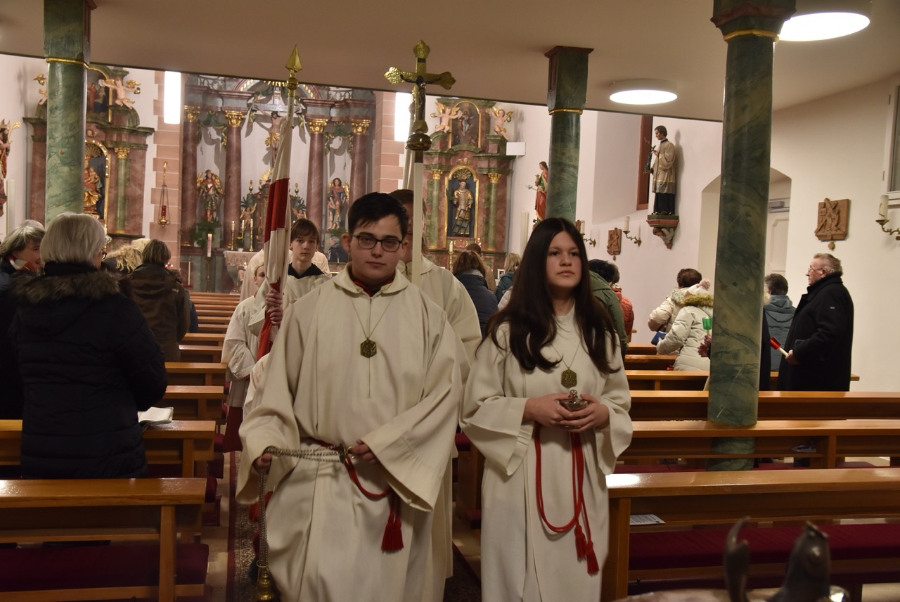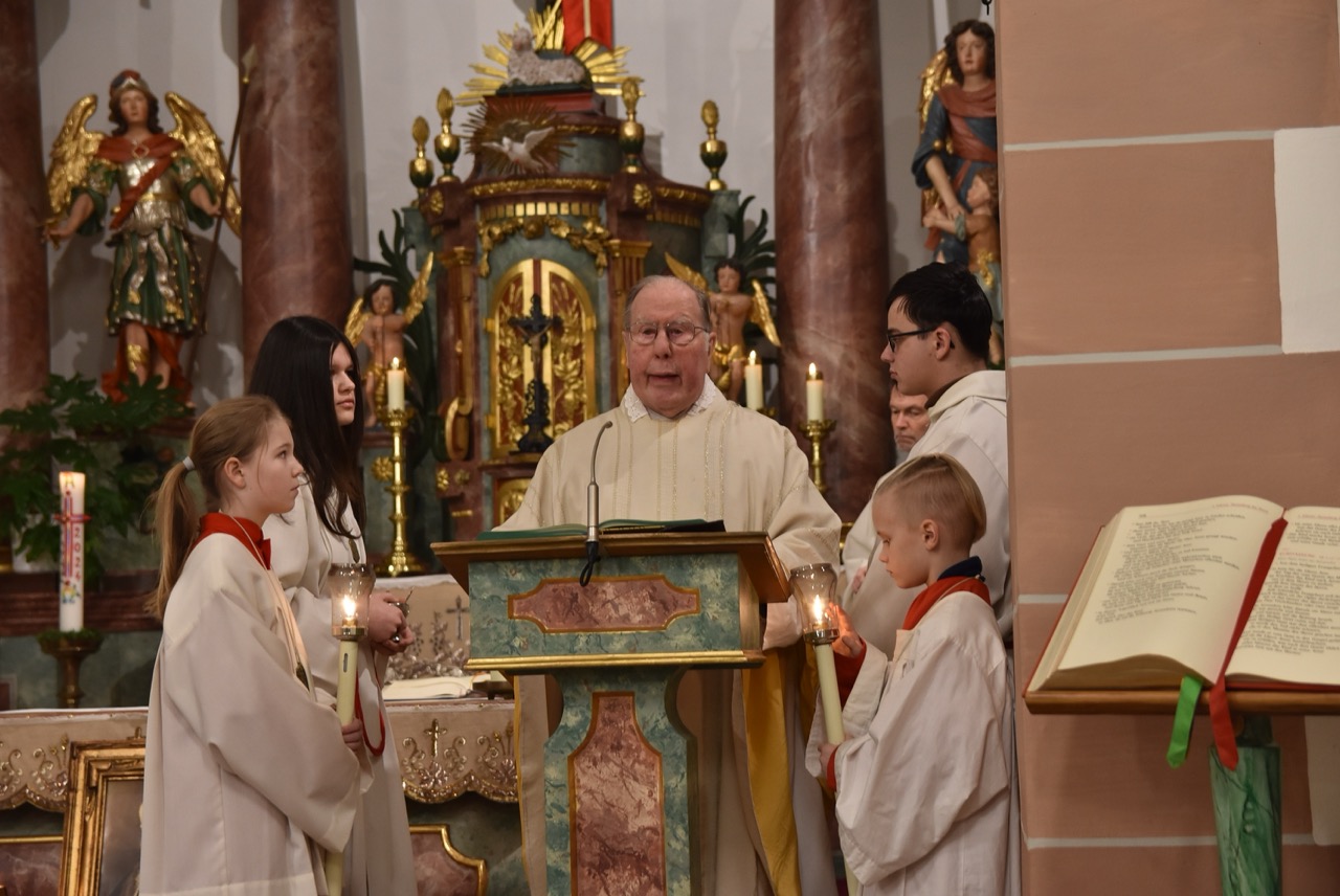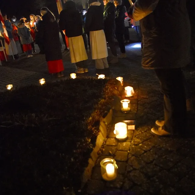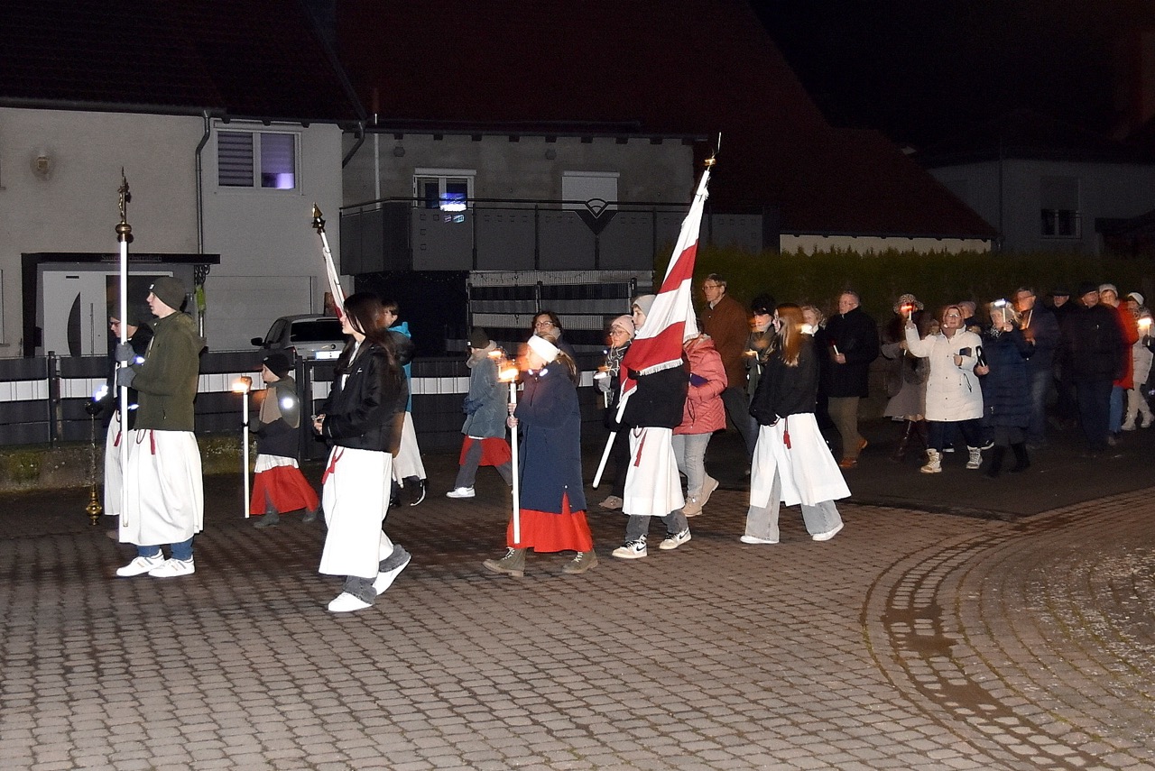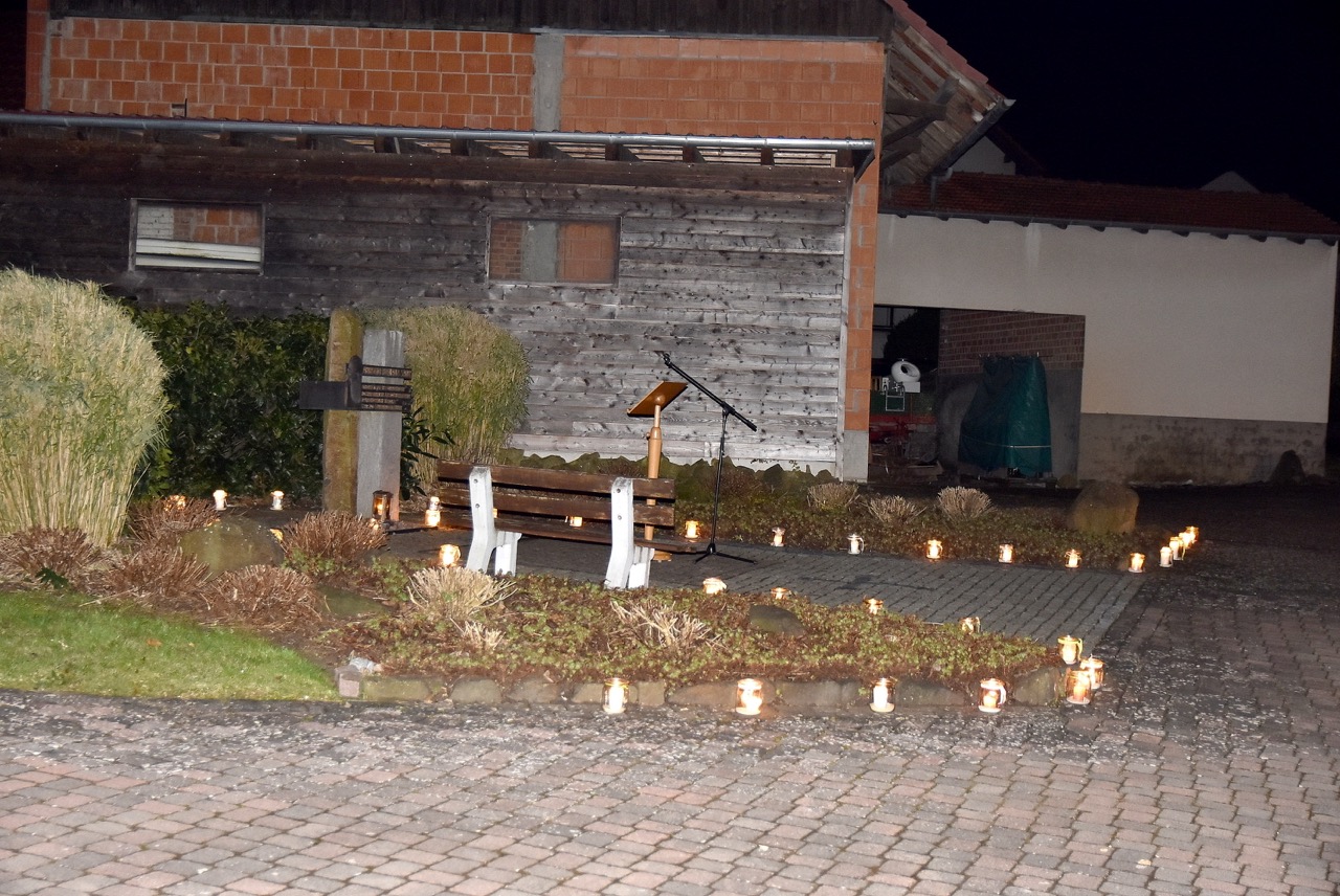 Nach der Eucharistiefeier, bei der Elisabeth Peter die Orgel spielte, lud Hildegard Sondergeld, Sprecherin des Pfarrgemeinderates zur Lichterprozession zum Gedenkort beim Geburtshaus von Abtbischof Bonifaz Sauer OSB ein. Zur dortigen Wortgottesfeier gehörten Gebete und Fürbitten für verfolgte Christen und den Frieden in der Welt. Außerdem verlas Martina Wolf einen sehr anrührenden Bericht über Bruder Gregor, der den Abt in der Haft begleitete. In diesem heißt es, dass der Abtbischof in einer Zelle von 4 qm, die mehr ein Käfig glich, gefangen gewesen sei. Er habe schlimmes Asthma gehabt, konnte nicht sitzen, nicht liegen, nicht schlafen und nicht essen. Viele Wunden hätten ihm Schmerzen bereitet. Im November 1949 habe sich seine Asthmakrankheit erheblich verschlechtert und so sei er, Bruder Gregor, ihm als Hilfe und Pflege zugeteilt worden. Als der Bruder Leute um Milch oder Eier bat, habe er zur Antwort bekommen: „Früher fraßen diese Tiere gutes Futter, sie sollen dafür jetzt Not leiden“. Kurz vor seinem Tod habe der Abtbischof gesagt: „Lass mich nachhause gehen“. Am 07. Februar 1950 um 6 Uhr morgens hat Abtbischof Bonifaz Sauer OSB seine Seele dem Schöpfer zurückgegeben. Niemand der Mitgefangenen hat vom Tod erfahren. Bruder Gregor habe noch einen Monat krank durch die anstrengende Pflege in der Zelle nur auf blanken Dielen gelegen. Der Gefängnisarzt, der nach dem Tod des Bischofs nach Südkorea geflüchtet sei und sich dort mit seiner Familie taufen ließ, habe sein Wissen über den Tod von Abtbischof Bonifaz Sauer OSB und den selbstlosen Dienst von Bruder Gregor mitgeteilt. Mit dem Segen den Pfarrer Markus Günther den Teilnehmenden zusprach, endet die Feier zum 75 Todestag.