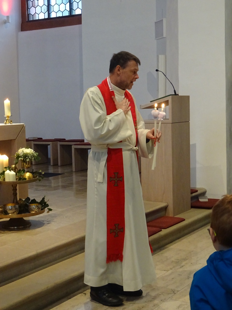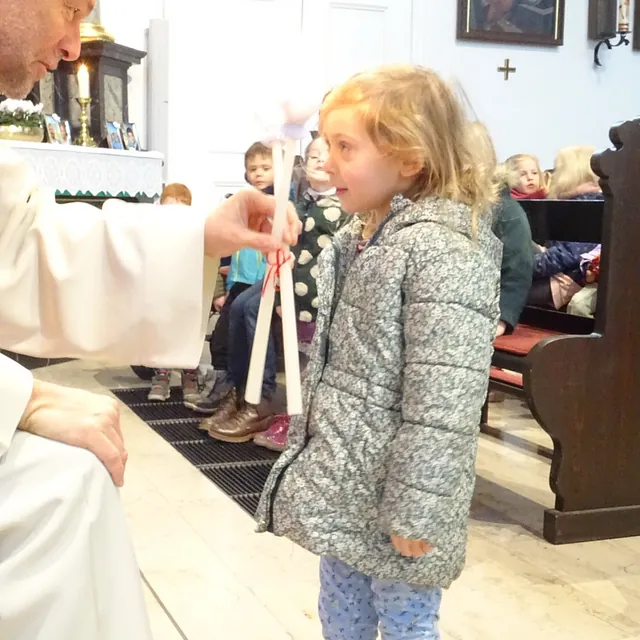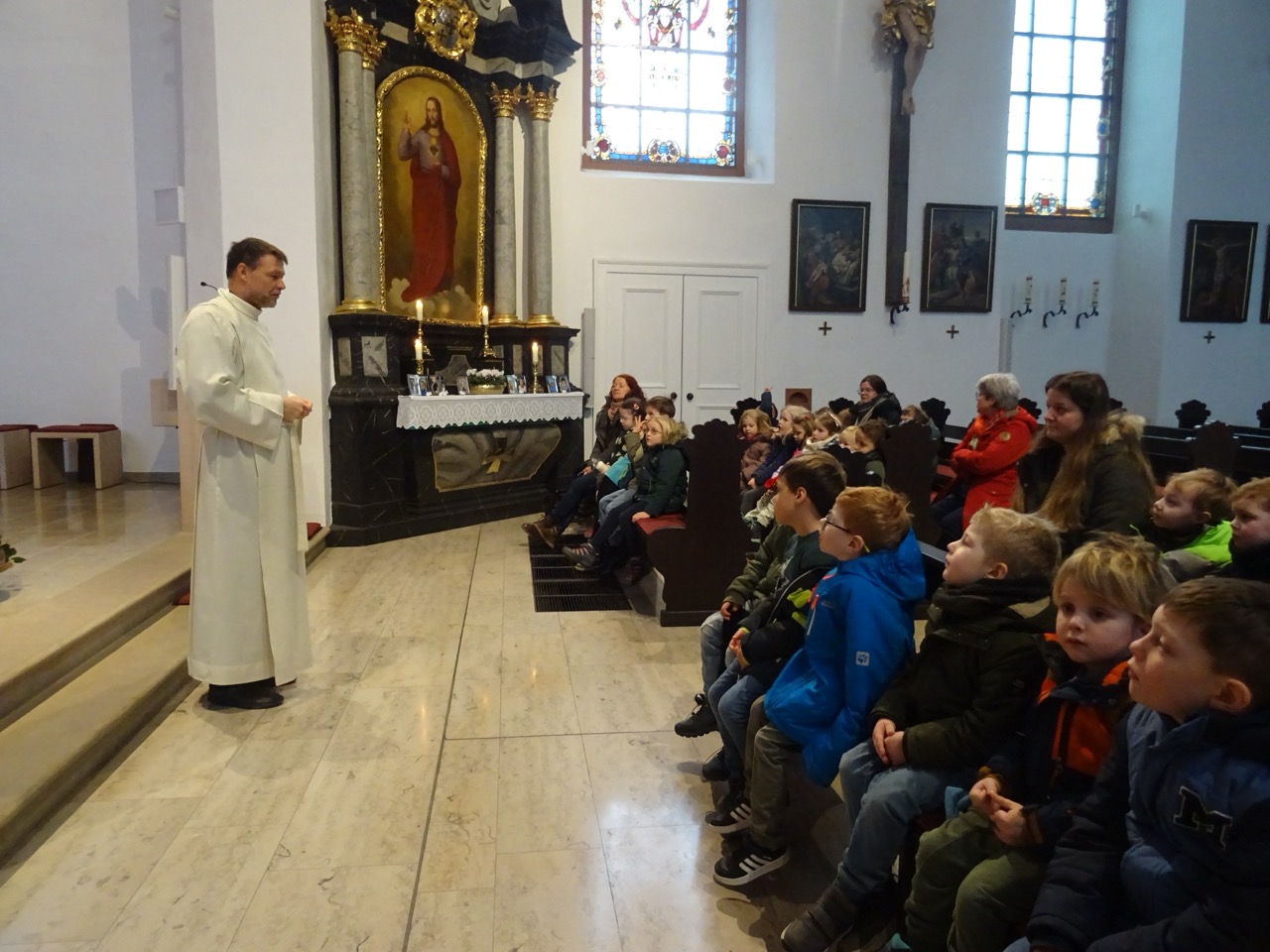 Mit Freude kamen die Kinder der katholischen Kindertagesstätte Sankt Georg mit ihren Erzieherinnen der Einladung von Herr Pfarrer Günter nach, um den Blasiussegen gespendet zu bekommen. Herr Pfarrer Günter erwartete uns nach dem Freitagsgottesdienst in der Kirche. In einer gemeinsamen Katechese wurde über das Leben und Wirken von Blasius gesprochen. Herr Pfarrer Günter war erstaunt, wieviel die Kinder schon von dem Heiligen Blasius wussten. Herr Pfarrer Günther stimmte das Lied „Gottes Liebe ist so wunderbar an“ und alle Kinder sangen mit.