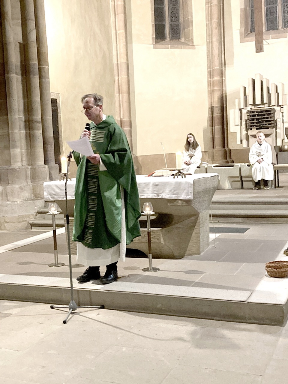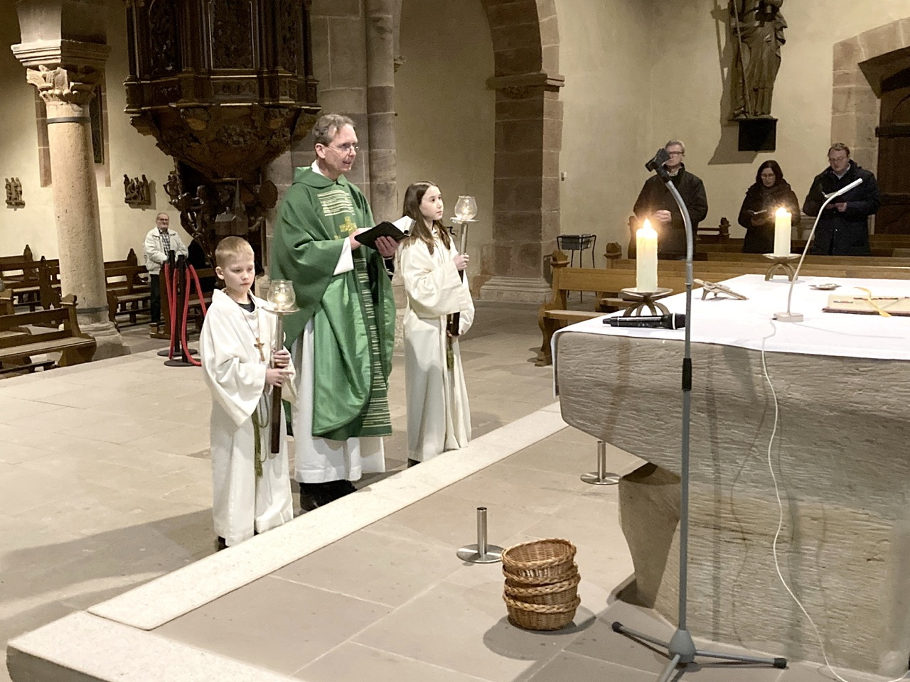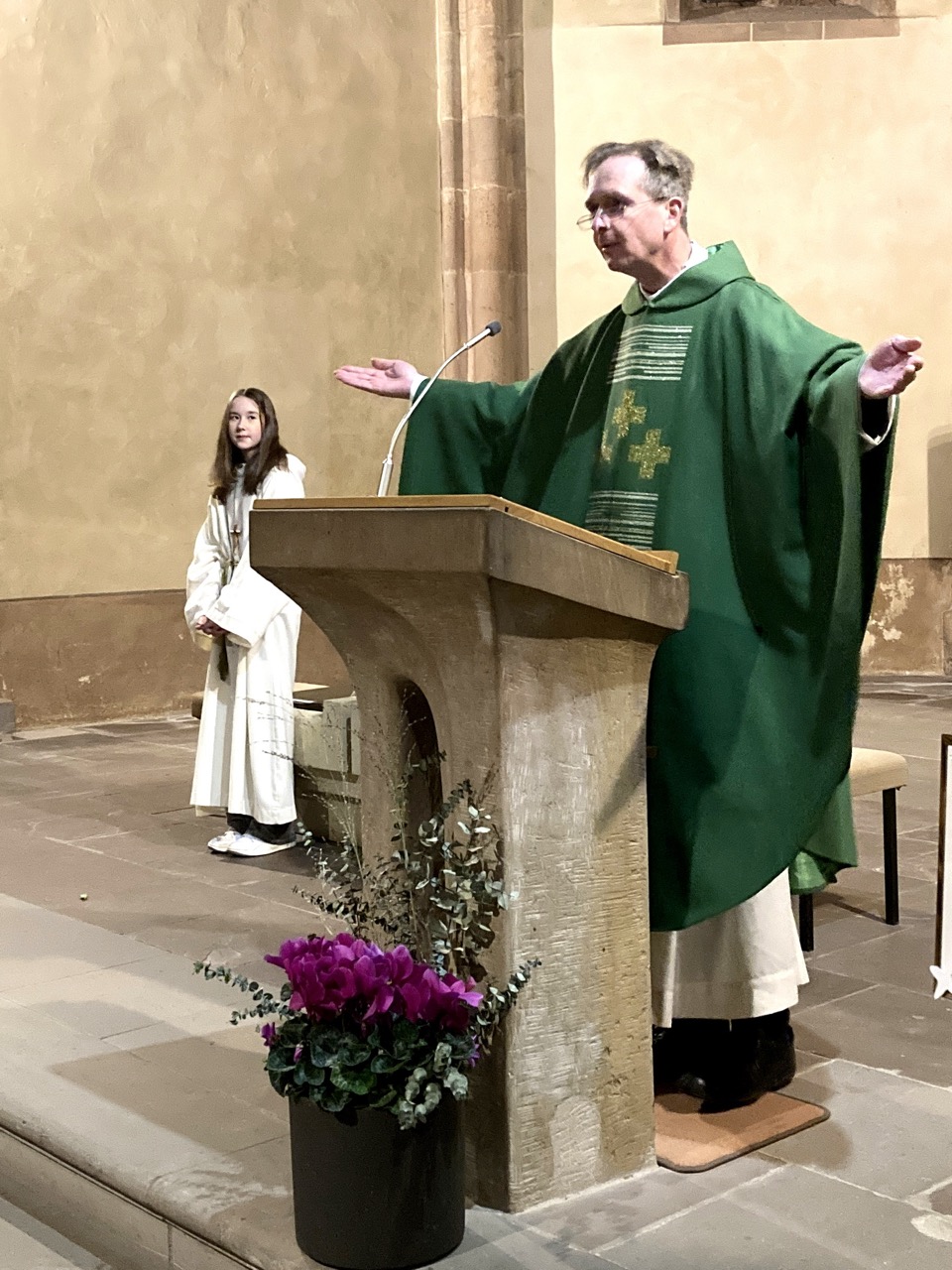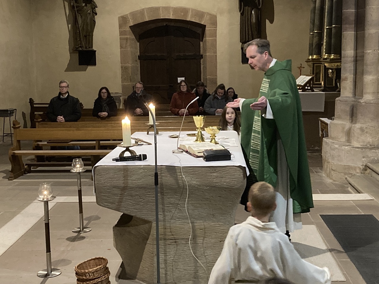 Seinen ersten Sonntagsgottesdienst als Vorabendmesse in der Stiftskirche in Rasdorf feierte Pfarrer Andreas Matthäi mit den Gläubigen am 5. Sonntag im Jahreskreis. Zuvor war er bereits zum Gottesdienst in Setzelbach, stand bei einem Requiem mit Beerdigung in Rasdorf am Altar und war auch zum Dienstaggottesdienst in Grüsselbach. Pfarrer Andreas Matthäi wohnt als mitarbeitender Priester im Pastoralverbund Hessisches Kegelspiel zu den Heiligen 14 Nothelfern im Pfarrhaus in Rasdorf. Er ist aber nicht Pfarrer von Rasdorf. Zu Beginn der Vorabendmesse stellte er sich als „der Neue“ vor. Von 1998 bis 2001 war Andreas Matthäi Kaplan in Eiterfeld, danach Pfarrer in Bad Salzschlirf und Margretenhaun. Zu Beginn seiner Predigt betonte er, dass der Ambo sehr weit von den Gottesdienstbesucherinnen und -besuchern weg sei. Er nahm deshalb das Handmikrofon und ging vor den Altar. In seiner Predigt ging er auf die Lesungen und das Evangelium des Sonntags ein. „Was macht mir Mut? Wovor habe ich Angst?“ waren zentrale Fragen. Wer als Kind oder Jugendlicher immer vorgehalten bekomme, er könne nichts auf die Reihe bringen, könne als Erwachsener kein eigenständiges Leben aufbauen. Eltern oder prägende Erwachsene könnten fordern und fördern. Beides müsse sich die Waage halten, so Andreas Matthäi. Er kam auch darauf zu sprechen, welche Unsicherheit er gehabt habe, als er sich für den Priesterberuf vorbereitet habe. Dabei habe ihm die Stelle bei Jesaja und dem Evangelium nach Lukas geholfen. Bei Jesaja heiße es, dass ein Engel Gottes ihn gereinigt habe, so dass er sagen konnte: „Hier bin ich, sende mich“. Ebenso sei es bei Simon Petrus gewesen, der im Vertrauen auf Jesus diesem sein Boot zur Verfügung gestellt habe. Letztlich habe das Erlebnis, eine große Menge Fische gefangen zu haben, ihn zur Entscheidung und zur Nachfolge geführt. Man brauche im Leben den Zuspruch „Mut tut gut“. Auch er, Pfarrer Andreas Matthäi, habe durch die Bibelstellen vom 5. Sonntag im Jahreskreis Mut bekommen, Priester zu werden. Seine Predigt endete mit der Frage: „Was macht ihnen Mut, sich dem zu stellen, was ihnen Angst macht?“ Zum Schluss des Gottesdienstes dankte er für die Mitfeier der Eucharistie.
