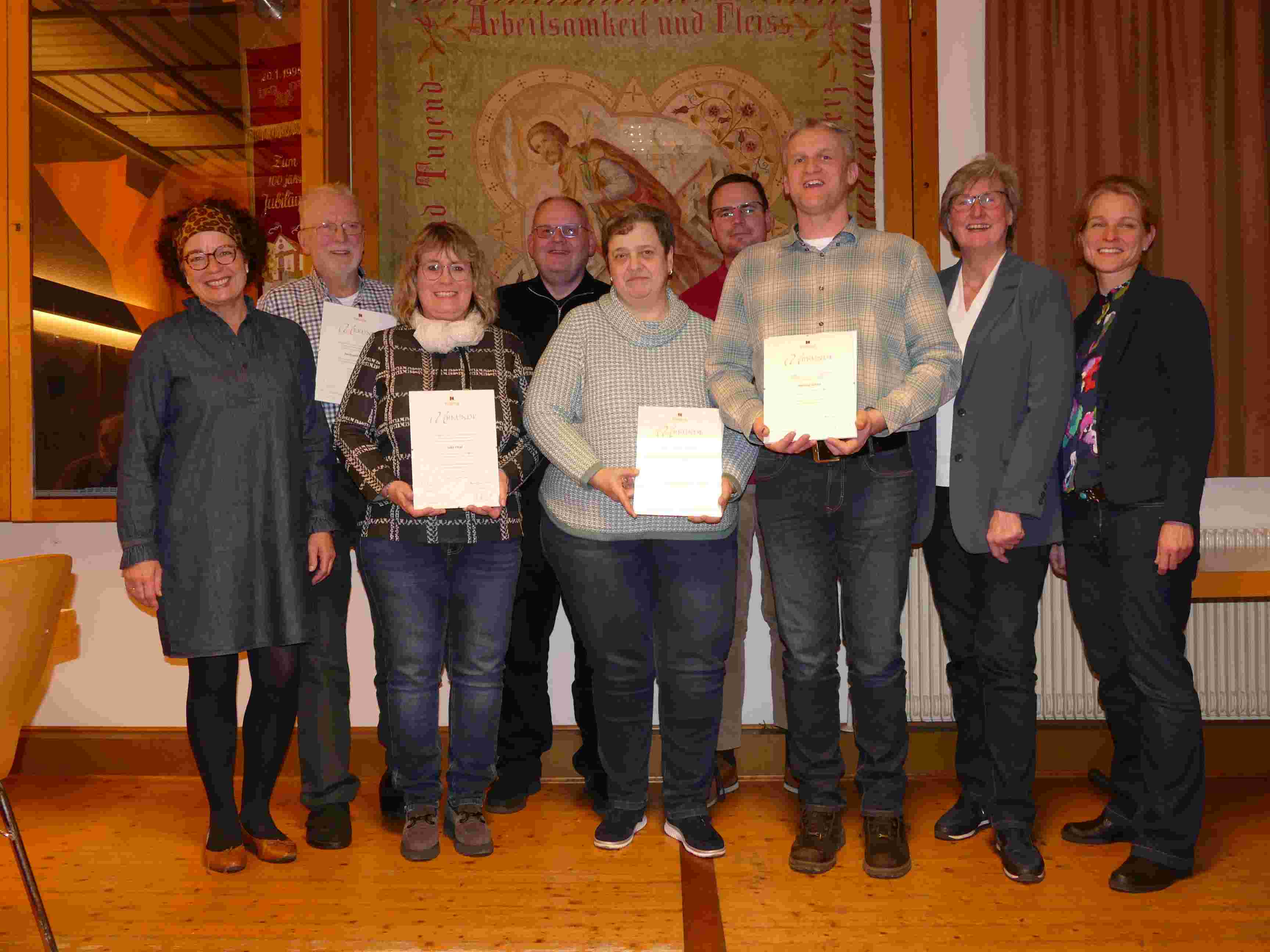 Die Geehrten zusammen mit dem Vorstandsteam: Claudia Gerhard, Ferdinand Pokorny, Silke Etzel, Pfarrer Ulrich Piesche, Gabriele Höfer, Michael Möller (Kolping-Diözesangeschäftsführer), Michael Schön, Hermia Weißmüller und Daniela Vögler (von links nach rechts).