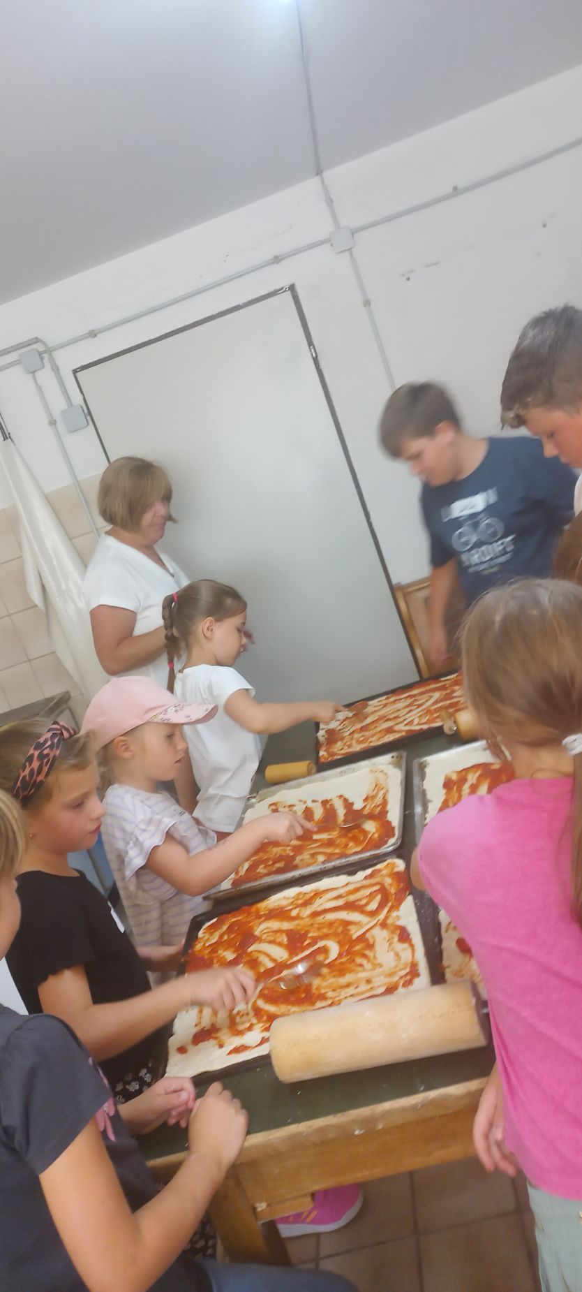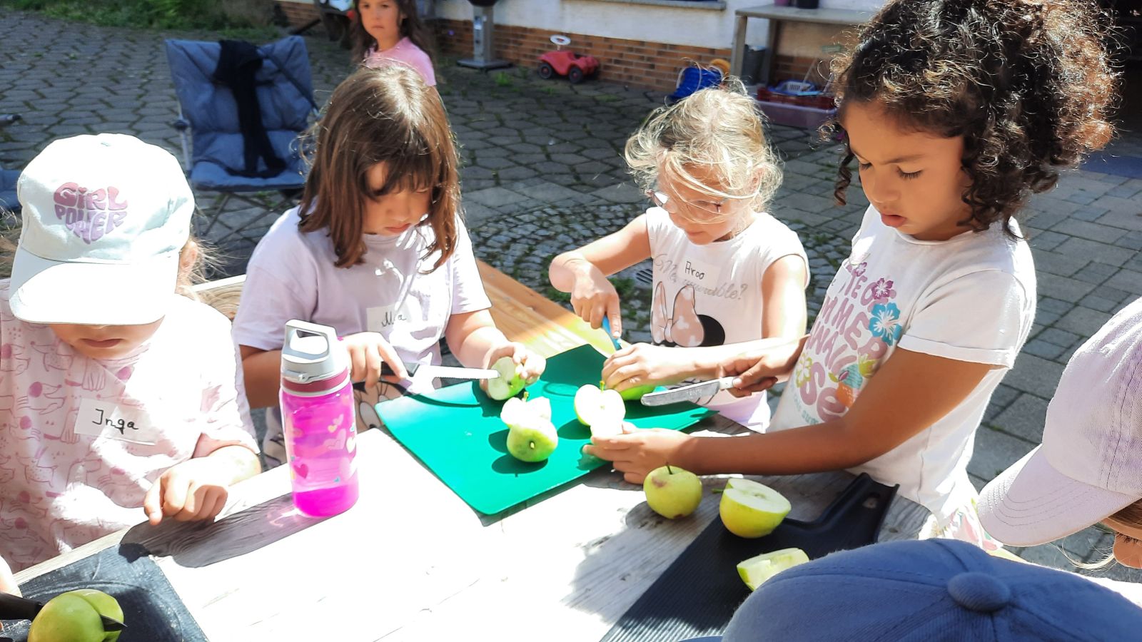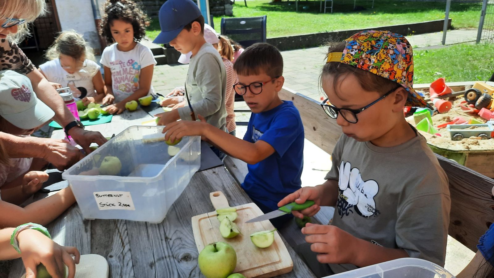 Sehr interessiert war man am riesengroßen Backofen der Klees und konnte einen Blick hinein werfen. Eifrig wurde nun - unter Anleitung - der Pizzateig auf den Blechen ausgerollt, die Zutaten für den Belag klein geschnitten und darauf verteilt. Einige Kinder waren für das Dessert zuständig. Dazu sammelte man im Obstgarten Äpfel. Diese wurden anschließend gemeinsam entkernt, geschnitten und zu einem leckeren Apfelmus gekocht.