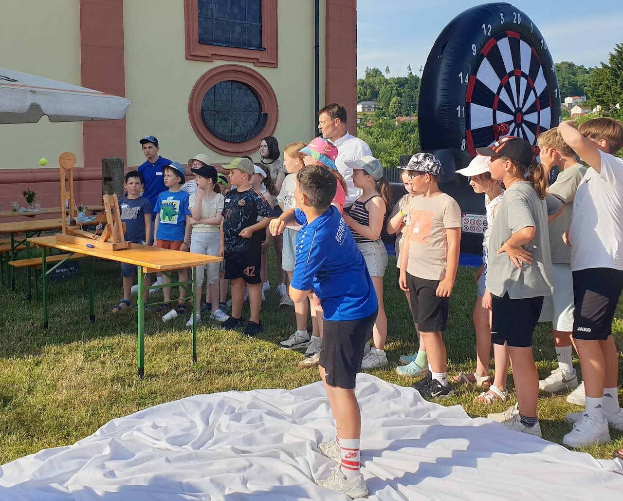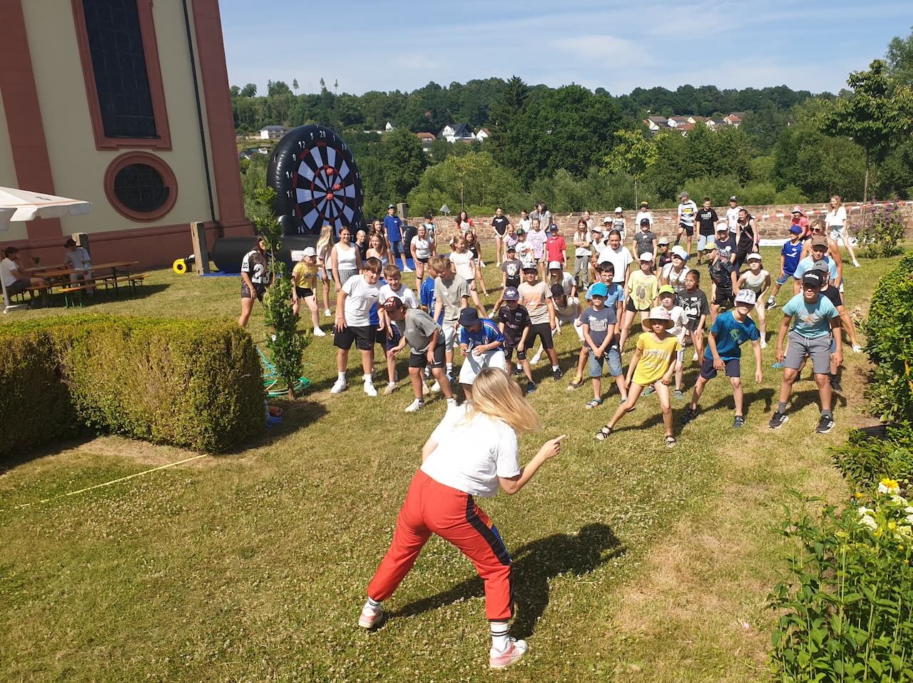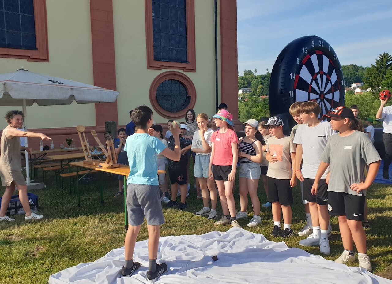 Bei strahlendem Sonnenschein und schweißtreibenden Temperaturen haben die Ministrantinnen und Ministranten des Pastoralverbunds Hessisches Kegelspiel am Sonntag Nachmittag in Burghaun den Sommer eingeläutet. Gut 70 Kinder und Jugendliche aus allen Gemeinden des Verbunds feierten zusammen ein aktives, fröhliches Sommerfestival. Langeweile kam dabei nicht auf, denn die Kids konnten sich an verschiedenen Stationen ausprobieren. Super angenommen wurde der HipHop-Crashkurs, für den eigens Tanzlehrerin Liisa Hakametsä aus Fulda engagiert worden war. Mädchen wie Jungen ließen sich von ihr ein paar partytaugliche Moves zeigen und tanzten motiviert mit. Am Burghauner Weiher konnten die Messdiener beim Minigolf Bälle einlochen oder die angenehm kühlen Kirche "Mariae Himmelfahrt" in einer Kirchenrallye erkunden. Sportlicher Ehrgeiz und Wurfgeschick waren am Schokokuss-Katapult gefragt, dabei wurde jeder Treffer mit Applaus gefeiert. Im bunt geschmückten Pfarrgarten gab es Gelegenheiten, sich untereinander auszutauschen, gemeinsam Spaß zu haben und neue Kontakte zu knüpfen. Mit kühlen Kinder-Cocktails, Burgern, Waffeln und Eis wurden die Festivalteilnehmer von einem Helferteam um Gemeindereferentin Maria-Martina Fischer versorgt. Zum ersten Mal dabei waren auch Pfarrer Markus Günther und Pfarrer Andreas Matthäi. Den krönenden Abschluss bildete am Abend ein von der Band "Herzenssache" aus Großentaft jugendgerecht und ansprechend gestalteter Lobpreis in der Kirche, zu dem die rund 70 Ministrantinnen und Ministranten gewändertragend einen imposanten Einzug ablieferten.
