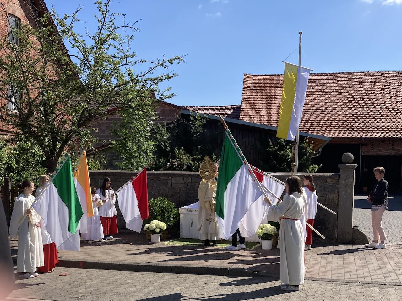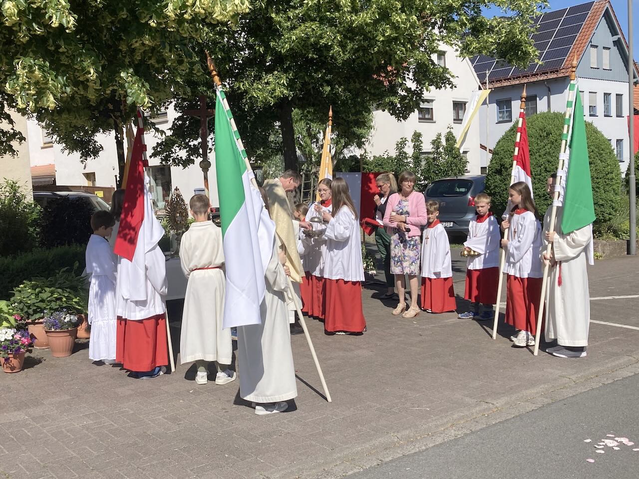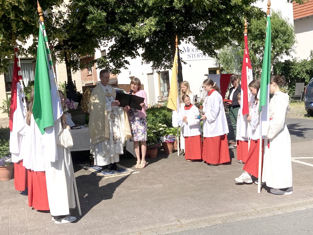Pfarrer Andreas Matthäi dankte im Namen der Kirchengemeinde allen, die zum Gelingen des Gottesdienstes und der Prozession beigetragen hatten. Sein besonderer Dank galt den Familien, die die Altäre aufgebaut und herrlich geschmückt hatten, sowie den Küsterinnen und Messdienerinnen und Messdienern.