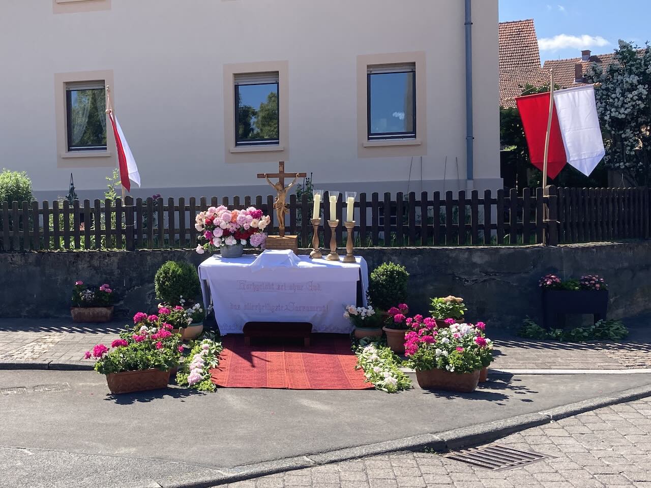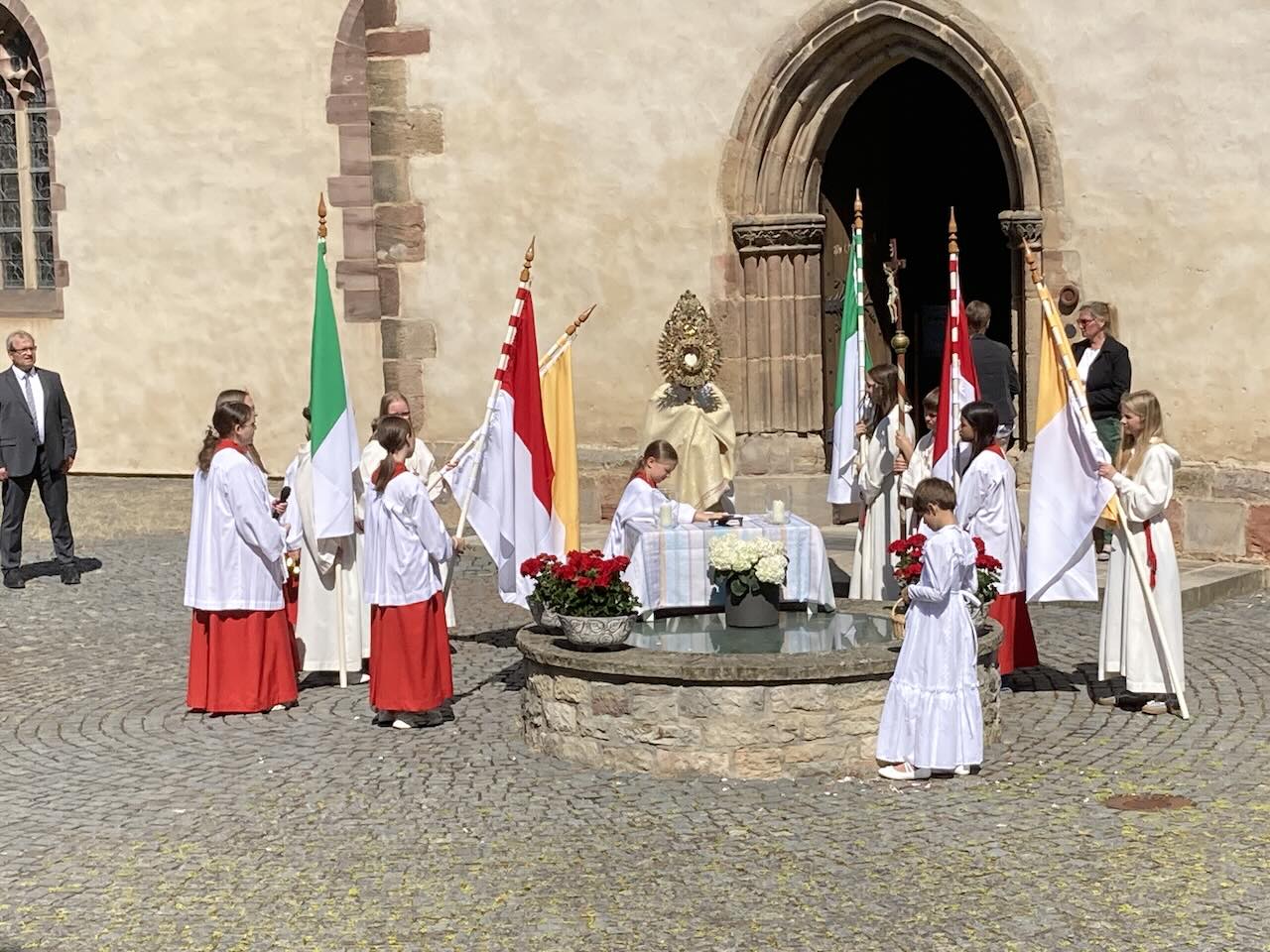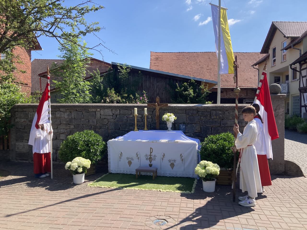 Pfarrer Andreas Matthäi dankte im Namen der Kirchengemeinde allen, die zum Gelingen des Gottesdienstes und der Prozession beigetragen hatten. Sein besonderer Dank galt den Familien, die die Altäre aufgebaut und herrlich geschmückt hatten, sowie den Küsterinnen und Messdienerinnen und Messdienern.