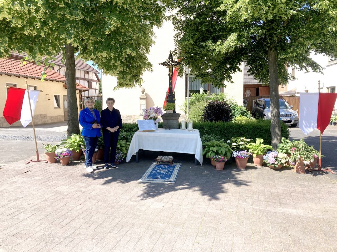 Traditionell führt die Fronleichnamsprozession in Rasdorf um den Anger. Auch in diesem Jahr folgten die Rasdorfer, trotz der Baumaßnahmen in der Dorfmitte dieser Tradition. Nach der Eucharistiefeier in der Stiftskirche begleiteten die Gläubigen Pfarrer Andreas Matthäi. An den vier Altären segnete er mit der Monstranz nach Evangelium Lobpreis und Fürbitten die Gemeinde und ihre Bewohner. Musikalische wurde die Prozession von einer Abordnung der Musikkapelle Niesig (Leitung Andrea Zinn) mitgestaltet. Die Verkehrssicherung hatte dankenswerterweise wieder die Freiwillige Feuerwehr Rasdorf übernommen.