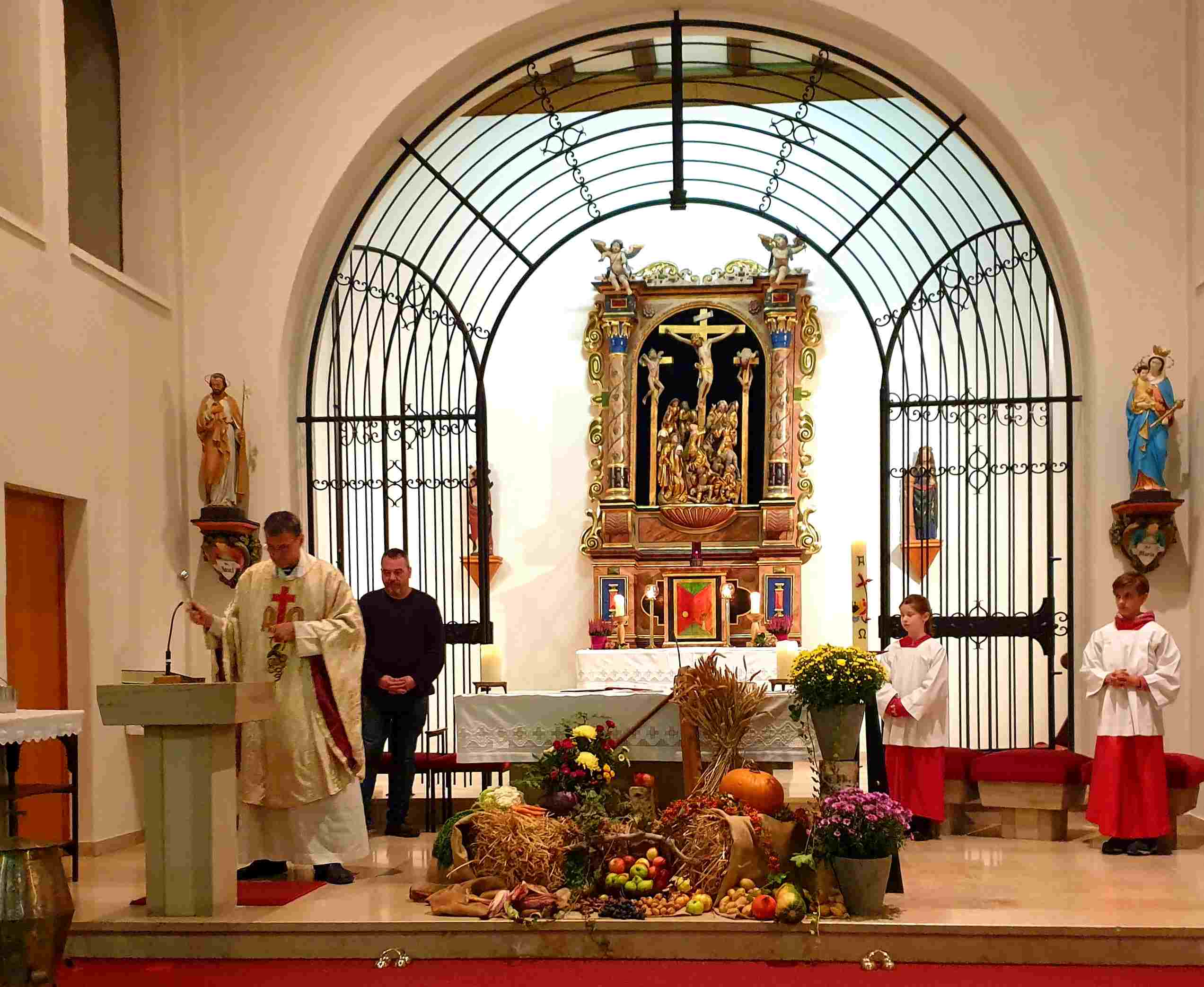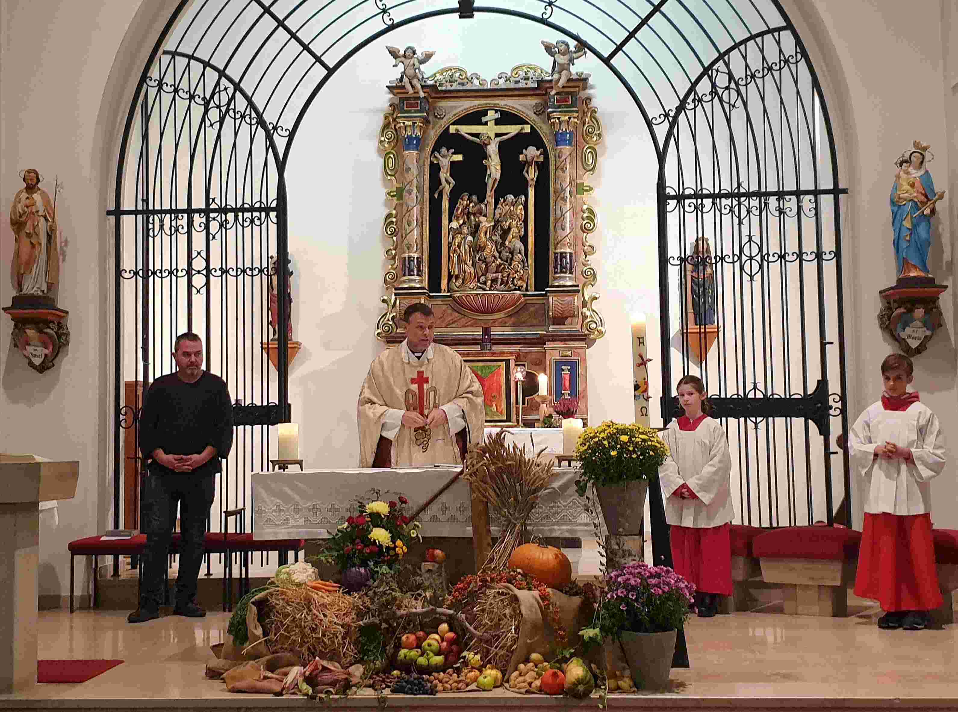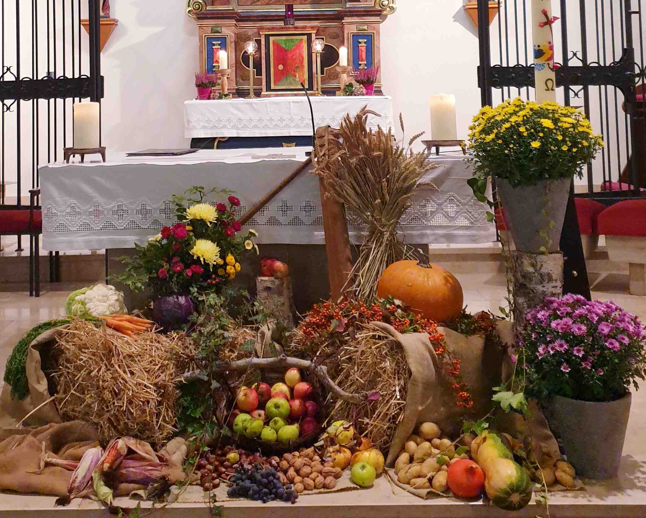Mit bunten Erntegaben wunderschön geschmückt war die Leibolzer Kirche, als am Mittwochabend dort Erntedank gefeiert wurde. Carmen Kircher hatte es in die Hand genommen, Äpfel, Nüsse, Möhren, Kürbisse, Trauben und ähnliches vor dem Altar liebevoll zu arrangieren und so im Namen der Gemeinde dankend vor Gott zu bringen. Pfarrer Markus Günther segnete die Früchte, mit denen unsere Gegend in diesem Jahr besonders reichlich beschenkt wurde und rief dazu auf, auch die Menschen nicht zu vergessen, die nicht genug zum Leben haben.