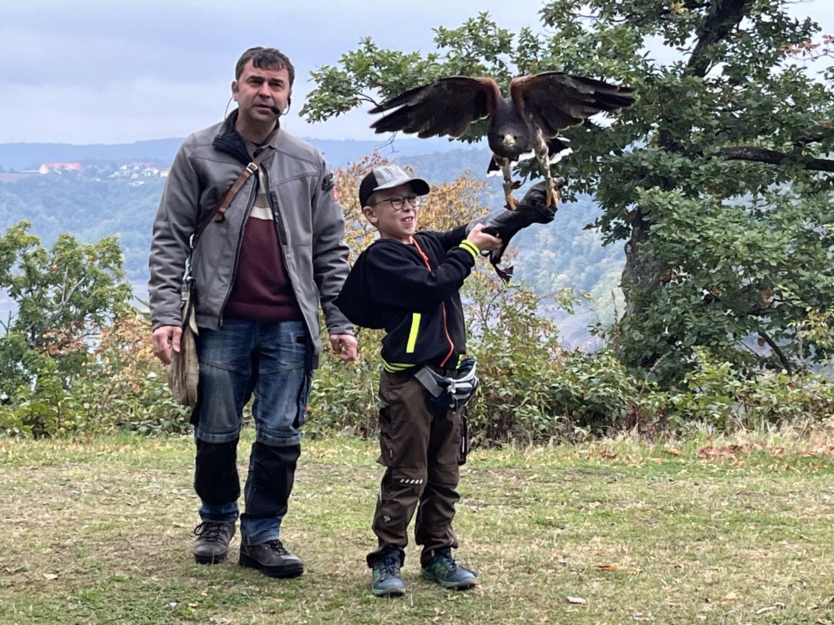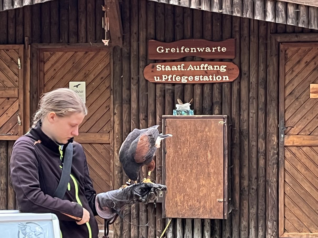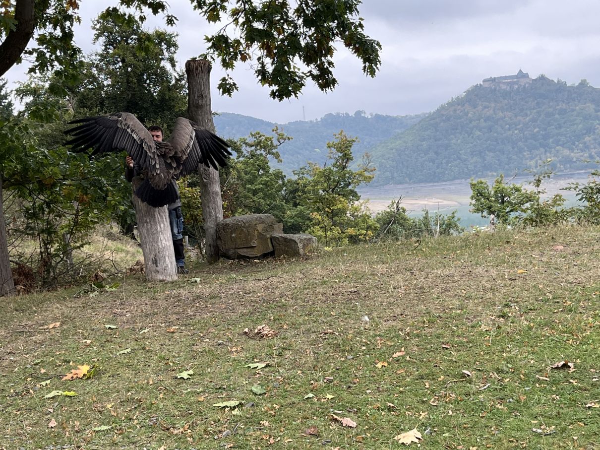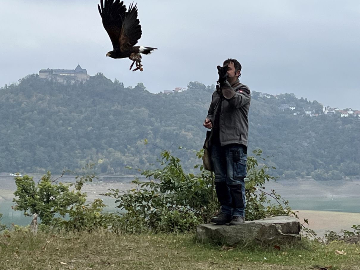Das Highlight des Wildtierparks war die Greifvogel-Flugschau um 15 Uhr. Hier konnten wir den Edersee und die gegenüberliegenden Steilhänge mit dem Schloss Waldeck bestaunen und unter anderem Falken, Milane, Eulen, Uhus und Geier im Freiflug beobachten – manchmal nur knapp über die Köpfe hinweg. Sogar eine Mütze wurde kurz von einem Greifvogel „stibitzt“, die Besitzerin erhielt sie aber wieder. Aus unserer Gruppe konnten sogar zwei Kinder einen Greifvogel auf dem Falknerhandschuh selbst halten. Der Falkner informierte anschaulich über die unterschiedlichen Greifvögel und deren Besonderheiten.