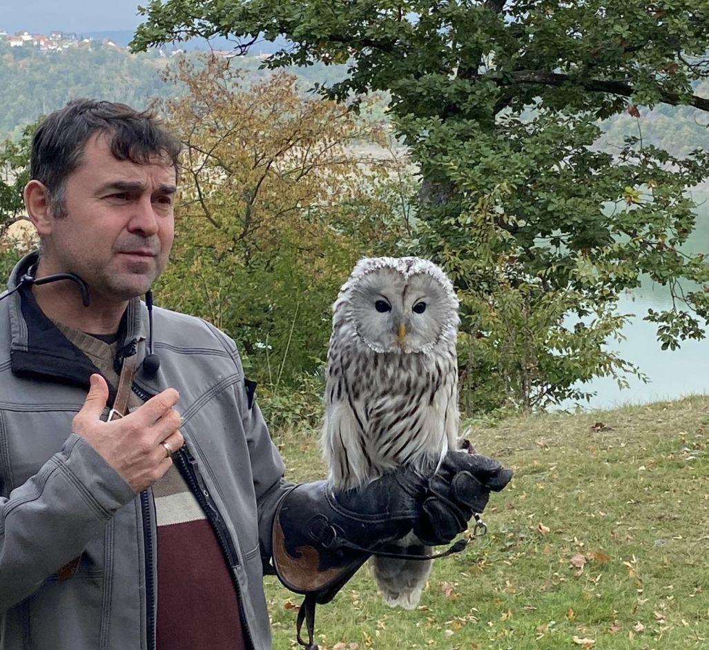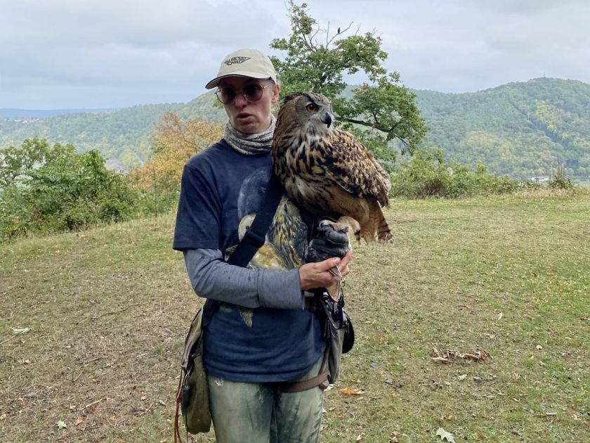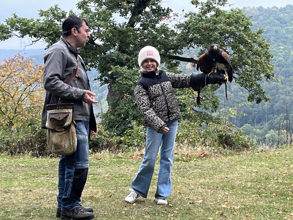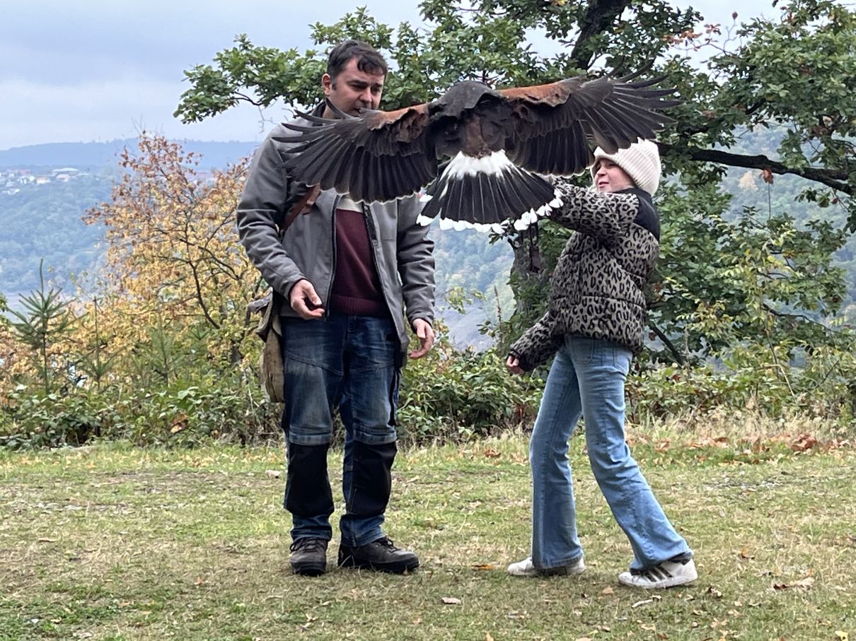 Das Highlight des Wildtierparks war die Greifvogel-Flugschau um 15 Uhr. Hier konnten wir den Edersee und die gegenüberliegenden Steilhänge mit dem Schloss Waldeck bestaunen und unter anderem Falken, Milane, Eulen, Uhus und Geier im Freiflug beobachten – manchmal nur knapp über die Köpfe hinweg. Sogar eine Mütze wurde kurz von einem Greifvogel „stibitzt“, die Besitzerin erhielt sie aber wieder. Aus unserer Gruppe konnten sogar zwei Kinder einen Greifvogel auf dem Falknerhandschuh selbst halten. Der Falkner informierte anschaulich über die unterschiedlichen Greifvögel und deren Besonderheiten.