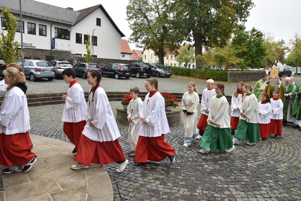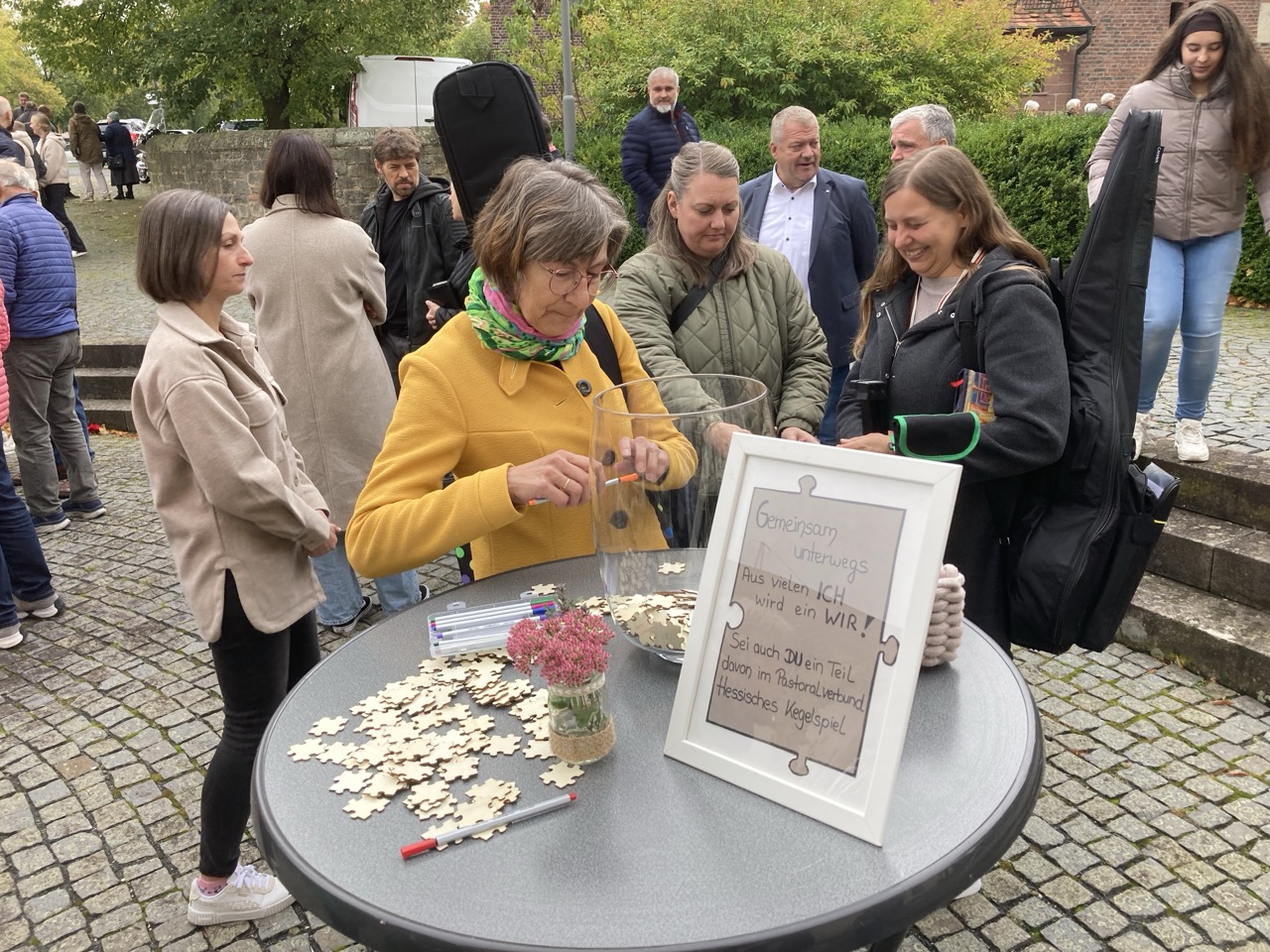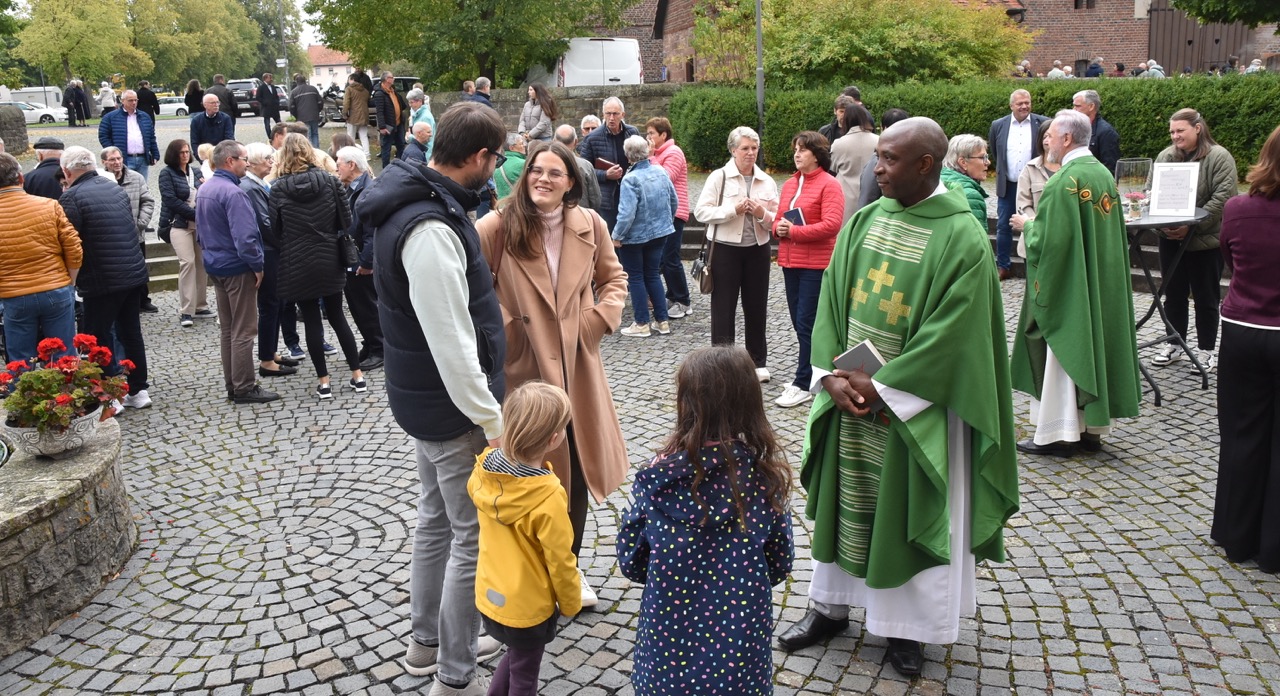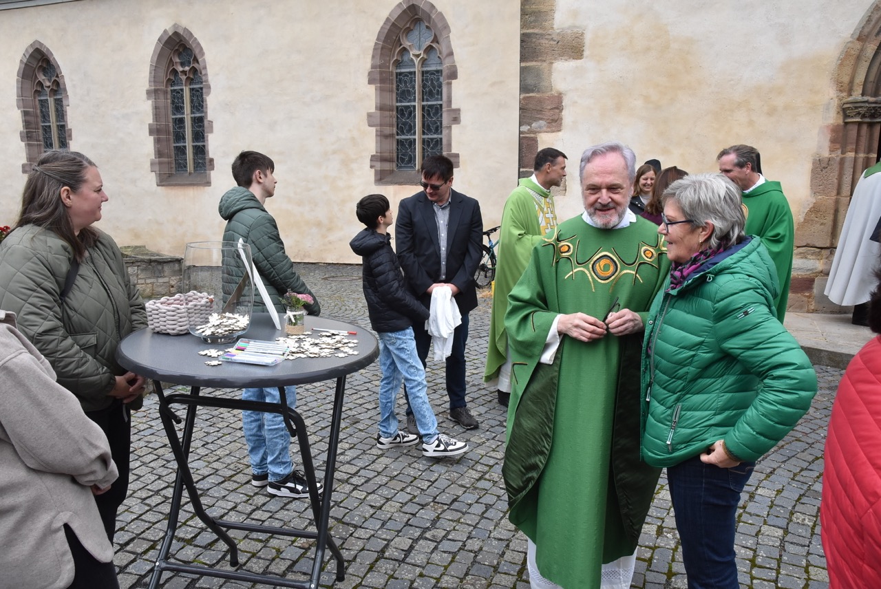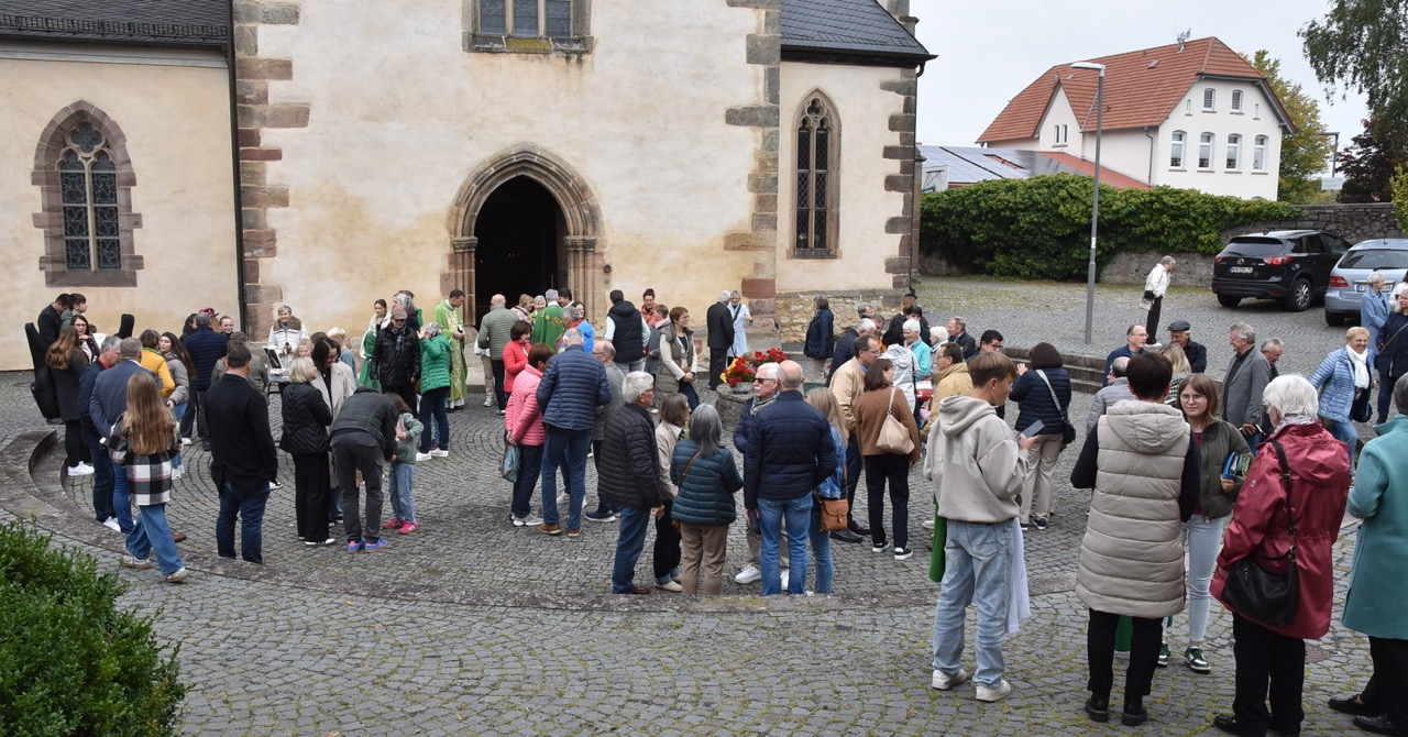 Unter dem Thema „Gemeinsam unterwegs“ hatte der Pastoralverbund Hessisches Kegelspiel zu den Heiligen 14 Nothelfern zum Gottesdienst in die Stiftskirche in Rasdorf die Gläubigen des gesamten Pastoralverbunds eingeladen. Das Familiengottesdienstteam (FamGo-Team) hatte Puzzleteile vorbereitet. Mit der Aufforderung „Gemeinsam unterwegs Aus vielen Ichs wird ein Wir! Sei auch du ein Teil davon im Pastoralverbund Hessisches Kegelspiel“ konnten die Teilnehmenden vor dem Gotteshaus ihren Namen auf Puzzleteile schreiben, die dann zu einem Ganzen zusammengefügt werden. Den Gottesdienst zelebrierte leitender Pfarrer Markus C. Günther in Konzelebration mit den Pfarrern Andreas Matthäi, Aloysius Ndiukwu, Marcel Krawietz, Winfried Vogel und Peter Hannappel. Er begrüßte die Teilnehmenden aus den Kirchengemeineden Burghaun, Hünhan, Langenschwarz, Neukirchen, Steinbach, Eiterfeld mit Filialen, Arzell mit Filialen, Wölf, Oberweisenborn, Großentaft mit Treischfeld und Soisdorf, Ufhausen mit Unterufhausen und Mansbach, Rasdorf mit Grüsselbach und Setzelbach. Seit dem 01. Oktober 2024 sei der Pastoralverbund per Dekret des Bischofs zur territorialen Umschreibung aufgefordert. Bezogen auf die Puzzleteile betonte Markus Günther in seiner Predigt, dass zum Gesamtbild jeder mit seinen Stärken und Schwächen, einzigartigen Begabungen, Geben und Nehmen beitragen könne. Puzzleteile, die sich nicht verbinden würden, blieben isoliert. Daraus könne eine soziale Schieflage entstehen, die den anderen nicht mehr wahrnimmt. Damit stellte er ein Bezug zum Tagesevangelium her, das die Geschichte von „dem armen Lazarus und dem Reichen“ erzählt. Darin werde deutlich, dass es „ein zu Spät“ gebe. Die Botschaft, dass einer von den Toten auferstanden sei, die jeden Sonntag bzw. in der Eucharistie gefeiert werden, sei keine Gewähr dafür, umzudenken und sich zu bekehren. Wo sich Gottlosigkeit breit mach, bestehe die Gefahr, dass der arme Lazarus vor unserer Haustür aus dem Blick gerade, betonte Markus Günther. Der Zusammenschluss der oben genannten Pfarreien von jenseits der A 7 bis zur thüringischen Grenze sei Mittel, um Gott zu loben, ihm Ehrfurcht zu erweisen, ihm zu dienen und dadurch die frohe Botschaft zu verkünden. Der leitende Pfarrer schloss seine Predigt mit dem Wunsch, dass jede/ jeder sein Puzzleteil dazu beitrage, damit ein Bild entstehe, das größer ist als die Summe seiner Einzelteile. Das Bild, das wir im Gesamten noch nicht sähen, das Gott aber schon längst als Vision von seinem Reich und als tiefste Sehnsucht in uns hineingelegt habe. Am Ende des Gottesdienstes stellte Gemeindereferentin Maria Martina Fischer die neue Referentin für Ehrenamtsförderung und Netzwerkarbeit im Pastoralverbund Lydia Hohmann vor, die seit dem 15. September 2025 tätig ist (nähre Beschreibung im Newsletter des Pastoralverbund).
