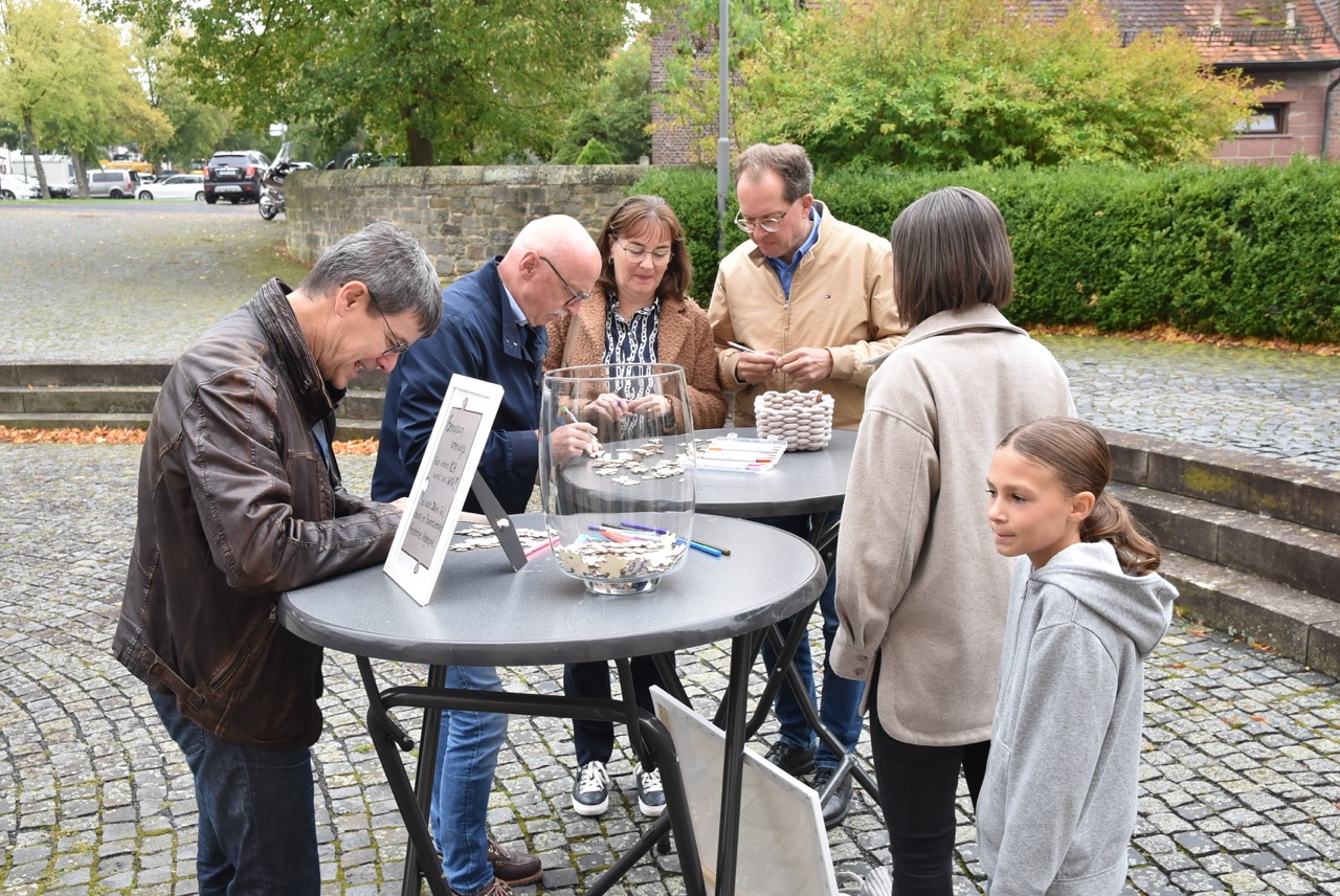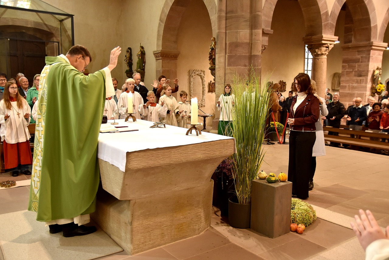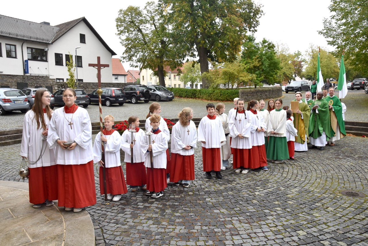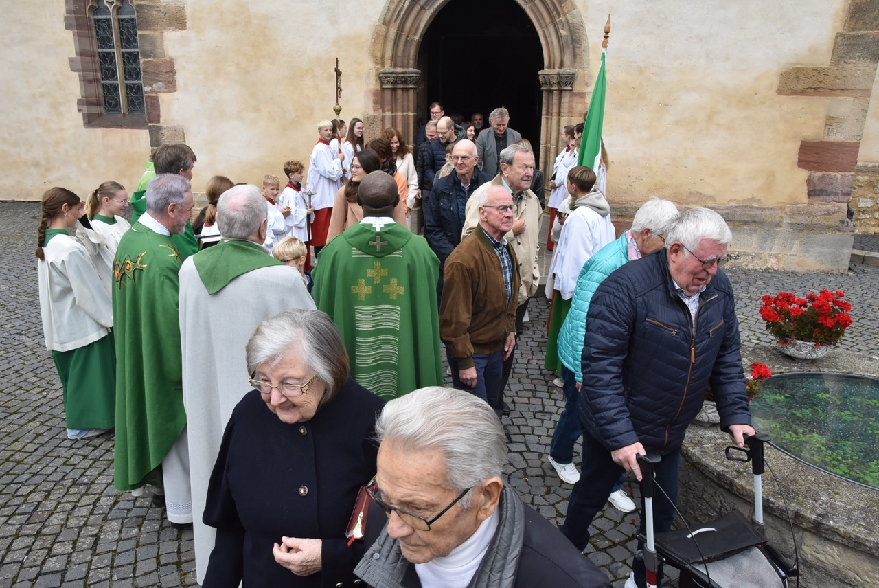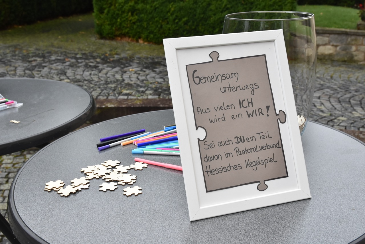 Unter dem Thema „Gemeinsam unterwegs“ hatte der Pastoralverbund Hessisches Kegelspiel zu den Heiligen 14 Nothelfern zum Gottesdienst in die Stiftskirche in Rasdorf die Gläubigen des gesamten Pastoralverbunds eingeladen. Das Familiengottesdienstteam (FamGo-Team) hatte Puzzleteile vorbereitet. Mit der Aufforderung „Gemeinsam unterwegs Aus vielen Ichs wird ein Wir! Sei auch du ein Teil davon im Pastoralverbund Hessisches Kegelspiel“ konnten die Teilnehmenden vor dem Gotteshaus ihren Namen auf Puzzleteile schreiben, die dann zu einem Ganzen zusammengefügt werden. Den Gottesdienst zelebrierte leitender Pfarrer Markus C. Günther in Konzelebration mit den Pfarrern Andreas Matthäi, Aloysius Ndiukwu, Marcel Krawietz, Winfried Vogel und Peter Hannappel. Er begrüßte die Teilnehmenden aus den Kirchengemeineden Burghaun, Hünhan, Langenschwarz, Neukirchen, Steinbach, Eiterfeld mit Filialen, Arzell mit Filialen, Wölf, Oberweisenborn, Großentaft mit Treischfeld und Soisdorf, Ufhausen mit Unterufhausen und Mansbach, Rasdorf mit Grüsselbach und Setzelbach. Seit dem 01. Oktober 2024 sei der Pastoralverbund per Dekret des Bischofs zur territorialen Umschreibung aufgefordert. Bezogen auf die Puzzleteile betonte Markus Günther in seiner Predigt, dass zum Gesamtbild jeder mit seinen Stärken und Schwächen, einzigartigen Begabungen, Geben und Nehmen beitragen könne. Puzzleteile, die sich nicht verbinden würden, blieben isoliert. Daraus könne eine soziale Schieflage entstehen, die den anderen nicht mehr wahrnimmt. Damit stellte er ein Bezug zum Tagesevangelium her, das die Geschichte von „dem armen Lazarus und dem Reichen“ erzählt. Darin werde deutlich, dass es „ein zu Spät“ gebe. Die Botschaft, dass einer von den Toten auferstanden sei, die jeden Sonntag bzw. in der Eucharistie gefeiert werden, sei keine Gewähr dafür, umzudenken und sich zu bekehren. Wo sich Gottlosigkeit breit mach, bestehe die Gefahr, dass der arme Lazarus vor unserer Haustür aus dem Blick gerade, betonte Markus Günther. Der Zusammenschluss der oben genannten Pfarreien von jenseits der A 7 bis zur thüringischen Grenze sei Mittel, um Gott zu loben, ihm Ehrfurcht zu erweisen, ihm zu dienen und dadurch die frohe Botschaft zu verkünden. Der leitende Pfarrer schloss seine Predigt mit dem Wunsch, dass jede/ jeder sein Puzzleteil dazu beitrage, damit ein Bild entstehe, das größer ist als die Summe seiner Einzelteile. Das Bild, das wir im Gesamten noch nicht sähen, das Gott aber schon längst als Vision von seinem Reich und als tiefste Sehnsucht in uns hineingelegt habe. Am Ende des Gottesdienstes stellte Gemeindereferentin Maria Martina Fischer die neue Referentin für Ehrenamtsförderung und Netzwerkarbeit im Pastoralverbund Lydia Hohmann vor, die seit dem 15. September 2025 tätig ist (nähre Beschreibung im Newsletter des Pastoralverbund).