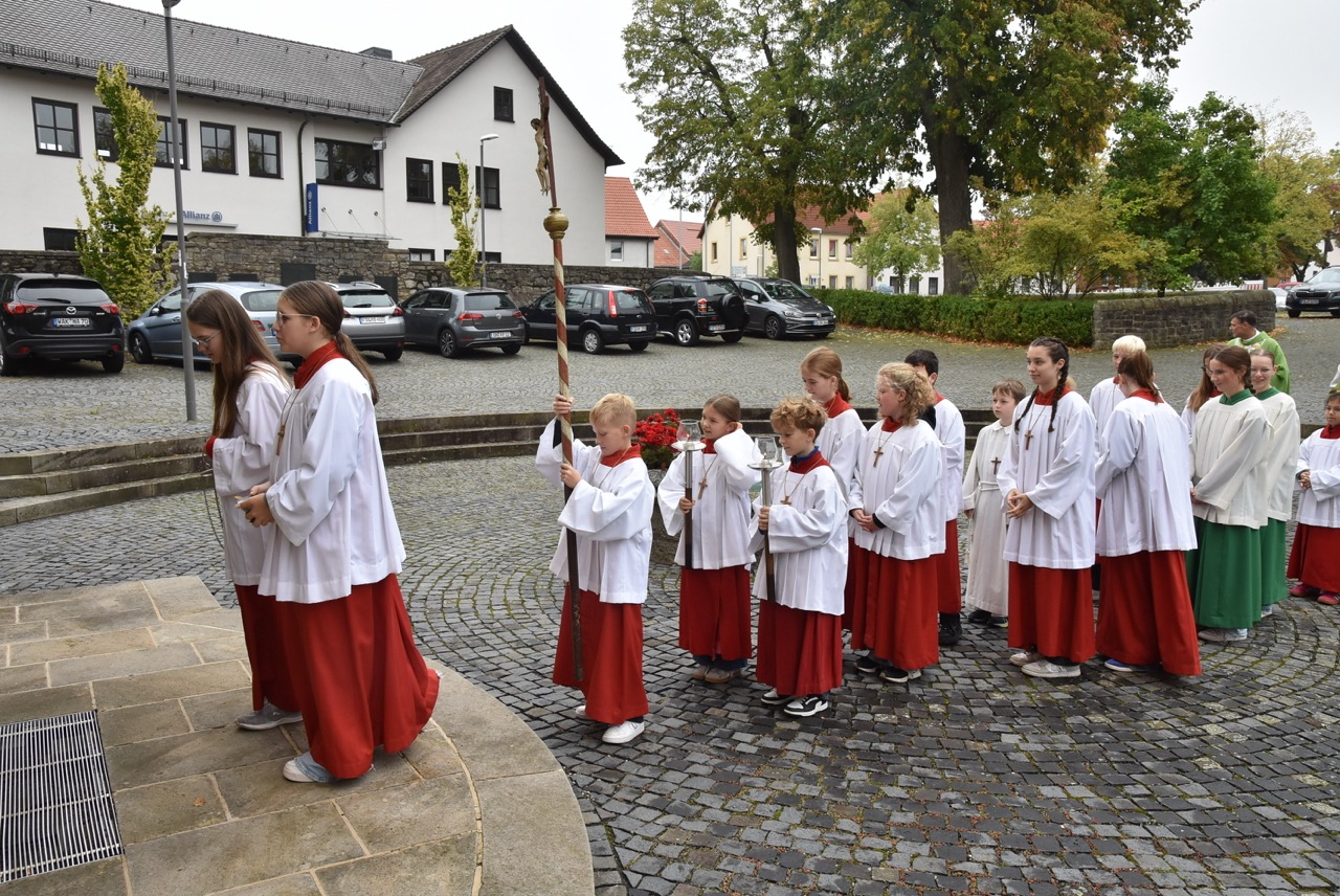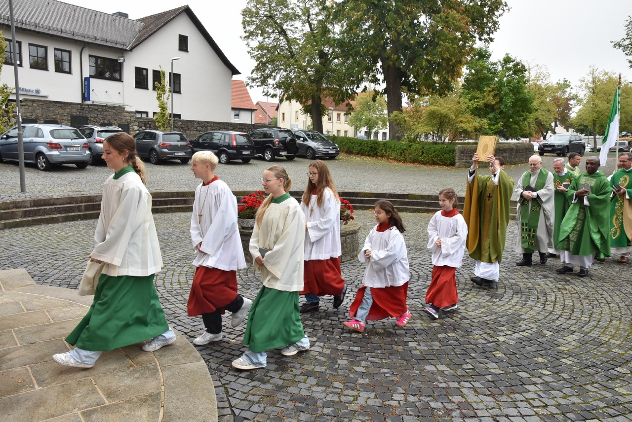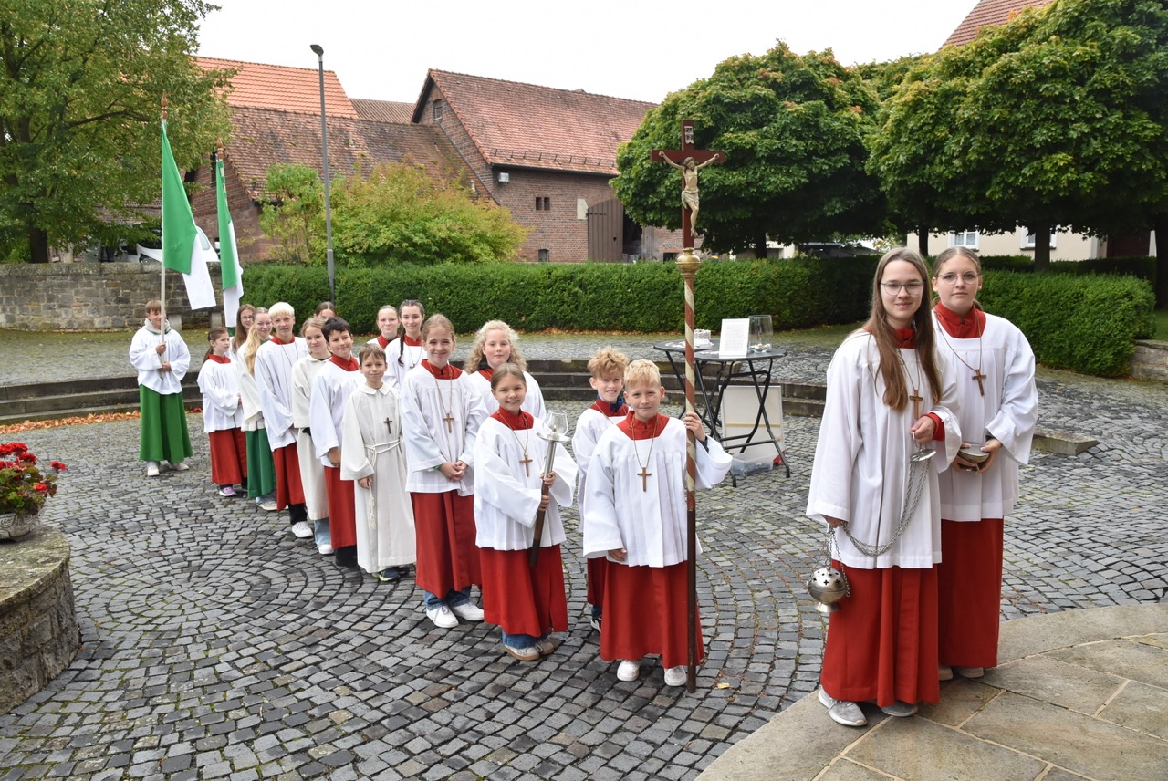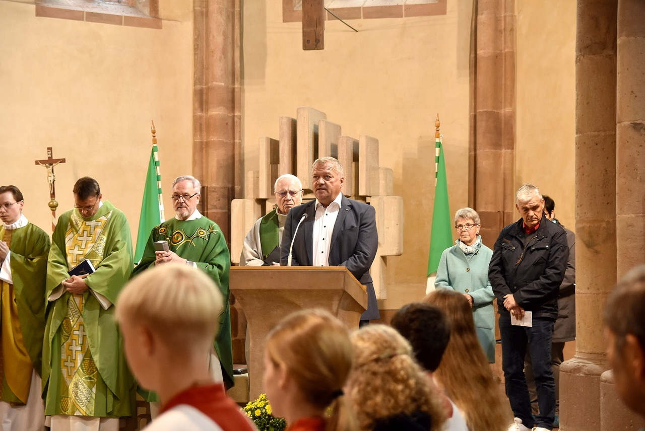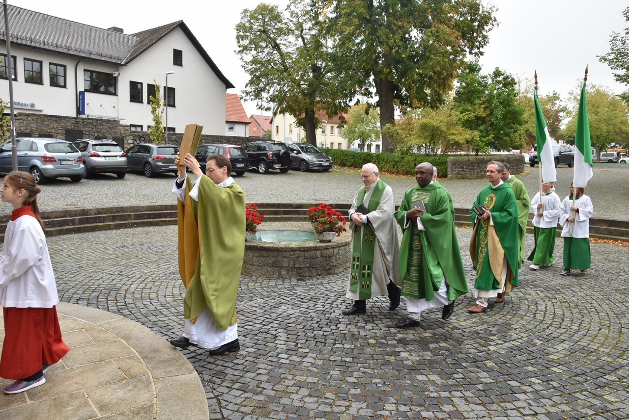 Unter dem Thema „Gemeinsam unterwegs“ hatte der Pastoralverbund Hessisches Kegelspiel zu den Heiligen 14 Nothelfern zum Gottesdienst in die Stiftskirche in Rasdorf die Gläubigen des gesamten Pastoralverbunds eingeladen. Das Familiengottesdienstteam (FamGo-Team) hatte Puzzleteile vorbereitet. Mit der Aufforderung „Gemeinsam unterwegs Aus vielen Ichs wird ein Wir! Sei auch du ein Teil davon im Pastoralverbund Hessisches Kegelspiel“ konnten die Teilnehmenden vor dem Gotteshaus ihren Namen auf Puzzleteile schreiben, die dann zu einem Ganzen zusammengefügt werden. Den Gottesdienst zelebrierte leitender Pfarrer Markus C. Günther in Konzelebration mit den Pfarrern Andreas Matthäi, Aloysius Ndiukwu, Marcel Krawietz, Winfried Vogel und Peter Hannappel. Er begrüßte die Teilnehmenden aus den Kirchengemeineden Burghaun, Hünhan, Langenschwarz, Neukirchen, Steinbach, Eiterfeld mit Filialen, Arzell mit Filialen, Wölf, Oberweisenborn, Großentaft mit Treischfeld und Soisdorf, Ufhausen mit Unterufhausen und Mansbach, Rasdorf mit Grüsselbach und Setzelbach. Seit dem 01. Oktober 2024 sei der Pastoralverbund per Dekret des Bischofs zur territorialen Umschreibung aufgefordert. Bezogen auf die Puzzleteile betonte Markus Günther in seiner Predigt, dass zum Gesamtbild jeder mit seinen Stärken und Schwächen, einzigartigen Begabungen, Geben und Nehmen beitragen könne. Puzzleteile, die sich nicht verbinden würden, blieben isoliert. Daraus könne eine soziale Schieflage entstehen, die den anderen nicht mehr wahrnimmt. Damit stellte er ein Bezug zum Tagesevangelium her, das die Geschichte von „dem armen Lazarus und dem Reichen“ erzählt. Darin werde deutlich, dass es „ein zu Spät“ gebe. Die Botschaft, dass einer von den Toten auferstanden sei, die jeden Sonntag bzw. in der Eucharistie gefeiert werden, sei keine Gewähr dafür, umzudenken und sich zu bekehren. Wo sich Gottlosigkeit breit mach, bestehe die Gefahr, dass der arme Lazarus vor unserer Haustür aus dem Blick gerade, betonte Markus Günther. Der Zusammenschluss der oben genannten Pfarreien von jenseits der A 7 bis zur thüringischen Grenze sei Mittel, um Gott zu loben, ihm Ehrfurcht zu erweisen, ihm zu dienen und dadurch die frohe Botschaft zu verkünden. Der leitende Pfarrer schloss seine Predigt mit dem Wunsch, dass jede/ jeder sein Puzzleteil dazu beitrage, damit ein Bild entstehe, das größer ist als die Summe seiner Einzelteile. Das Bild, das wir im Gesamten noch nicht sähen, das Gott aber schon längst als Vision von seinem Reich und als tiefste Sehnsucht in uns hineingelegt habe. Am Ende des Gottesdienstes stellte Gemeindereferentin Maria Martina Fischer die neue Referentin für Ehrenamtsförderung und Netzwerkarbeit im Pastoralverbund Lydia Hohmann vor, die seit dem 15. September 2025 tätig ist (nähre Beschreibung im Newsletter des Pastoralverbund).