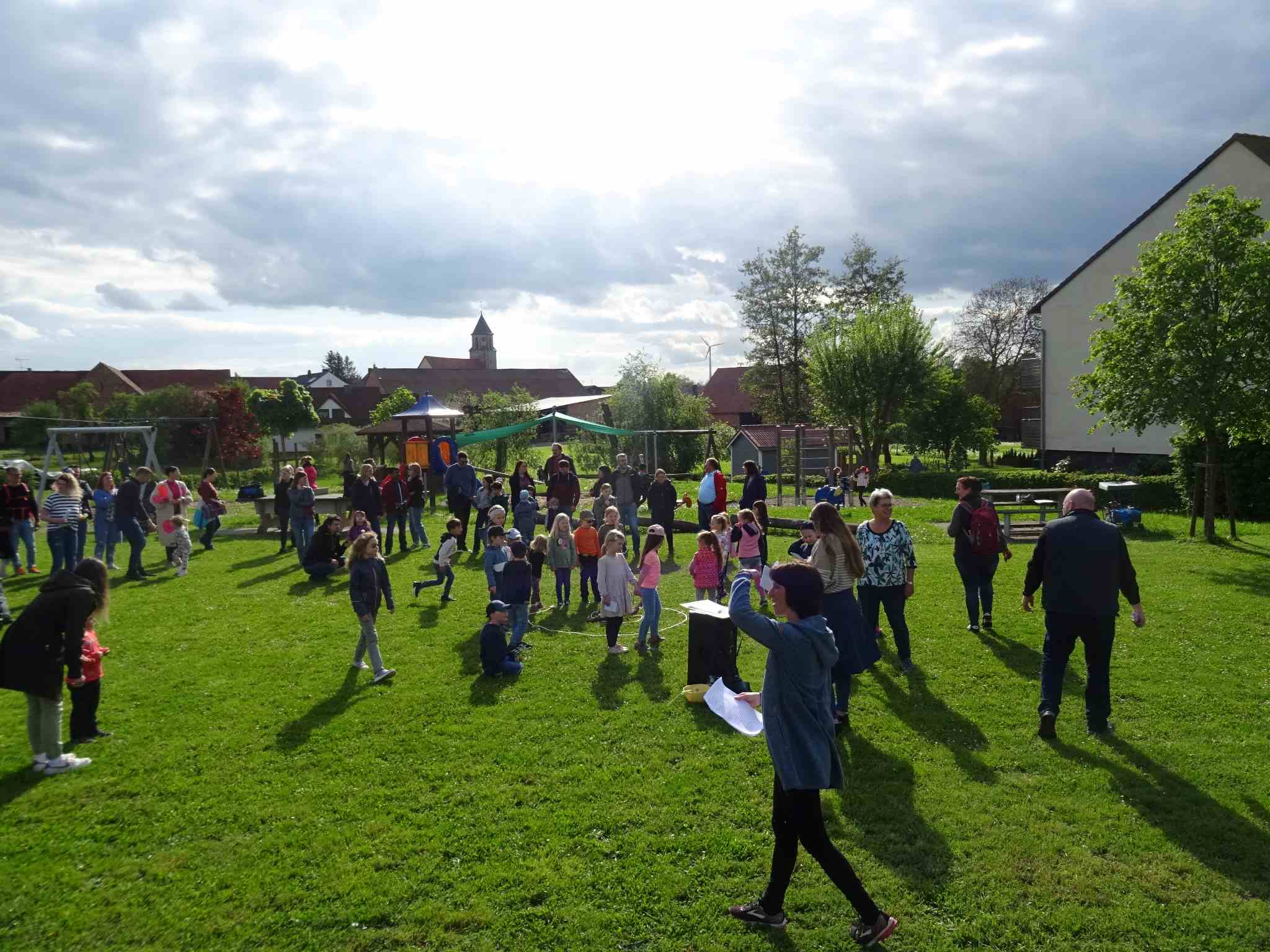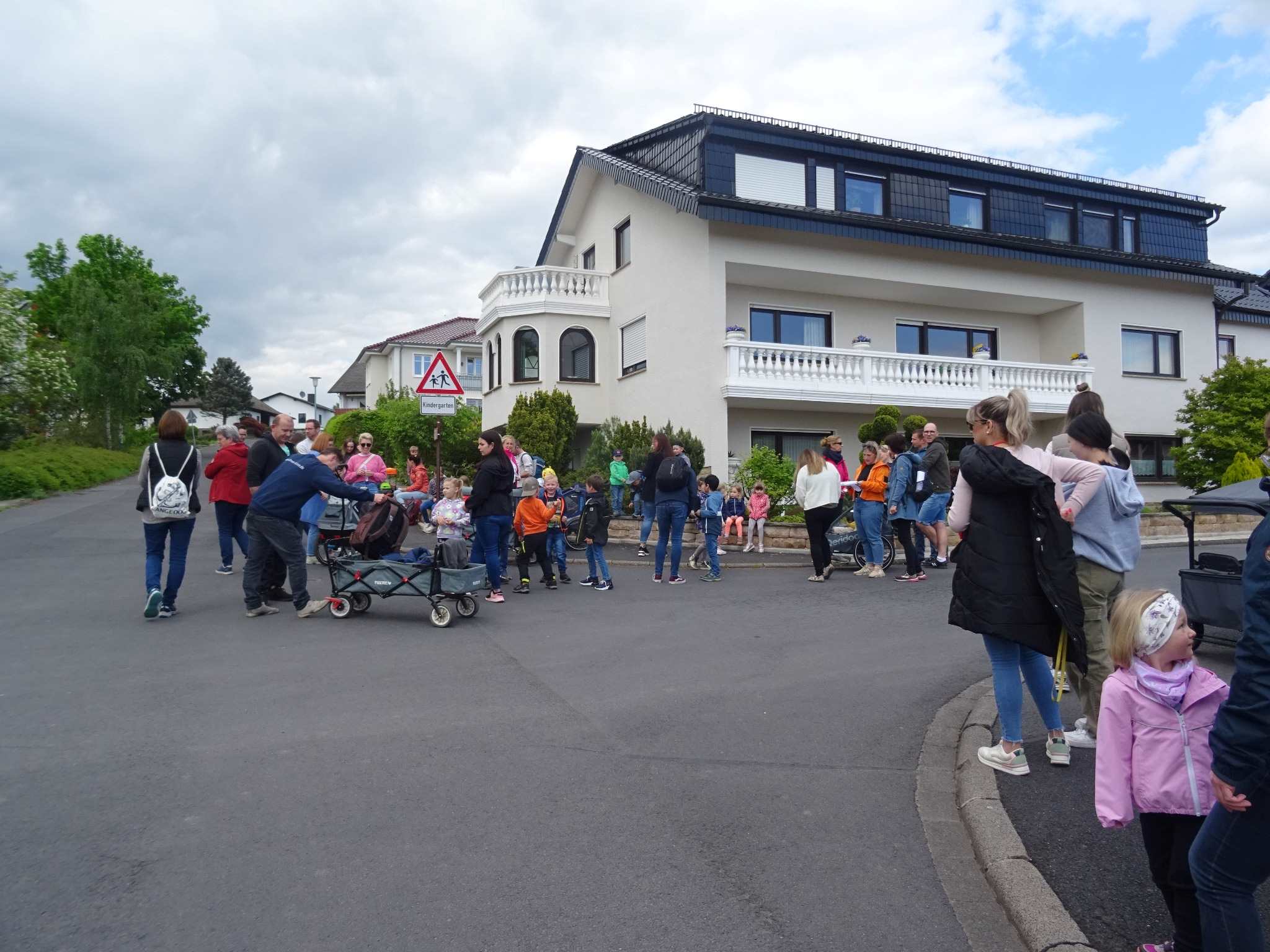 Dann ging es mit Rucksack und Bollerwagen nach Leimbach auf den Spielplatz. Mit Liedern und Bewegungsspielen boten die Kinder ein kurzweiliges Programm, bei dem die Eltern eingeladen waren, aktiv mitzumachen. Auch ein Gedicht und ein selbstgebasteltes Geschenk, zum Vater und Muttertag, durfte nicht fehlen.