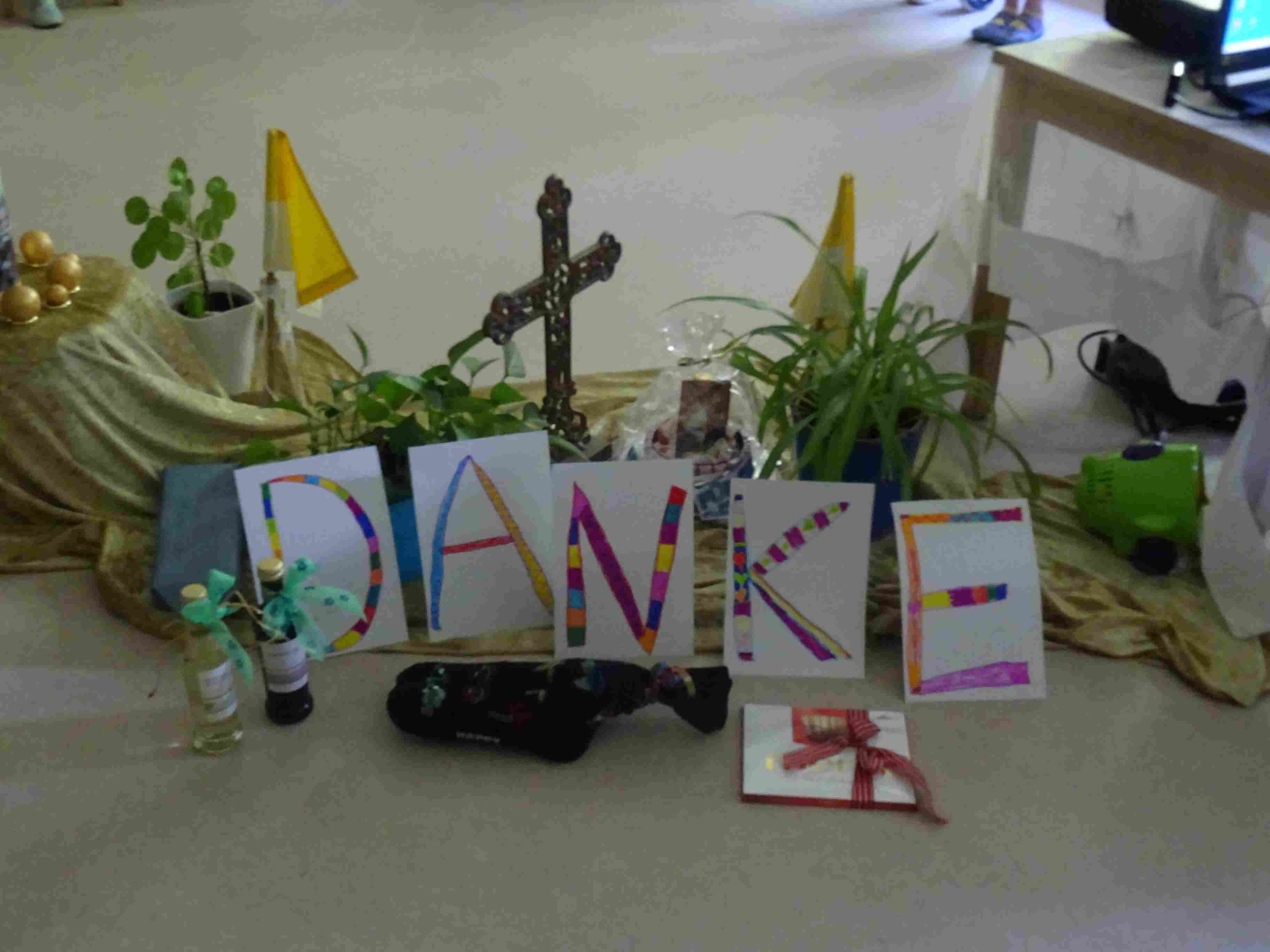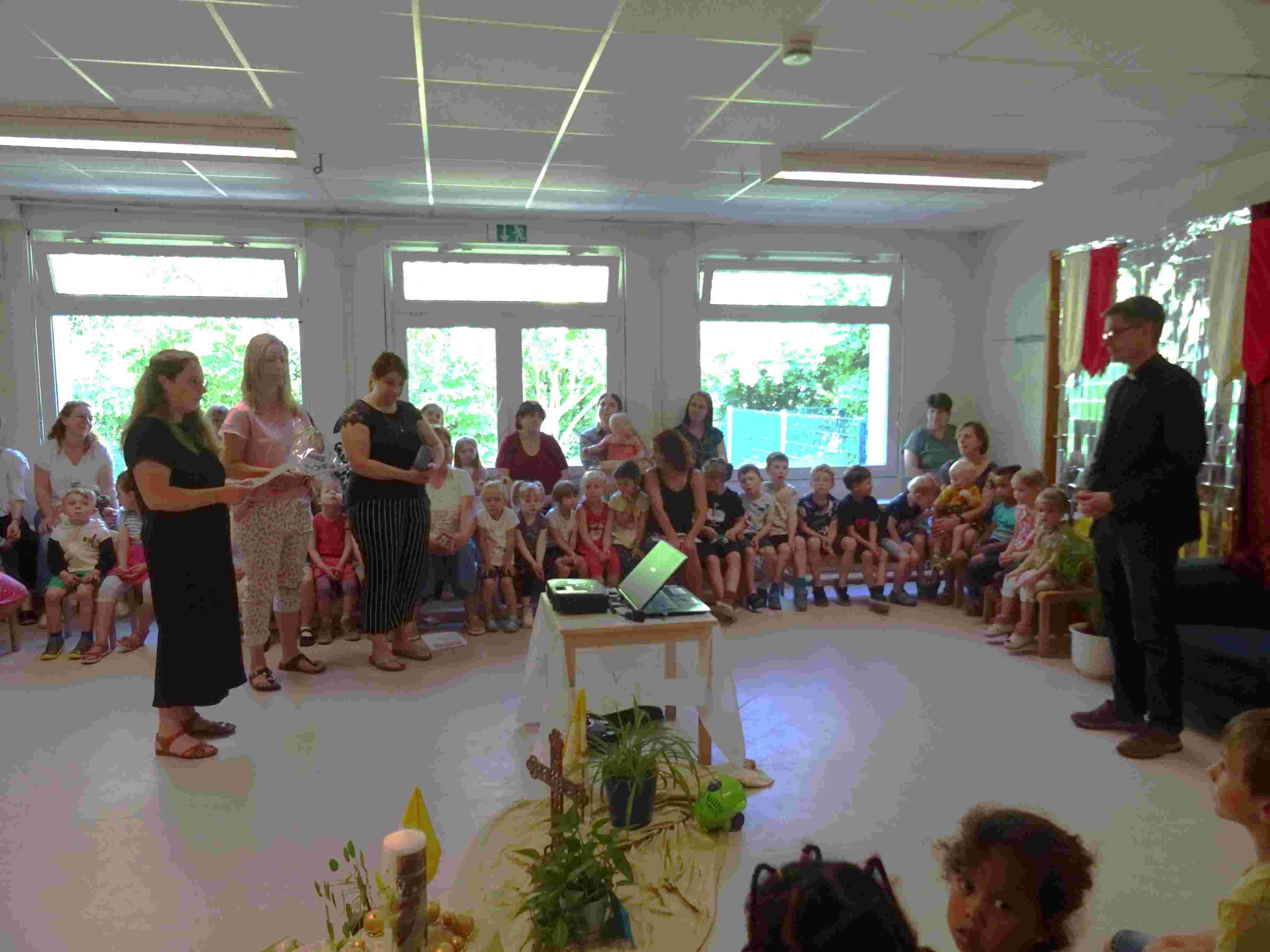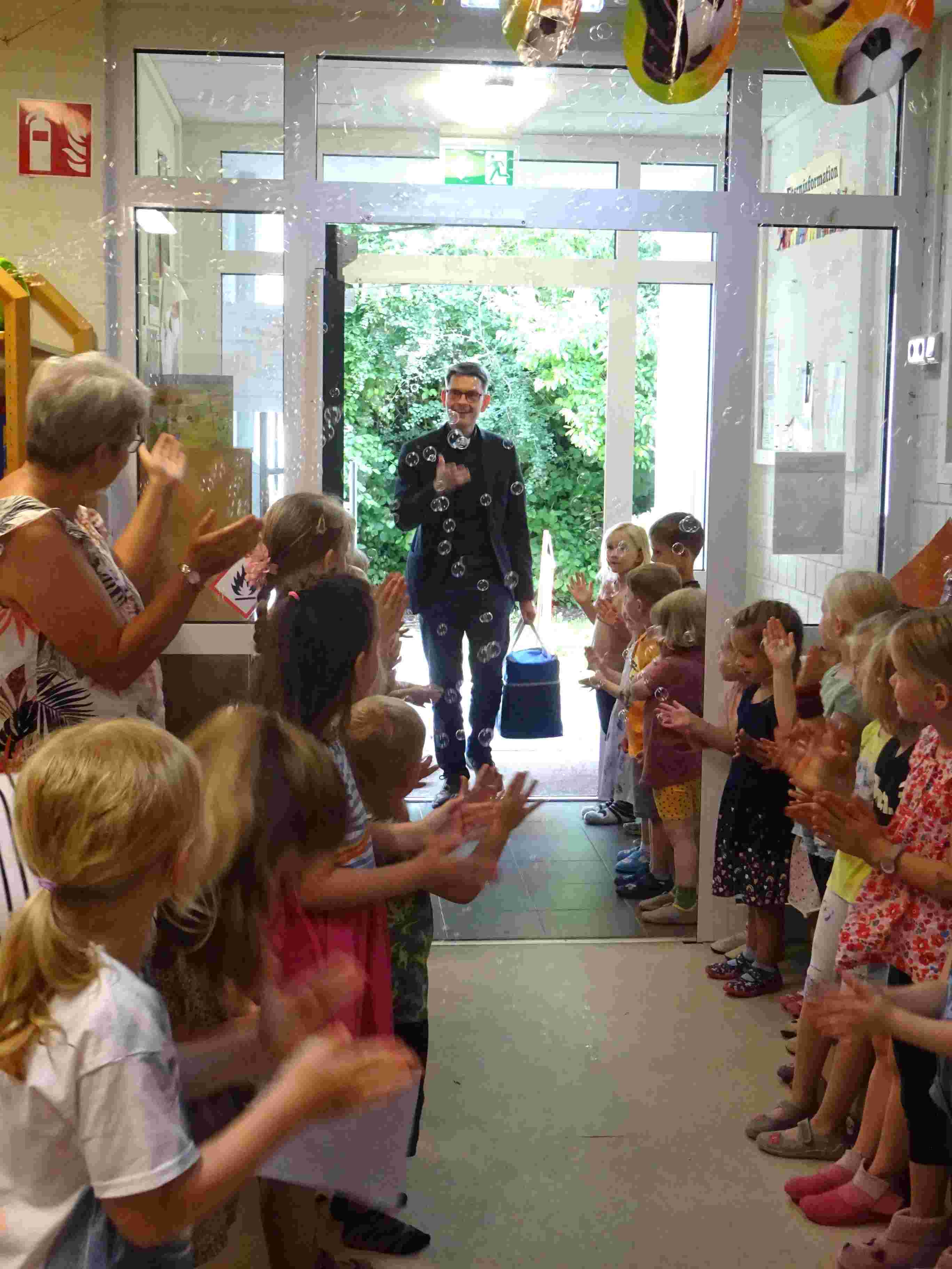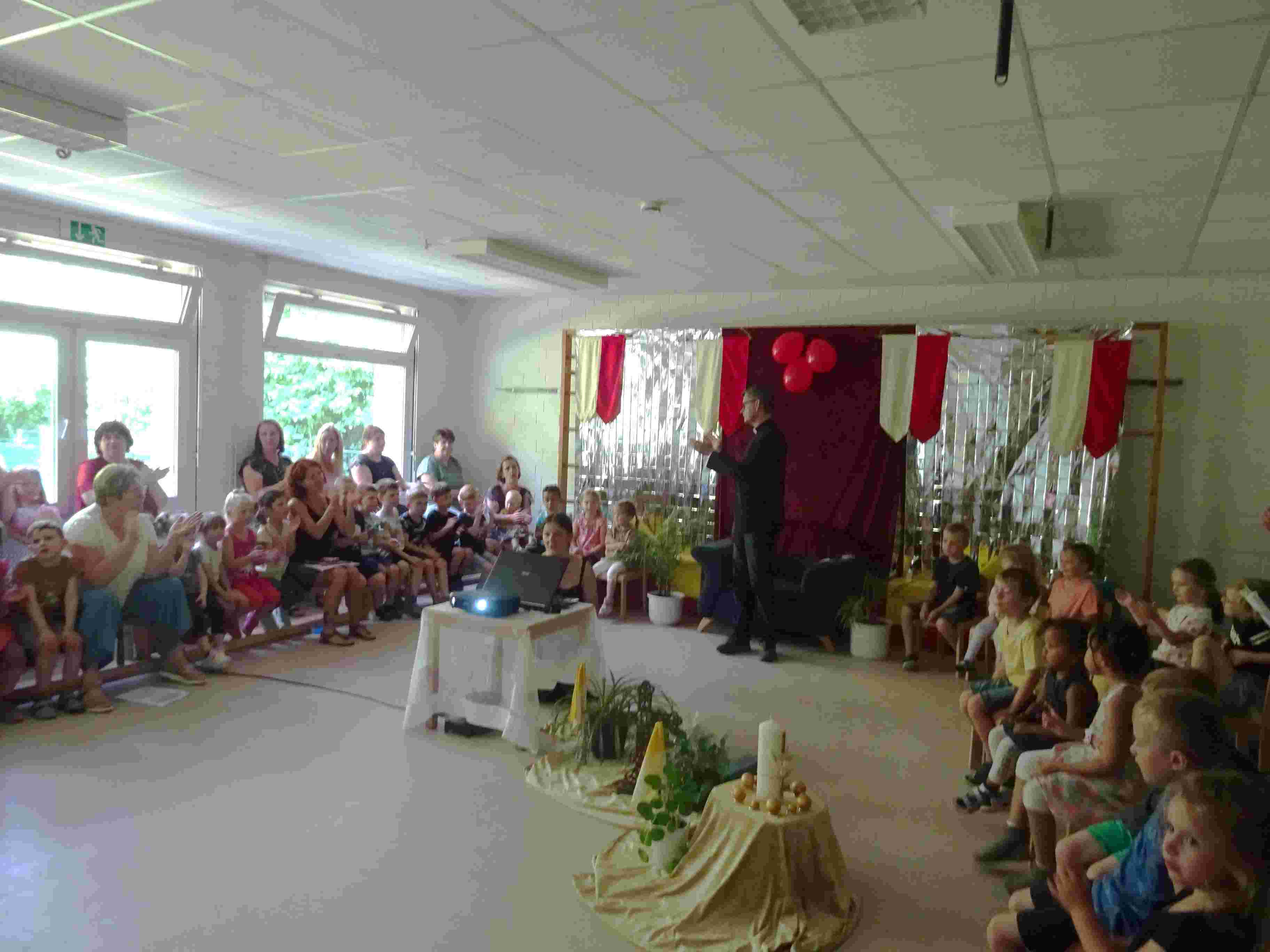 Herr Pfarrer Blümel wurde in der KiTa herzlich empfangen. Mit einem Seifenblasenregen zog er durch die im Spalier stehenden Kinder. Schnell fanden alle in der Turnhalle Platz und los ging es mit der Feierstunde. Die Kinder sangen vertraute Lieder, die auch von den Gästen mitgesungen werden konnten. Die Kinder und Erzieher/innen dankten Herrn Pfarrer Blümel für die schöne Zeit, die sie gemeinsam, bei ganz unterschiedlichen Projekten miteinander erlebt haben. Der Elternbeirat wünschte Herr Pfarrer Blümel alles Gute für den weiteren Weg und so wurde es eine gelungene harmonische und kurzweilige Feier. Besonders bei dem Wissensquiz verstand es Herr Pfarrer Blümel, die Kinder ganz spontan mit einzubeziehen und hatte selbst sehr viel Spaß. Ein sehr emotionaler Beitrag war die Diashow. Es wurde uns bewusst, wie viele gemeinsame Begegnungen, in 18 Jahren, mit Herr Pfarrer Blümel stattgefunden haben.