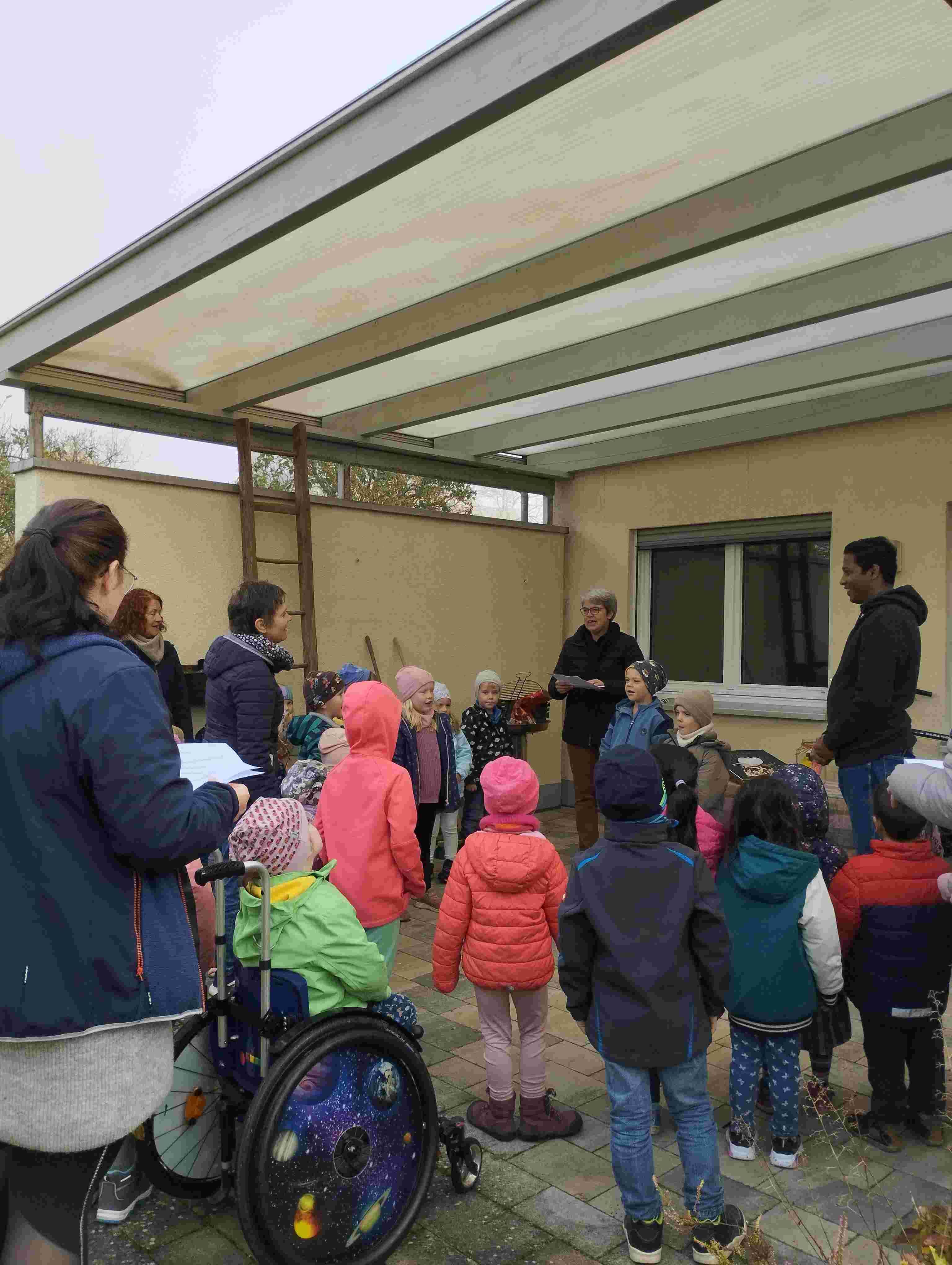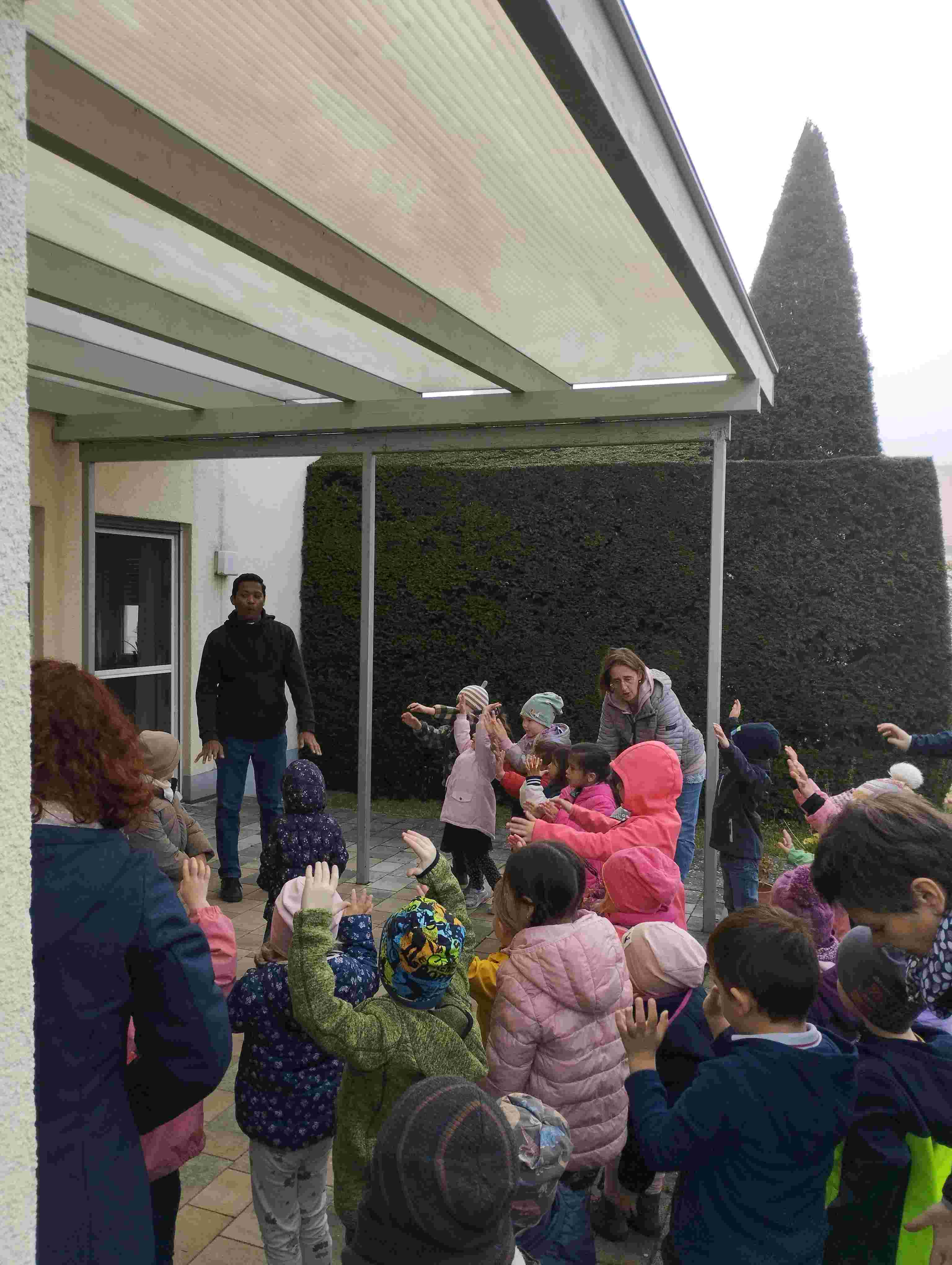 Frau Roth bedankte sich im Namen der Kinder und des Teams bei Herrn Pater Binesh für die gute Zusammenarbeit. Die gemeinsamen religiösen Impulse sind immer sehr gut und freudig von den Kindern angenommen worden. Am Ende durfte ein lustiges Mitmachlied nicht fehlen. Gemeinsam mit den Kindern hatte Herr Pater Binesh viel Spaß an den Bewegungen.