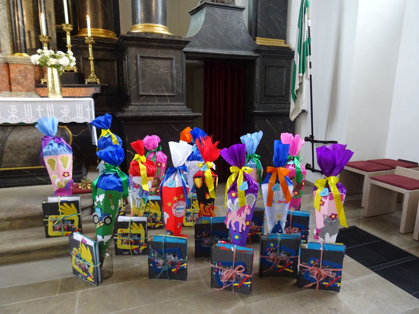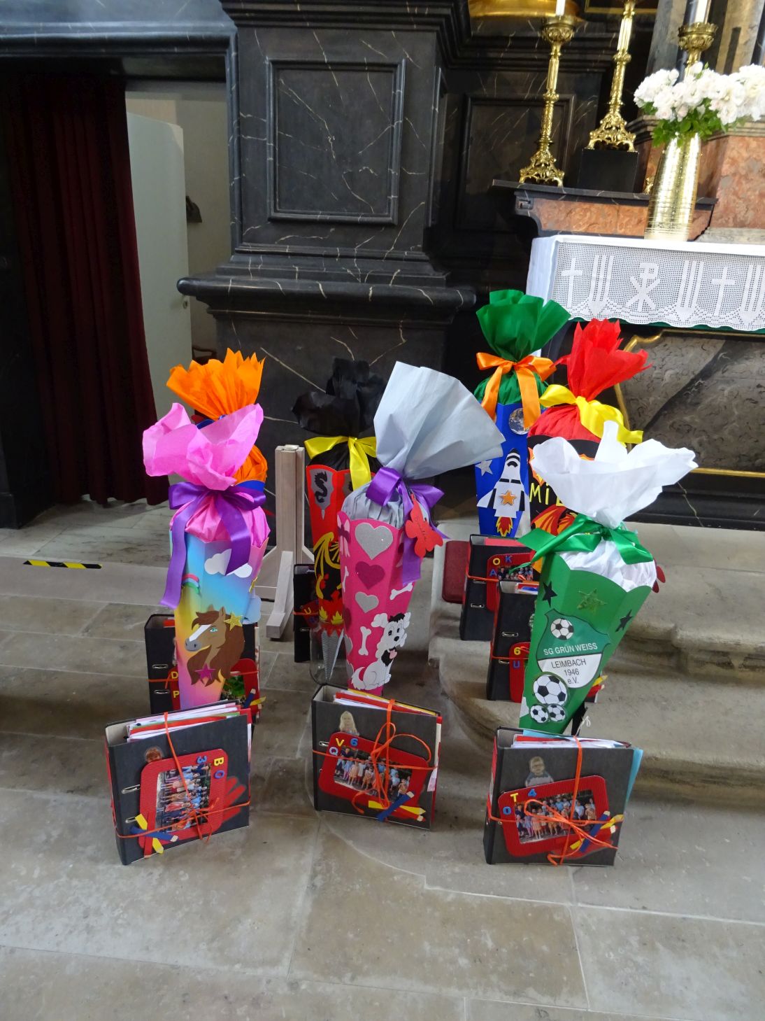 Nach dem Abschlussgottesdienst erhielten die Kinder ihre Schultüte, gebastelt von den Muttis und gefüllt von den Erzieherinnen. Das Portfolio wurde ebenfalls den Kindern überreicht. In dieser „schweren Mappe“ sind die Entwicklungsschritte und Lernerfolge der Kinder während der Kindergartenzeit dokumentiert.