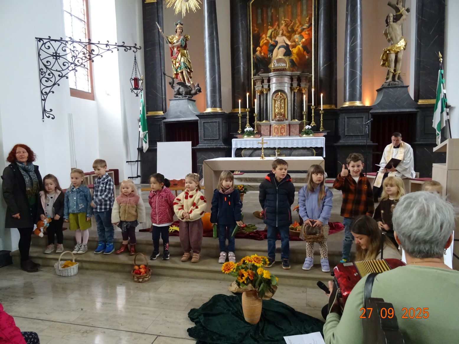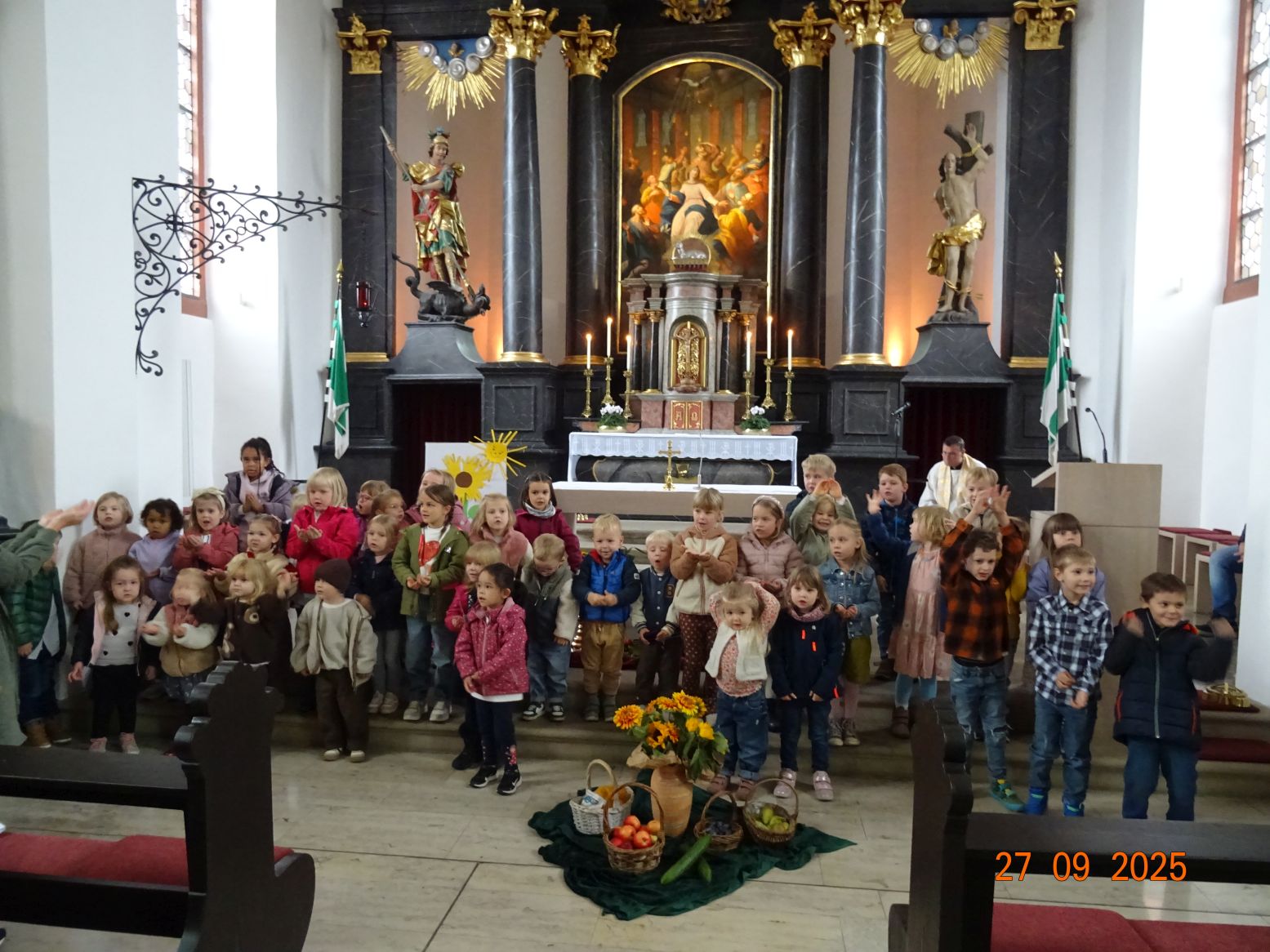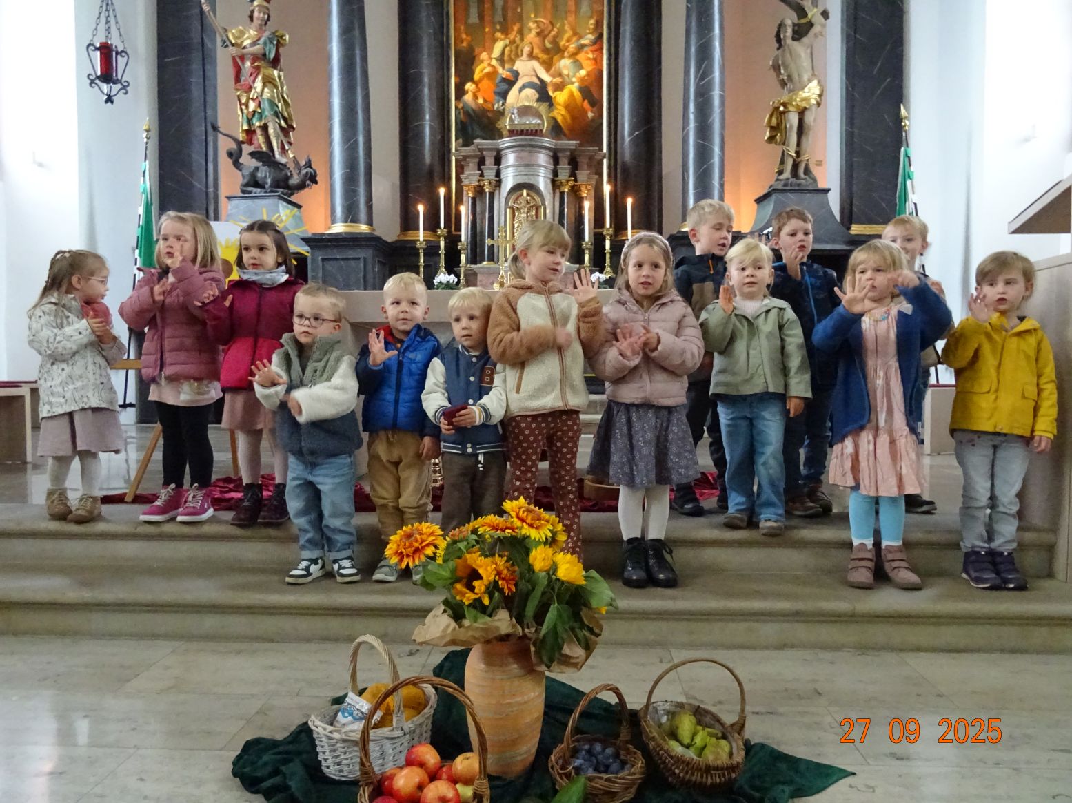 Wie aus einem kleinen Körnchen etwas Großes wächst, haben die Kinder am Beispiel der Sonnenblume in der KiTa gelernt. Im Erntedankgottesdienst dankten die Kinder und ihre Eltern für Sonne, Wind und Regen und für die Gaben, die Gott wachsen lässt. Herr Pfarrer Günther segnete die Erntegaben und begleitet die Kinder durch den Gottesdienst.
