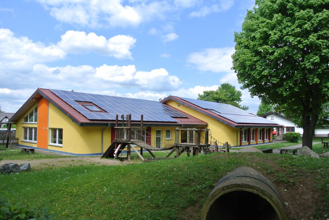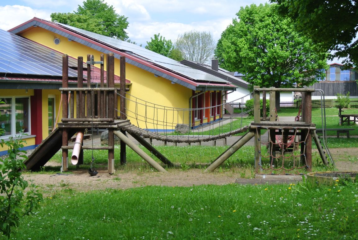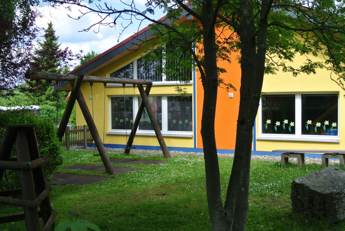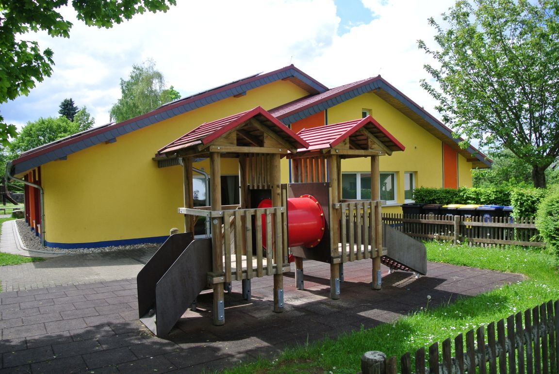 Die Kindertagesstätte, 1977 erbaut, wurde im Jahr 1993 renoviert und auf drei Gruppen erweitert. In 2010 wurde der Kindergarten grundlegend saniert und modernisiert. Drei großzügige, gemütliche und kindgerechte Gruppenräume mit zweiter Spielebene erwarten die Kinder. Außerdem haben die Kinder die Möglichkeit im Turnraum zu turnen, im pädagogischen Nutzungsraum in Kleingruppen zu arbeiten und an der Werkbank im Flur aktiv zu werden. Zahlreiche Spielgeräte im Freien – unter vielen anderen eine Vogelnestschaukel oder eine Matschanlage – bieten Anregung und Förderung für die Kinder, um deren Fähigkeiten kreativ zu entfalten.