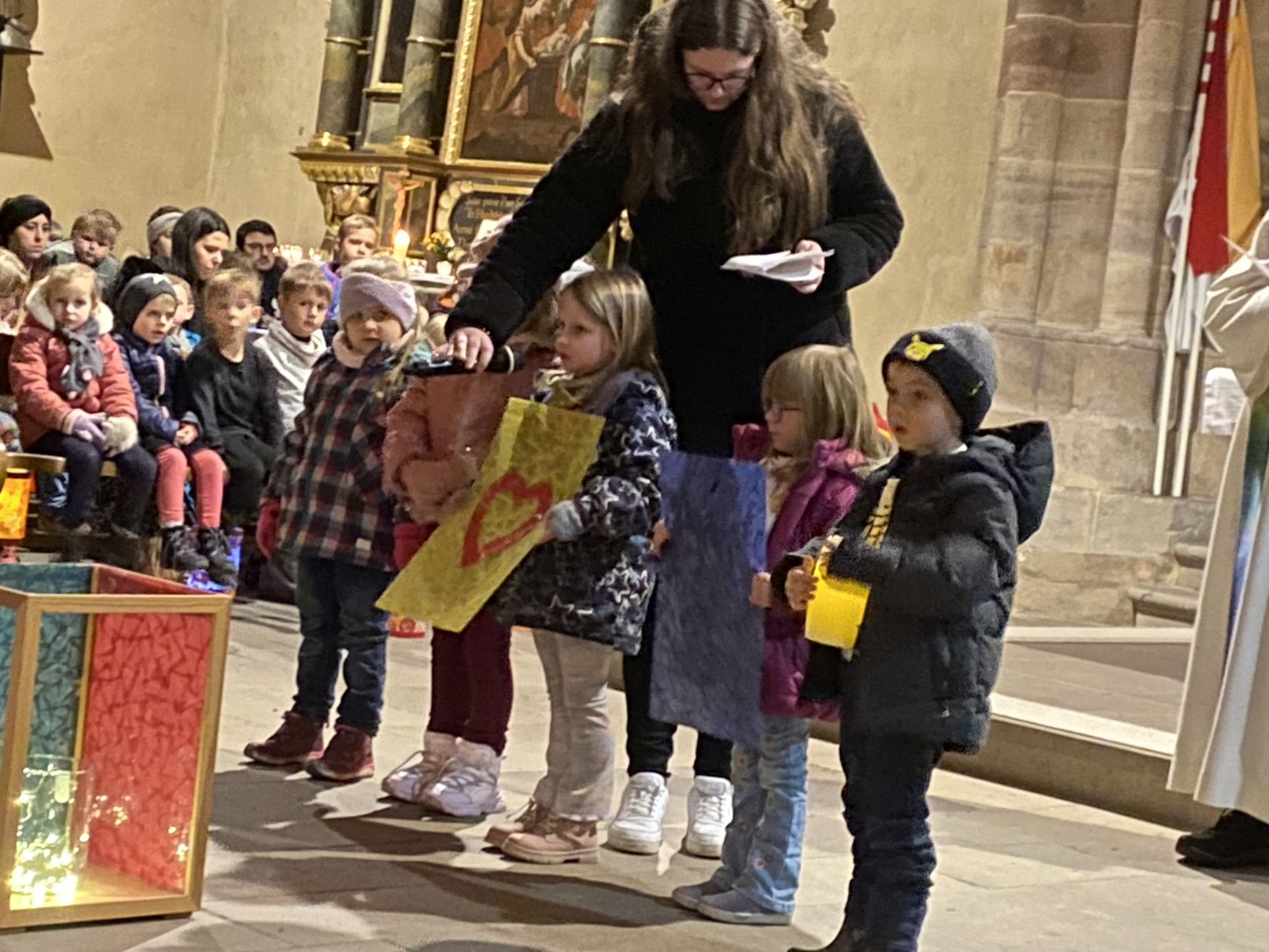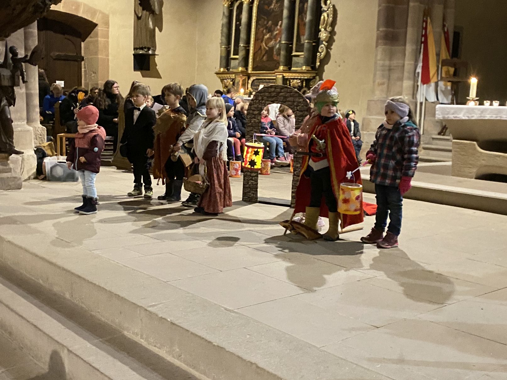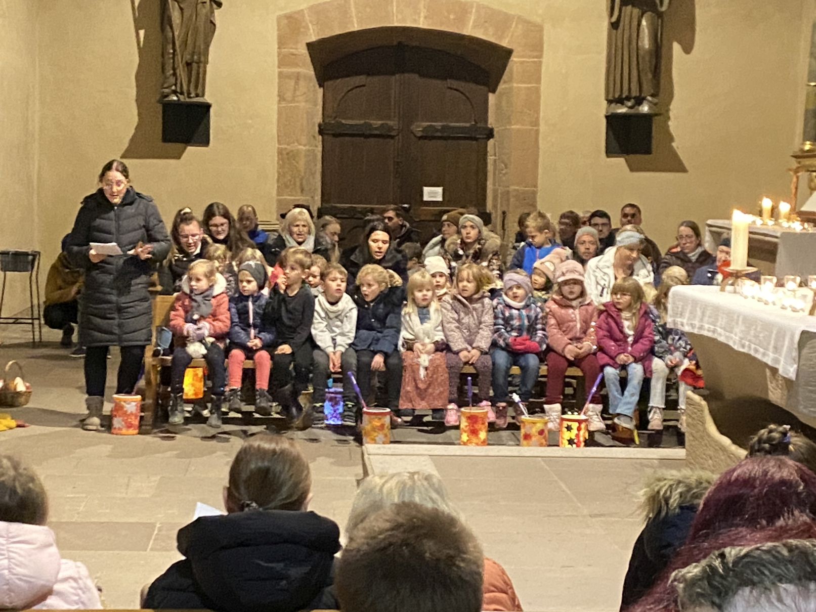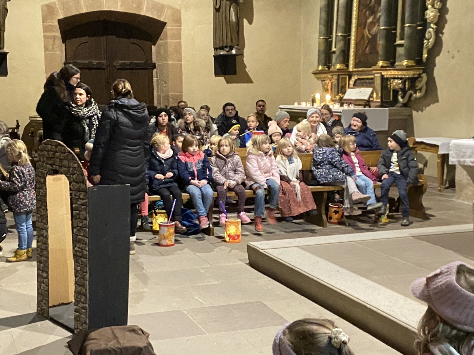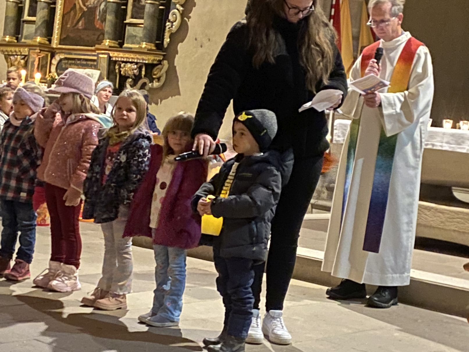 Im Anschluss an den Laternenumzug fand ein Wortgottesdienst mit Pfarrer Matthäi statt, bei dem die Kinder die Geschichte des heiligen Martin in beeindruckender Weise nacherzählten. Mit großem Engagement hatten die Erzieherinnen und Erzieher der Kita gemeinsam mit den Kindern die Martinsgeschichte, einen Lichtertanz sowie die Fürbitten eingeübt, wofür ein herzliches Dankeschön gilt!