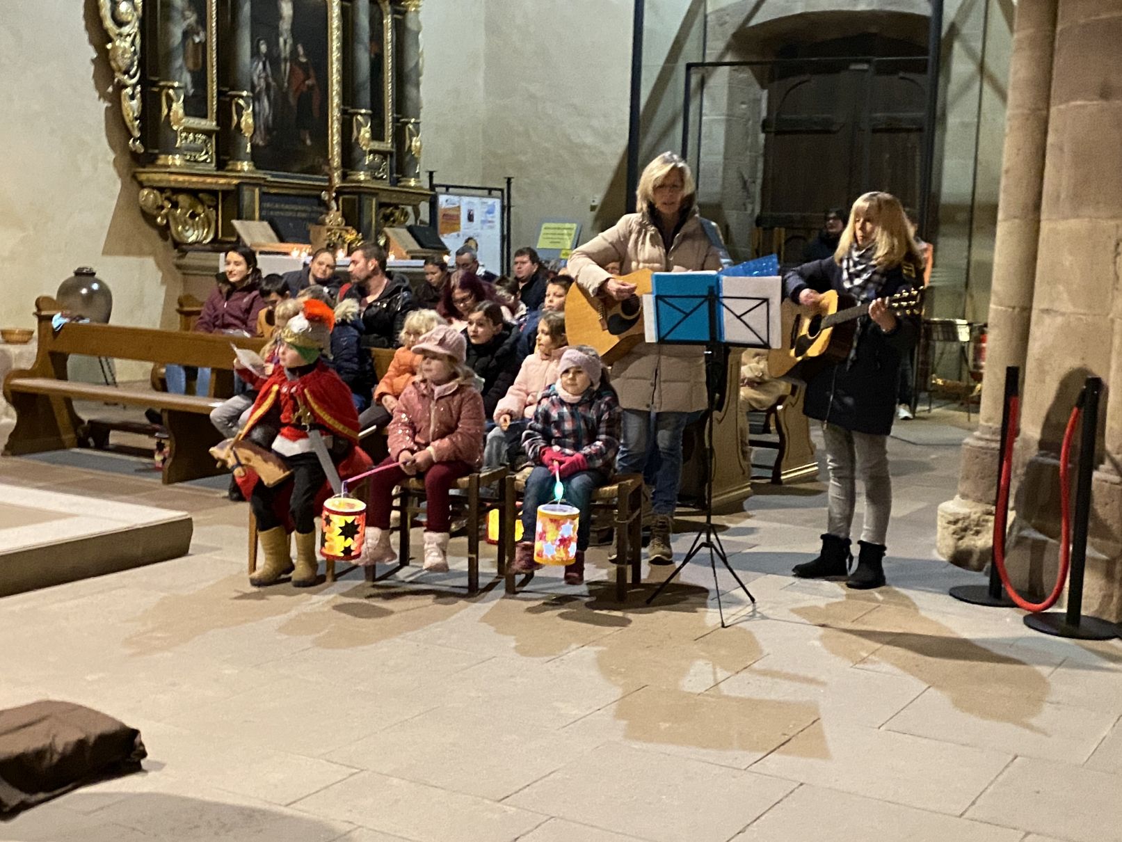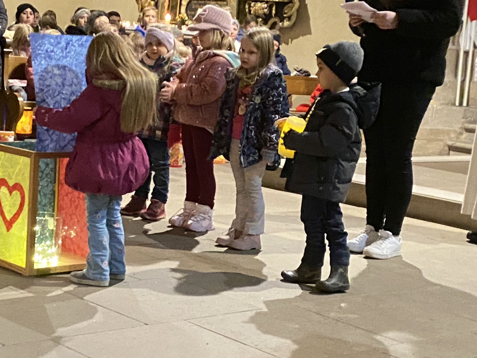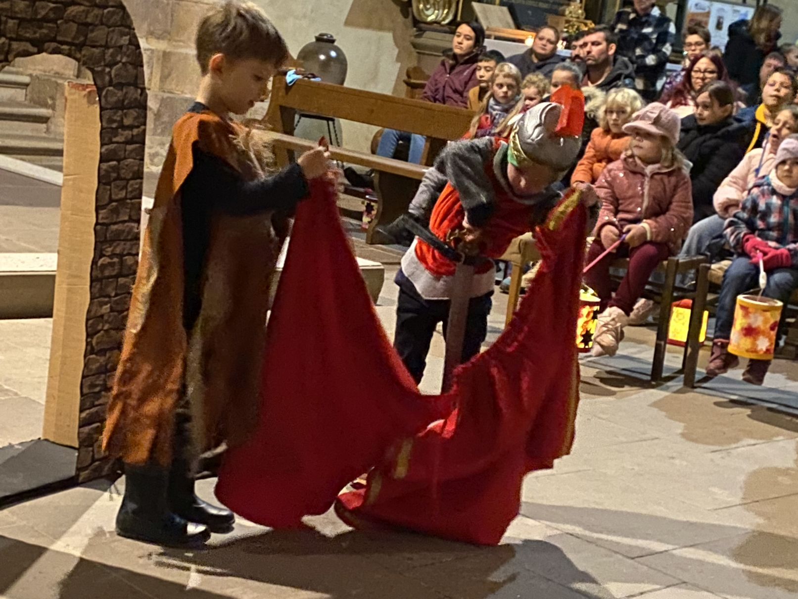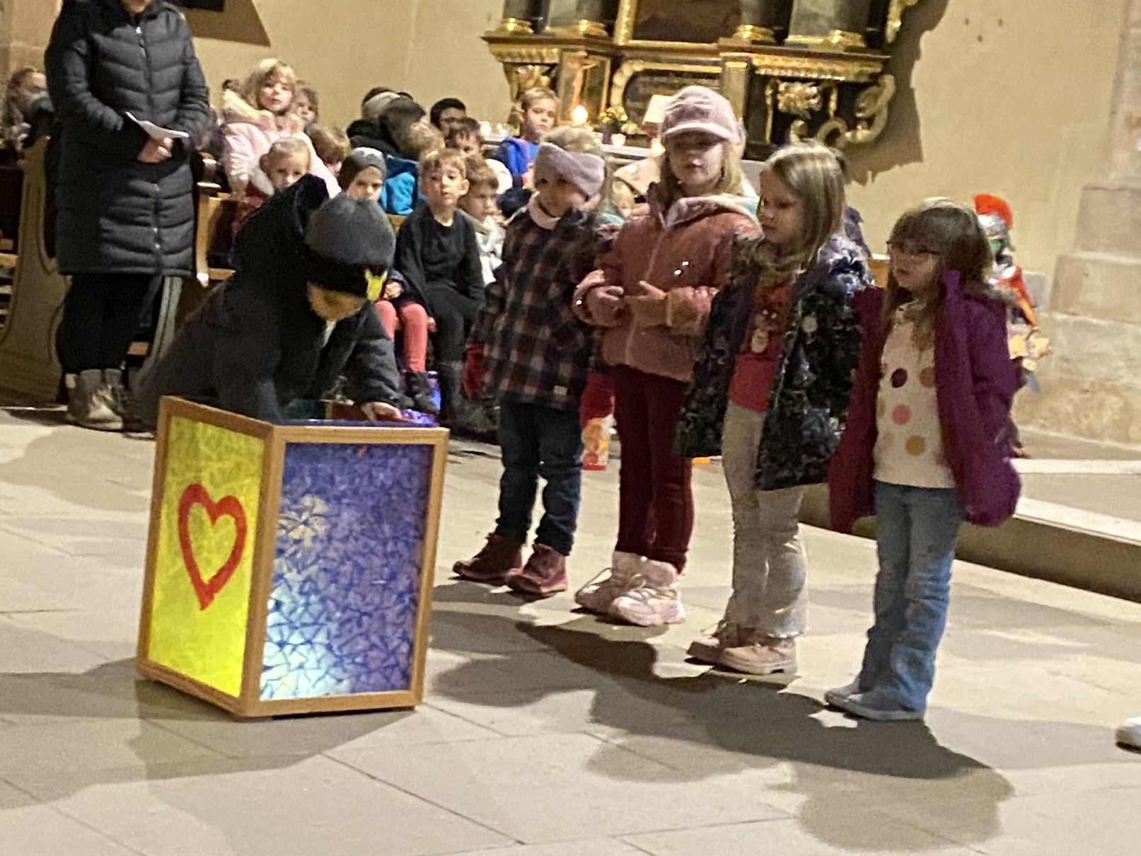 Im Anschluss an den Laternenumzug fand ein Wortgottesdienst mit Pfarrer Matthäi statt, bei dem die Kinder die Geschichte des heiligen Martin in beeindruckender Weise nacherzählten. Mit großem Engagement hatten die Erzieherinnen und Erzieher der Kita gemeinsam mit den Kindern die Martinsgeschichte, einen Lichtertanz sowie die Fürbitten eingeübt, wofür ein herzliches Dankeschön gilt!