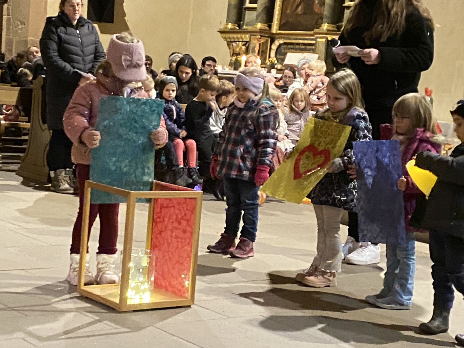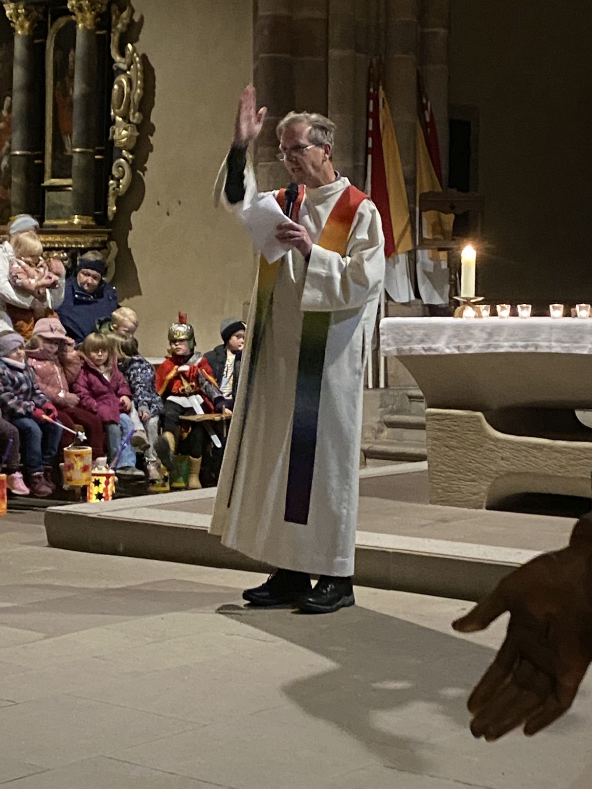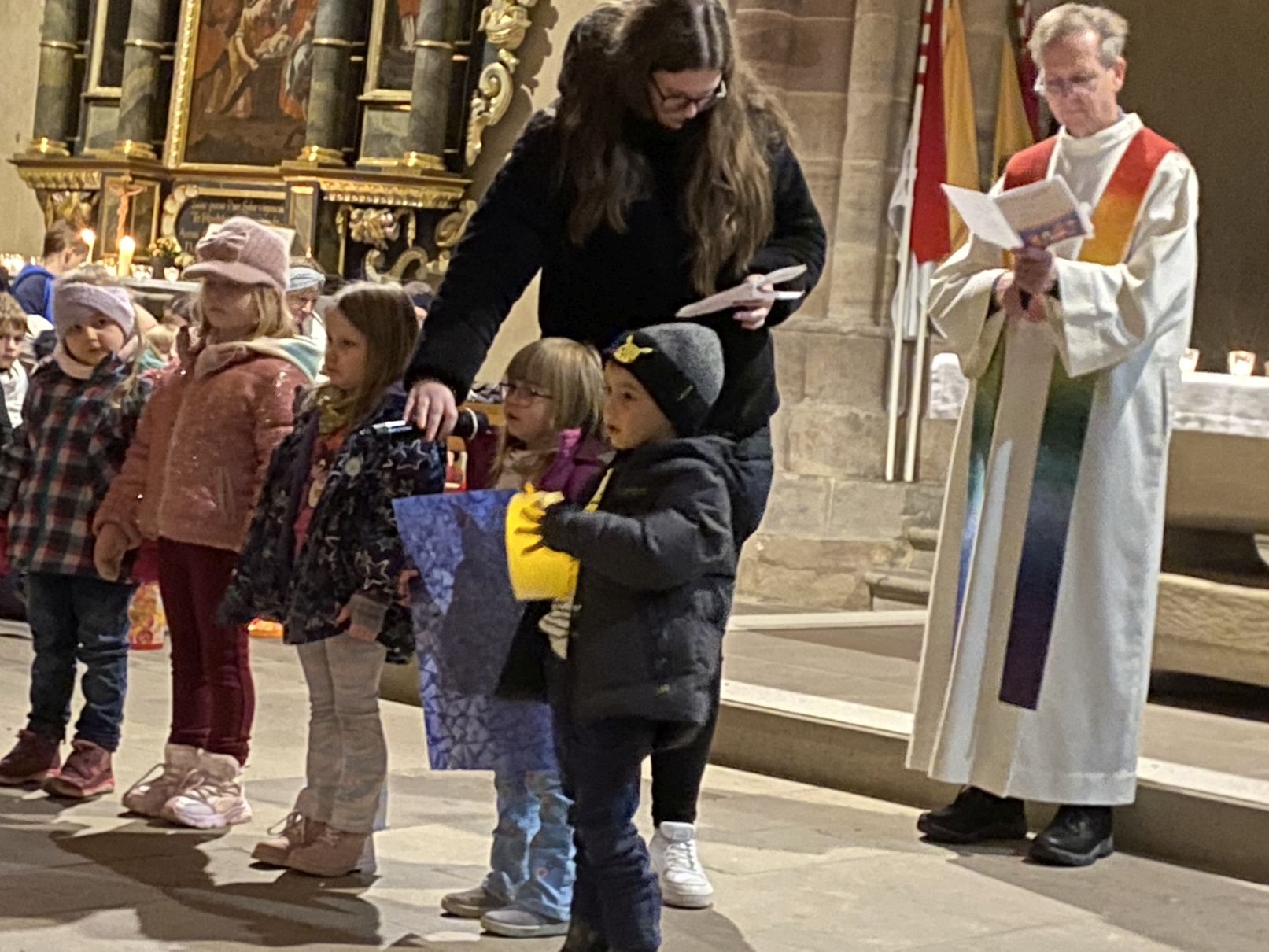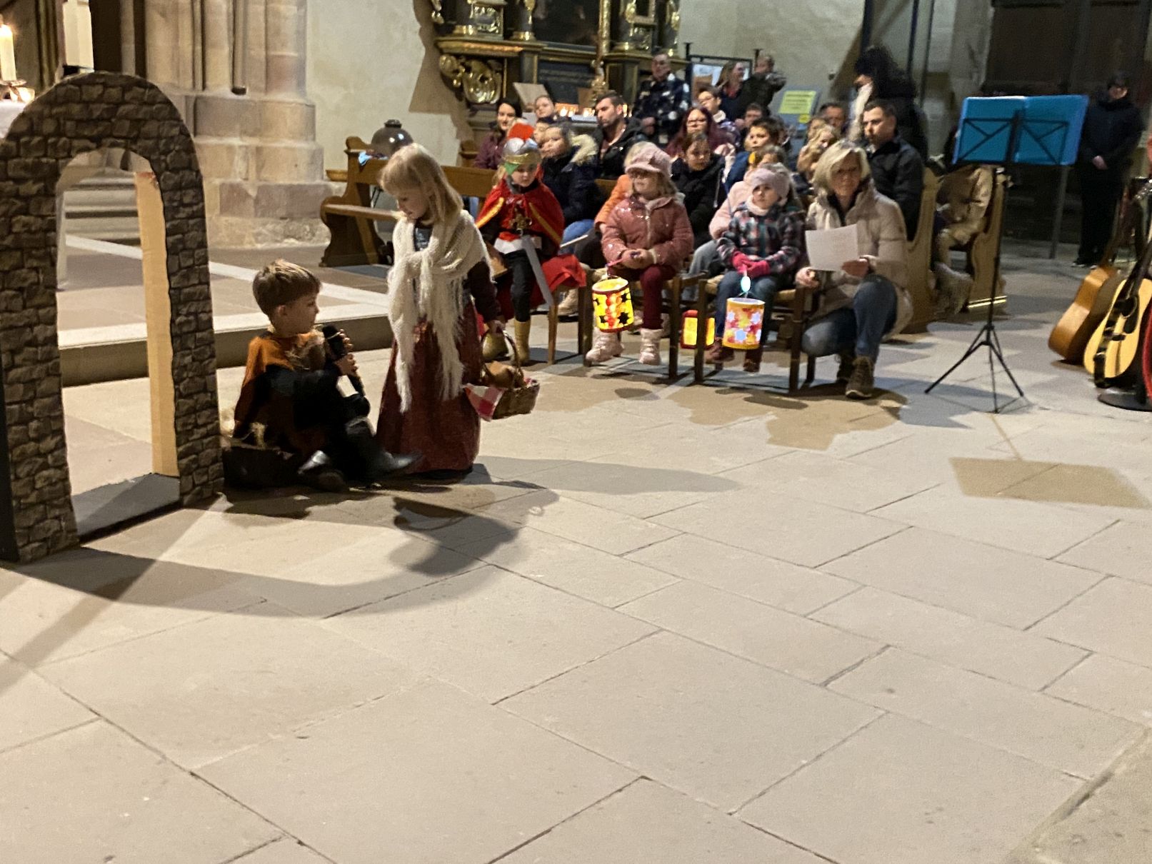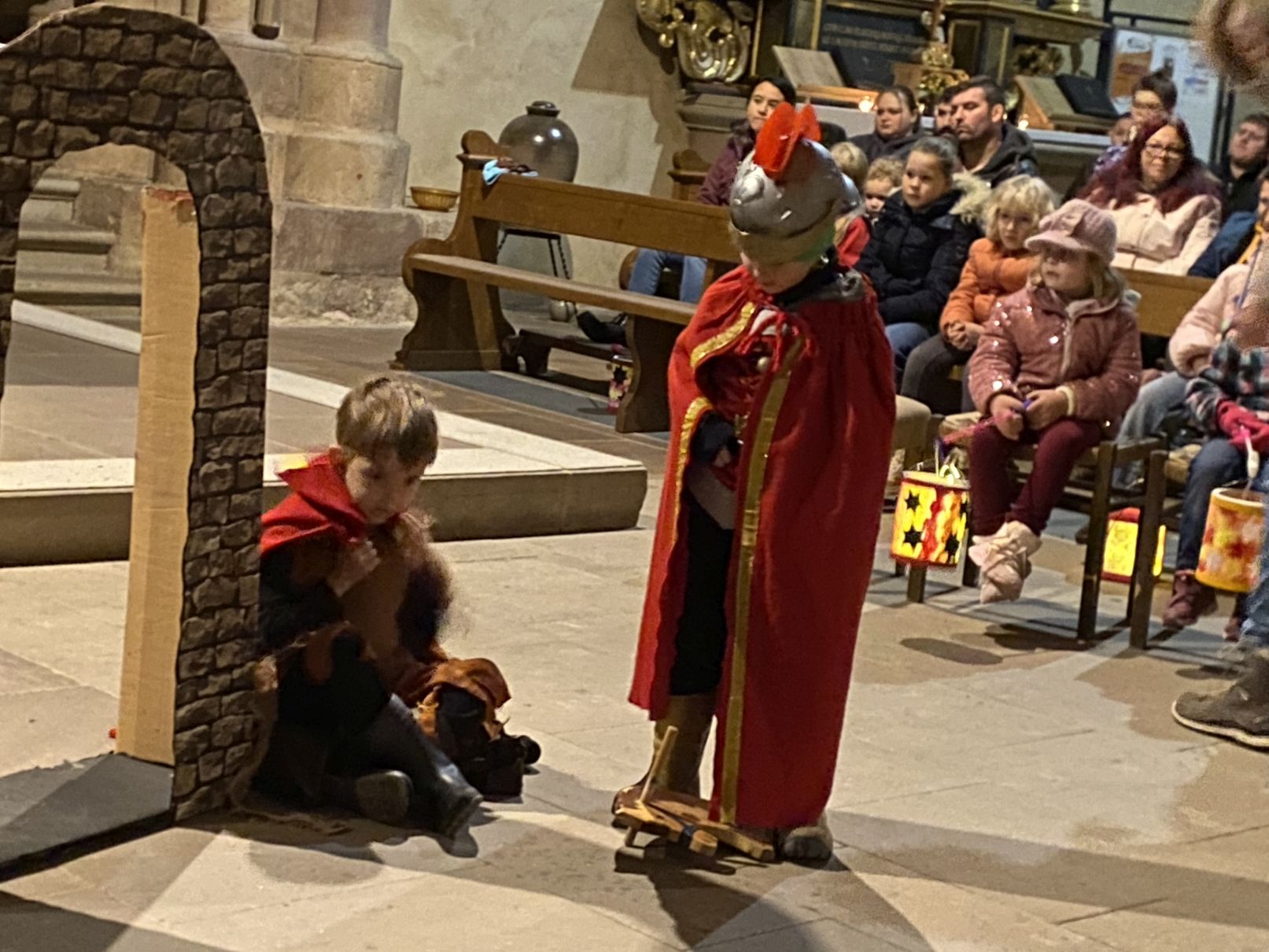 Im Anschluss an den Laternenumzug fand ein Wortgottesdienst mit Pfarrer Matthäi statt, bei dem die Kinder die Geschichte des heiligen Martin in beeindruckender Weise nacherzählten. Mit großem Engagement hatten die Erzieherinnen und Erzieher der Kita gemeinsam mit den Kindern die Martinsgeschichte, einen Lichtertanz sowie die Fürbitten eingeübt, wofür ein herzliches Dankeschön gilt!