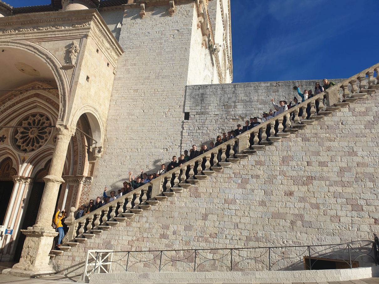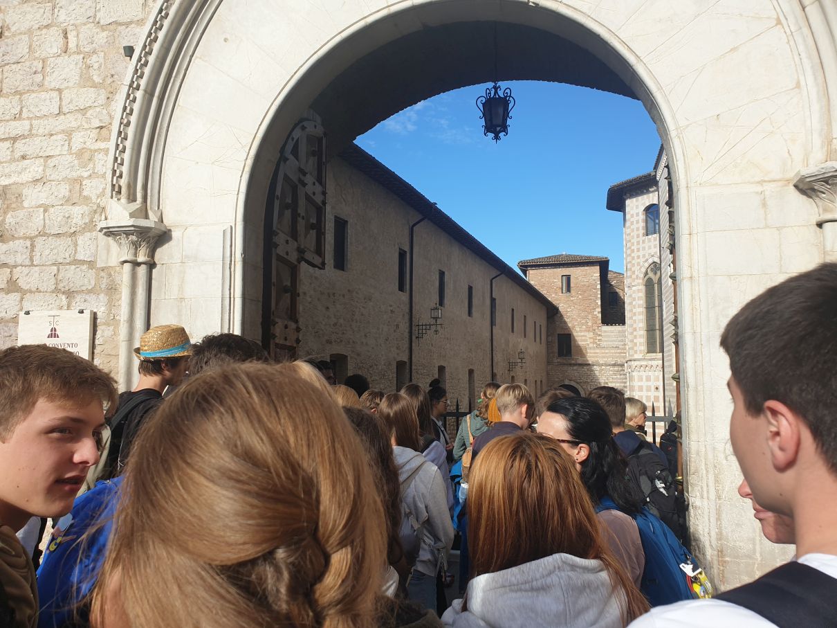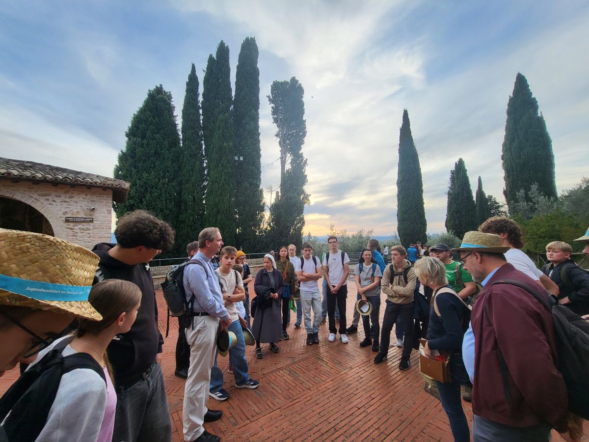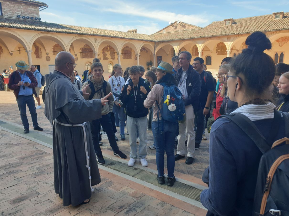Von der Kirche Santa Maria Maggiore aus verteilen wir uns in Kleingruppen in den Gässchen von Assisi, um etwas zu essen. Im Rahmen einer Stadtrallye, die Gemeindereferentin Klarissa Nitsche vorbereitet hat, erkunden wir noch die Basilika Santa Chiara. Sie ist der heiligen Klara geweiht, die nach dem Vorbild von Franziskus und in freundschaftlichem Austausch mit ihm den Klarissenorden in Assisi gegründet hat.