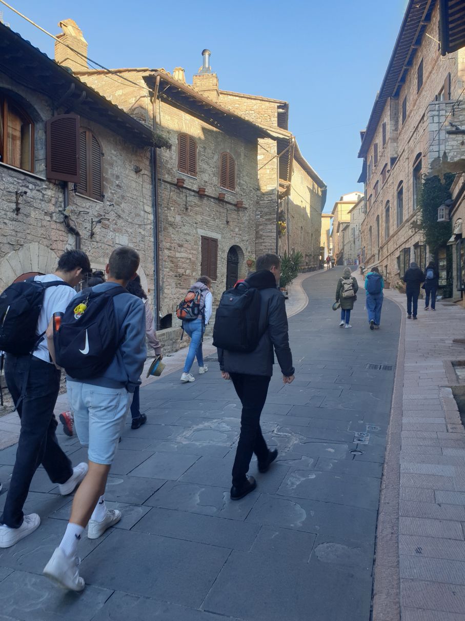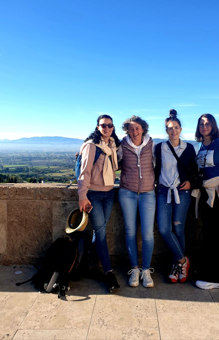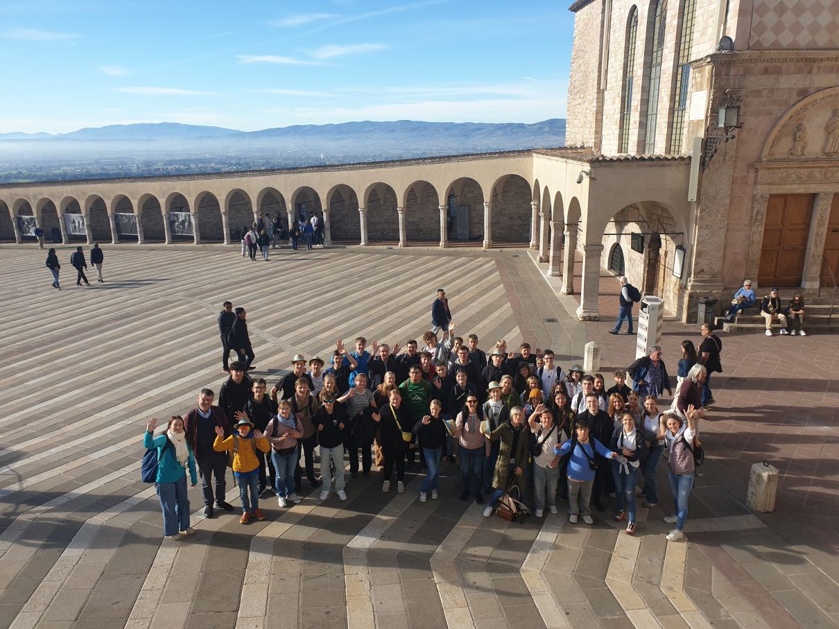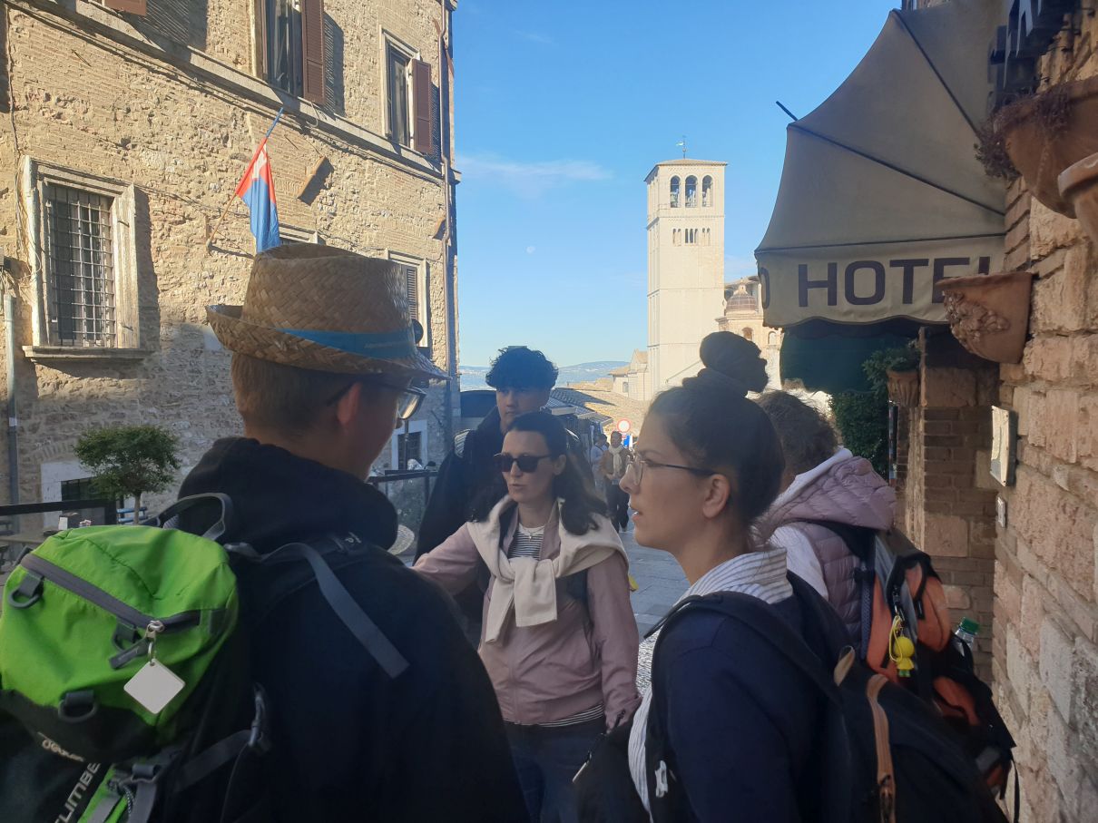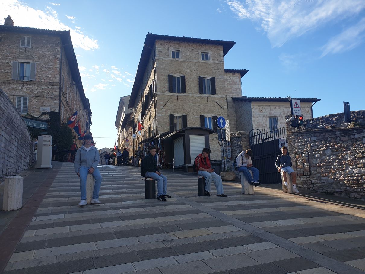 Von der Kirche Santa Maria Maggiore aus verteilen wir uns in Kleingruppen in den Gässchen von Assisi, um etwas zu essen. Im Rahmen einer Stadtrallye, die Gemeindereferentin Klarissa Nitsche vorbereitet hat, erkunden wir noch die Basilika Santa Chiara. Sie ist der heiligen Klara geweiht, die nach dem Vorbild von Franziskus und in freundschaftlichem Austausch mit ihm den Klarissenorden in Assisi gegründet hat.