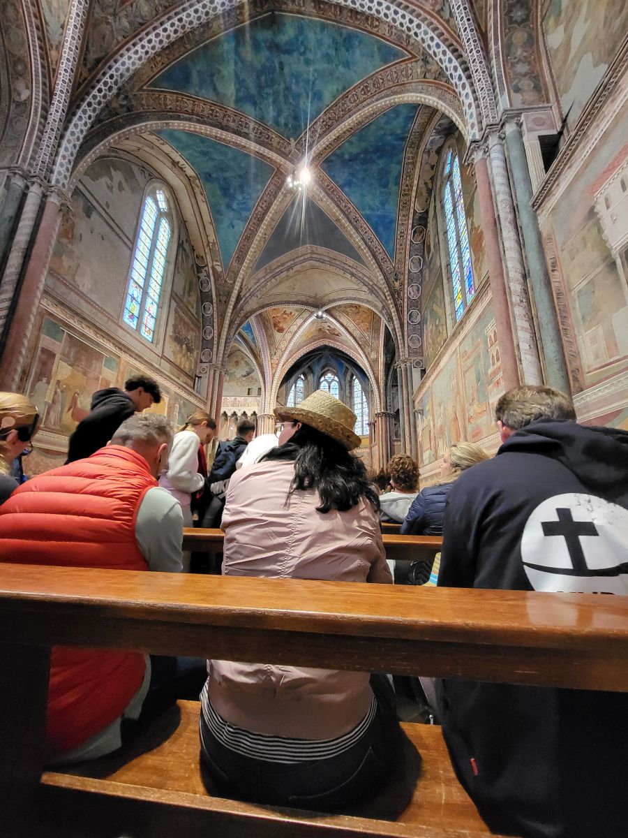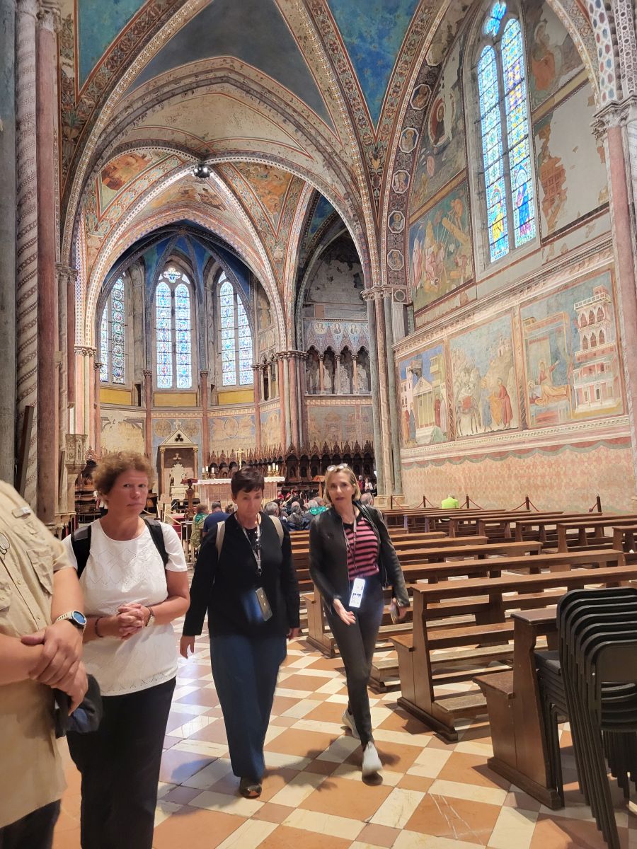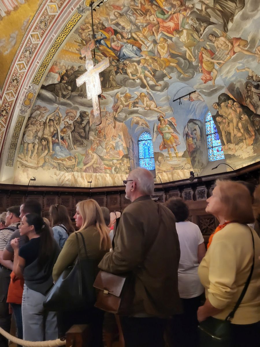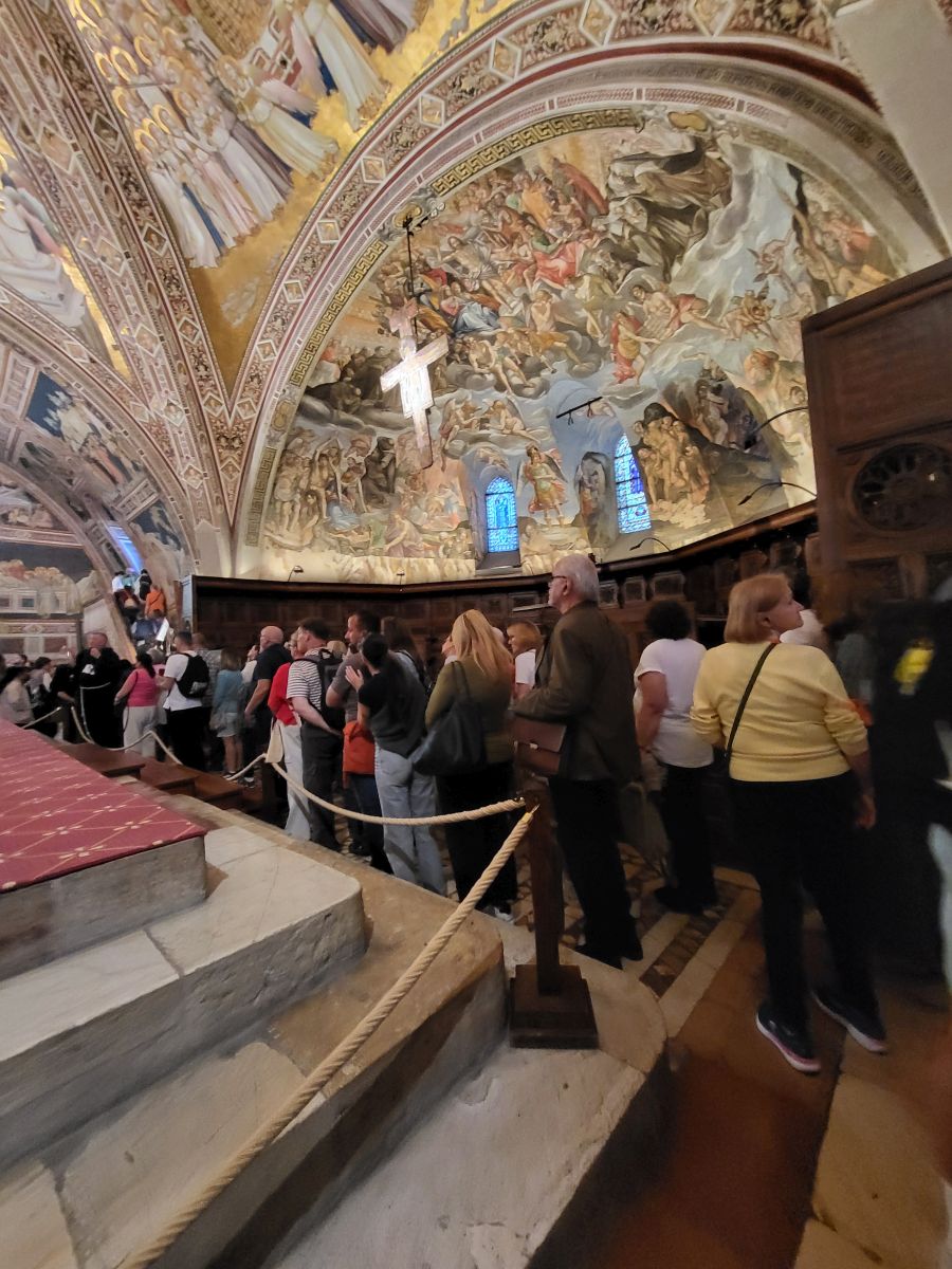 In seiner Predigt zeigt Pfarrer Uwe Hahner auf, was wir am Beispiel des heiligen Franziskus erkennen können, nämlich dass jeder Mensch seinen eigenen Weg finden und gehen muss und dass Gott uns auf diesem Weg nicht im Stich lässt. Sogar wenn manchmal - wie in der Beziehung des Heiligen mit seinem irdischen Vater - ein harter Cut nötig sein sollte, könne man sich der Liebe Gottes sicher sein. Nach der Messe treffen wir uns draußen vor der Basilika San Francesco mit Bruder Thomas, der uns erst einmal mit Audioguides und In-Ear-Kopfhörern versorgt, damit wir seiner auf Deutsch mit Pfälzer Zungenschlag gehaltenen Führung lauschen können. Bruder Thomas geleitet uns in die große Kirche hinein, die aus einer unteren und einer oberen Basilika besteht. Sehr anschaulich und kurzweilig erklärt er uns die kunstgeschichtliche Bedeutung der Wandmalereien und weist darahin, dass dort verschiedene Stile nebeneinander sichtbar sind. Während zum Beispiel ein Fresko im Ikonenmalstil darauf abziele, in einer idealisierenden Bildsprache die Ewigkeit sichtbar zu machen, zeige das daneben stehende Wandbild, welches dem Künstler Giotto zugeschrieben wird, mit seinen lebensnah gemalten Figuren und der deutlichen Raumtiefe einen ganz neuen und anderen Malstil, dem es um ein Abbild der Wirklichkeit geht. Auch einen Bilderzyklus mit Szenen aus dem Alten und Neuen Testaments stellt uns Bruder Thomas vor und erklärt viel Wissenswertes über die beiden Teile der Basilika. Mit großem Applaus danken wir dem Franziskanerbruder und machen uns dann auf zu dem Gotteshaus in Assisi, in dem der gerade heiliggesprochene Carlo Acutis ruht. An einer Schlange von Pilgern stellen wir uns an, um den 2006 als Jugendlichen an Leukämie verstorbenen "Influenzer Gottes" in seinem Glassarg zu sehen und um ein bisschen von seiner Glaubenskraft und seiner Aura mitzunehmen.