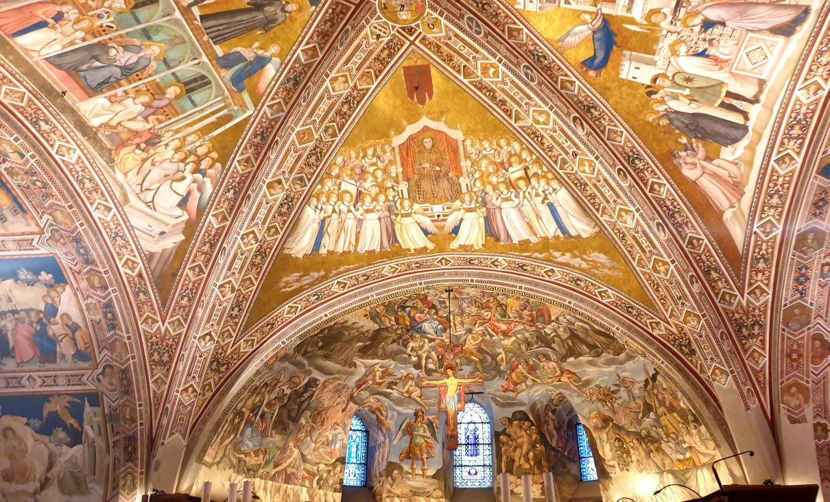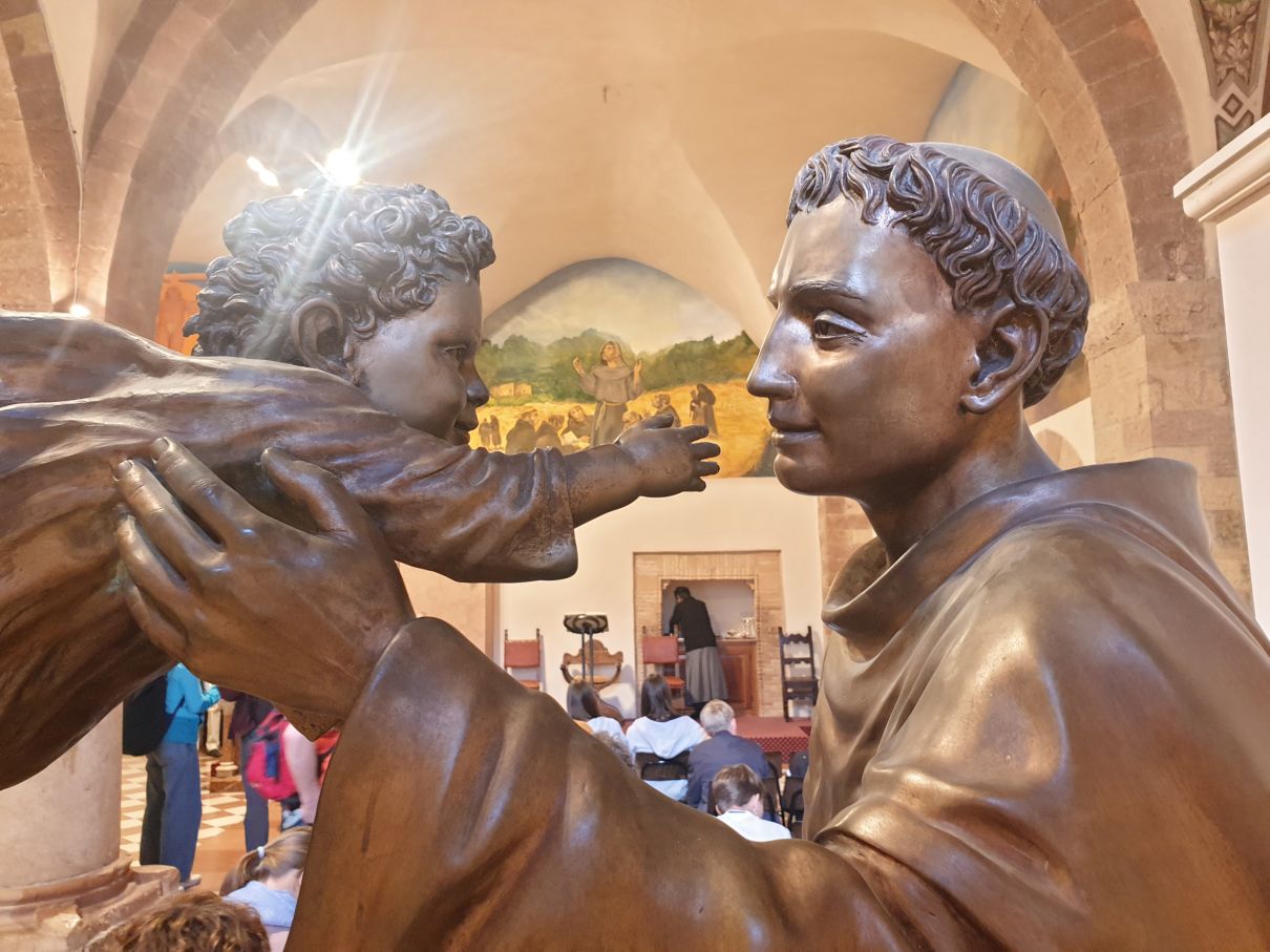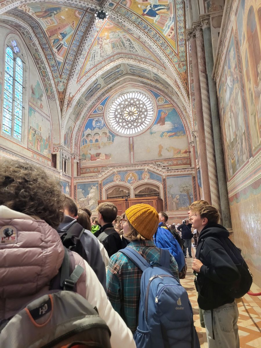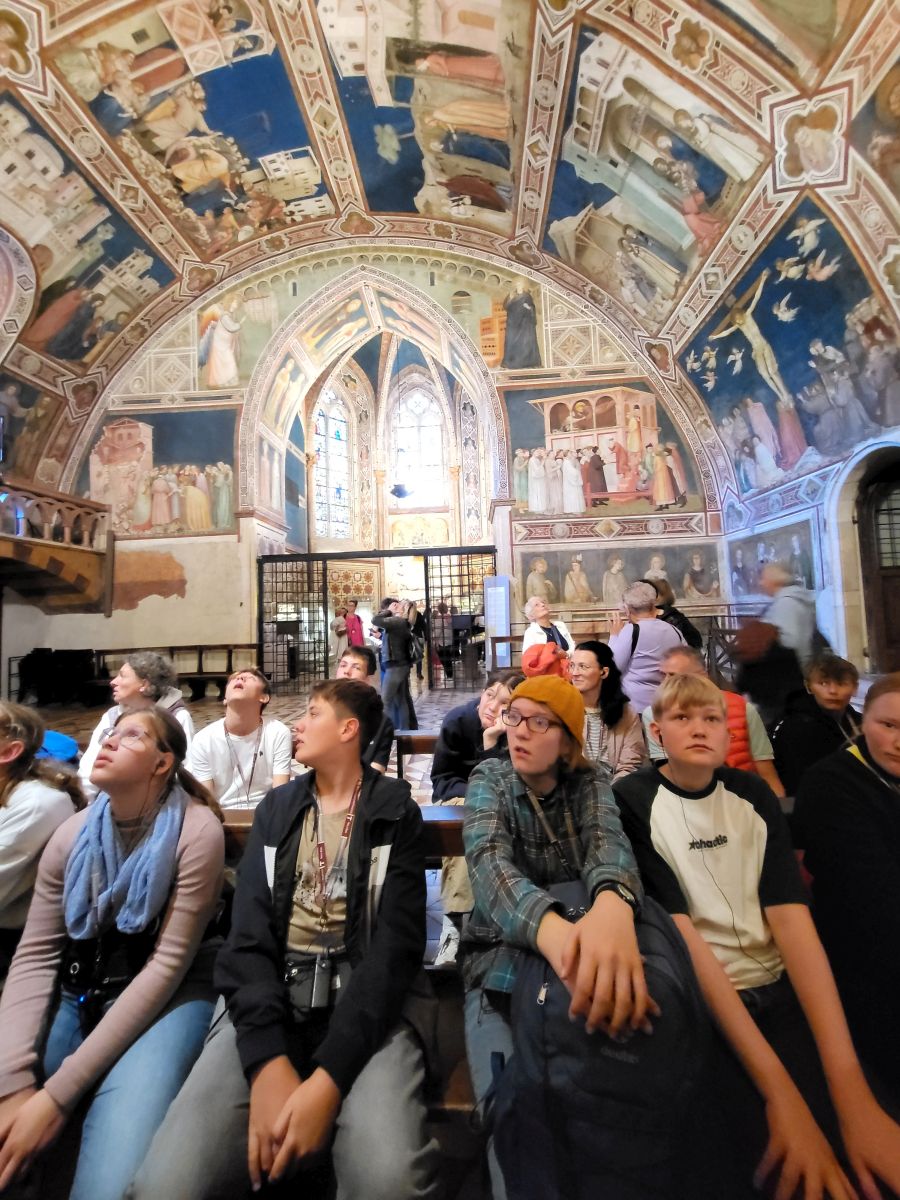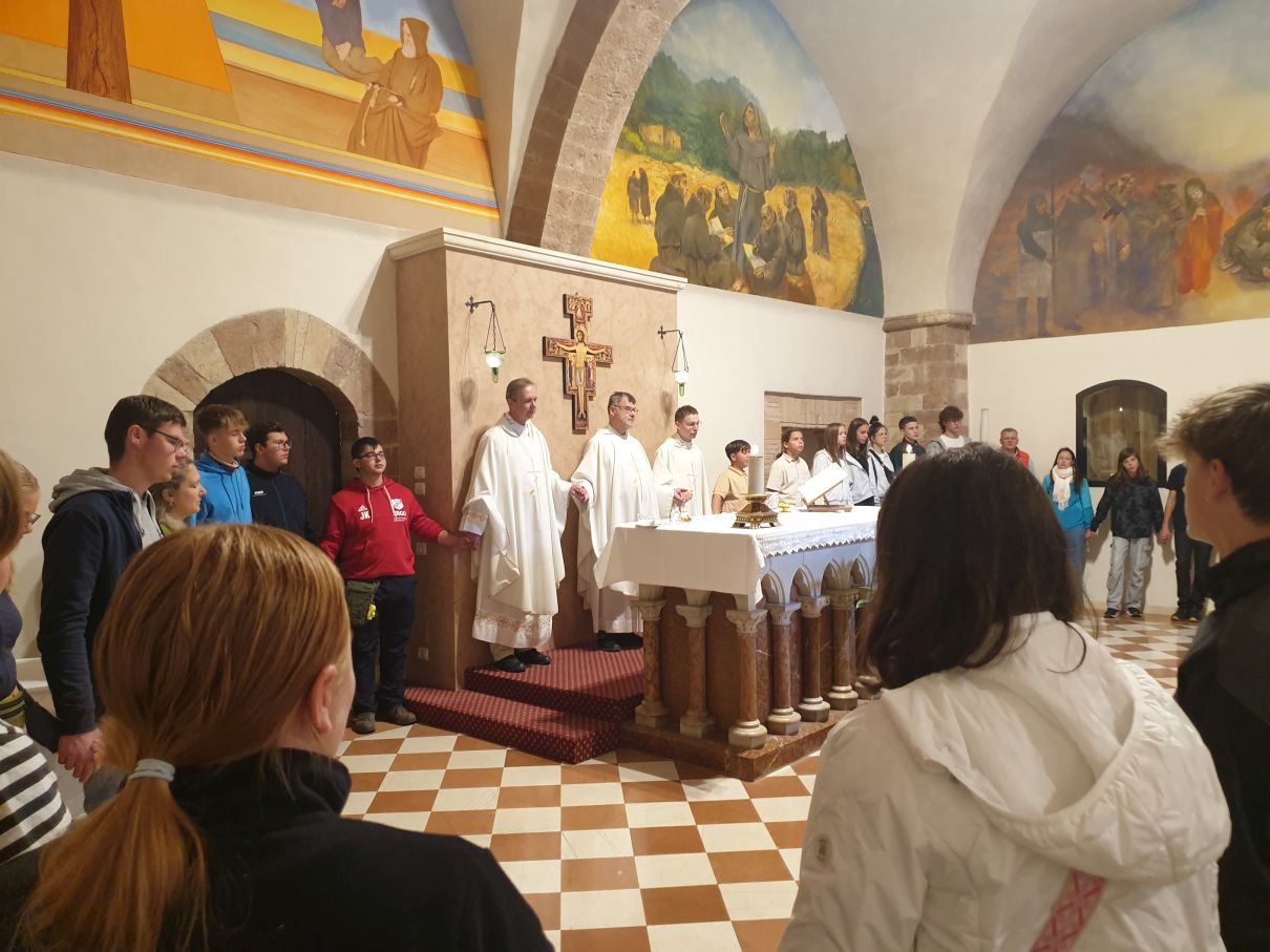 In seiner Predigt zeigt Pfarrer Uwe Hahner auf, was wir am Beispiel des heiligen Franziskus erkennen können, nämlich dass jeder Mensch seinen eigenen Weg finden und gehen muss und dass Gott uns auf diesem Weg nicht im Stich lässt. Sogar wenn manchmal - wie in der Beziehung des Heiligen mit seinem irdischen Vater - ein harter Cut nötig sein sollte, könne man sich der Liebe Gottes sicher sein. Nach der Messe treffen wir uns draußen vor der Basilika San Francesco mit Bruder Thomas, der uns erst einmal mit Audioguides und In-Ear-Kopfhörern versorgt, damit wir seiner auf Deutsch mit Pfälzer Zungenschlag gehaltenen Führung lauschen können. Bruder Thomas geleitet uns in die große Kirche hinein, die aus einer unteren und einer oberen Basilika besteht. Sehr anschaulich und kurzweilig erklärt er uns die kunstgeschichtliche Bedeutung der Wandmalereien und weist darahin, dass dort verschiedene Stile nebeneinander sichtbar sind. Während zum Beispiel ein Fresko im Ikonenmalstil darauf abziele, in einer idealisierenden Bildsprache die Ewigkeit sichtbar zu machen, zeige das daneben stehende Wandbild, welches dem Künstler Giotto zugeschrieben wird, mit seinen lebensnah gemalten Figuren und der deutlichen Raumtiefe einen ganz neuen und anderen Malstil, dem es um ein Abbild der Wirklichkeit geht. Auch einen Bilderzyklus mit Szenen aus dem Alten und Neuen Testaments stellt uns Bruder Thomas vor und erklärt viel Wissenswertes über die beiden Teile der Basilika. Mit großem Applaus danken wir dem Franziskanerbruder und machen uns dann auf zu dem Gotteshaus in Assisi, in dem der gerade heiliggesprochene Carlo Acutis ruht. An einer Schlange von Pilgern stellen wir uns an, um den 2006 als Jugendlichen an Leukämie verstorbenen "Influenzer Gottes" in seinem Glassarg zu sehen und um ein bisschen von seiner Glaubenskraft und seiner Aura mitzunehmen.