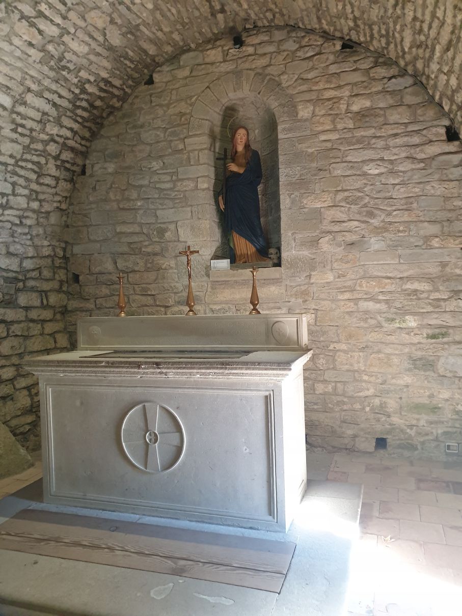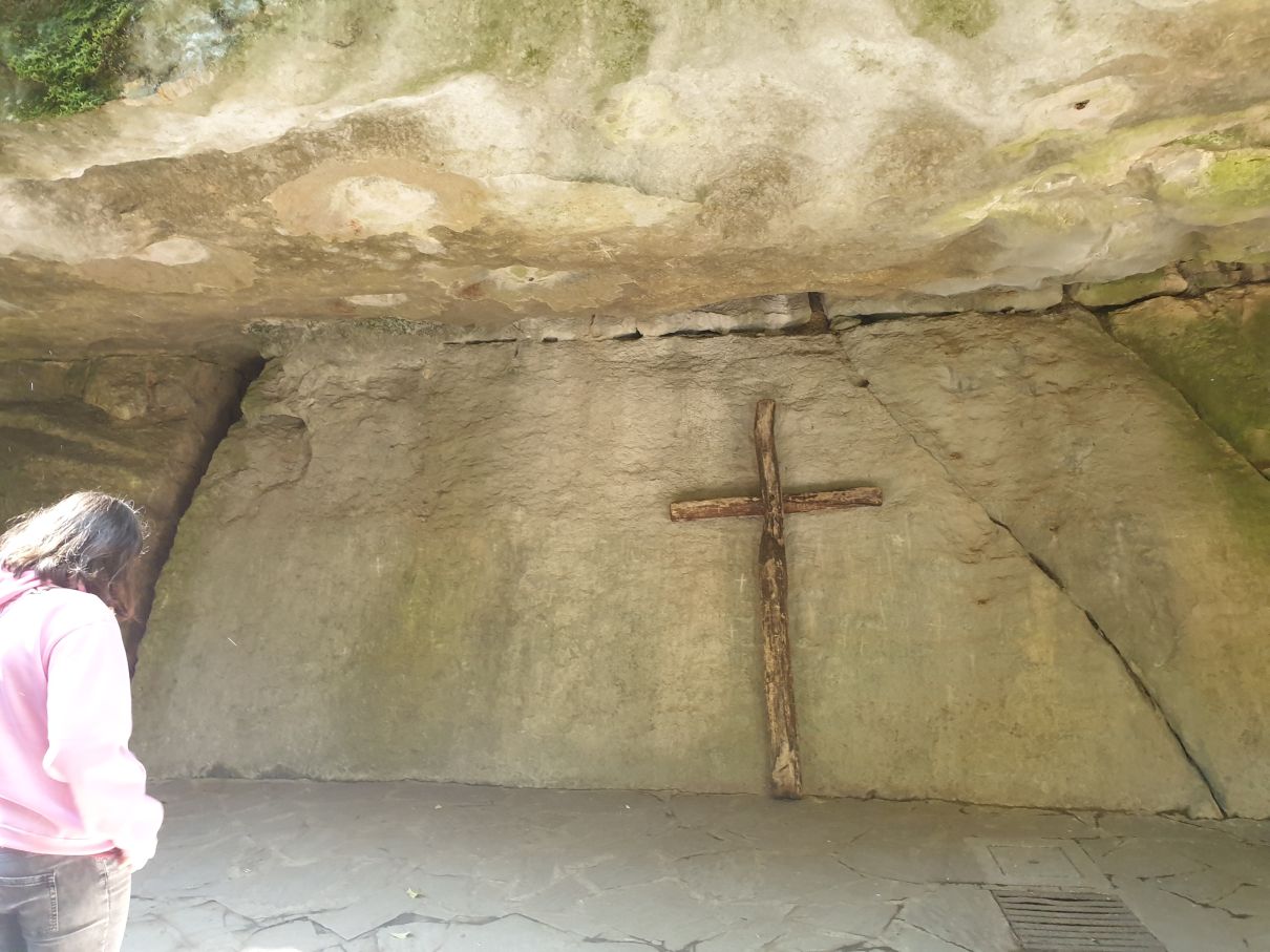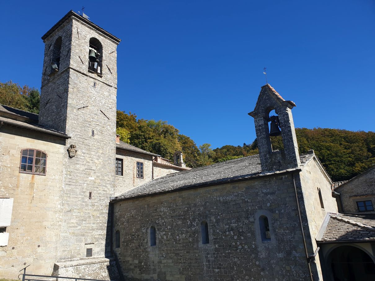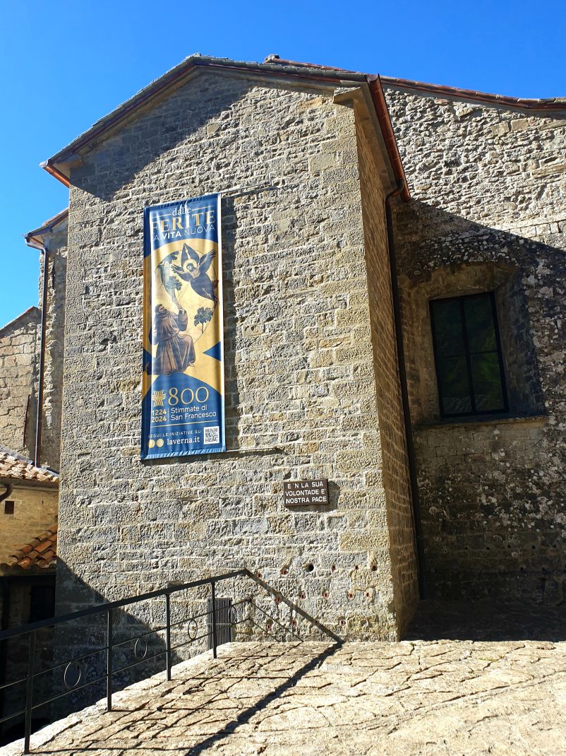 Heute ist unser erster Rückreisetag. Am Morgen frühstücken wir noch einmal in unserem Hotel in Santa Maria degli Angeli, Assisi. Die Koffer sind gepackt und im Bus verstaut. Weil unsere Organisatorinnen den ersten Fahrtabschnitt zeitlich komfortabel geplant haben, können wir - bevor wir endgültig Richtung Heimat aufbrechen - erst noch die Klosteranlage La Verna auf gut 1100 m Höhe in den toskanischen Bergen besichtigen. Dorthin hatte sich der heilige Franziskus zu seinen Lebzeiten mehrfach zurückgezogen, um im Schutz von Felsvorsprüngen und bald auch in schlichten Kapellen zu beten. Und hier soll er spät in seinem Leben auch die Stigmata, die Wundmale Christi, empfangen haben. Es ist interessant, inmitten der herrlichen Berglandschaft, die sich uns wieder mit strahlend blauem Himmel präsentiert, die Glaubensorte des Heiligen zu entdecken. Sie vermitteln uns einen Eindruck von seiner Armutsidee, seiner tiefen Frömmigkeit und seiner Naturverbundenheit.