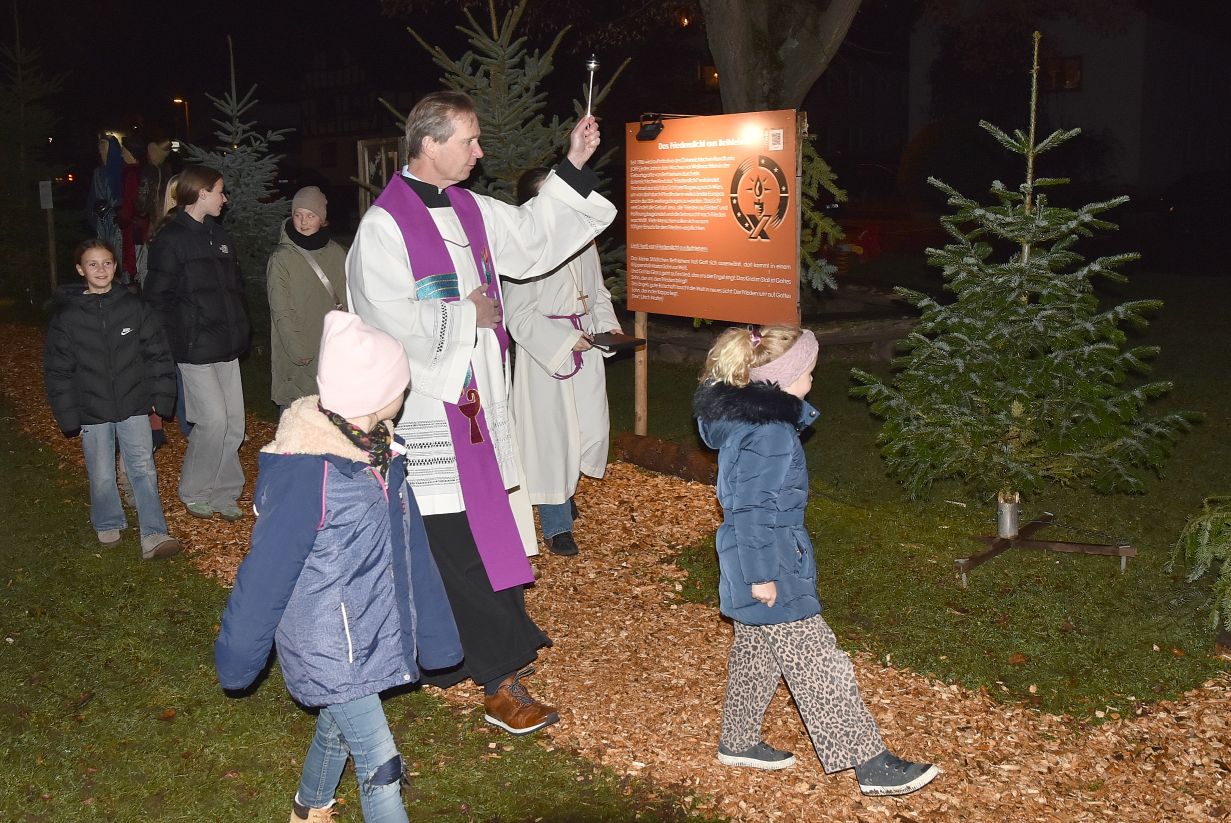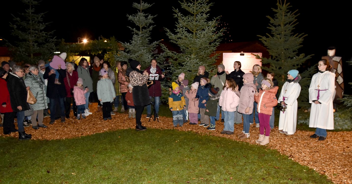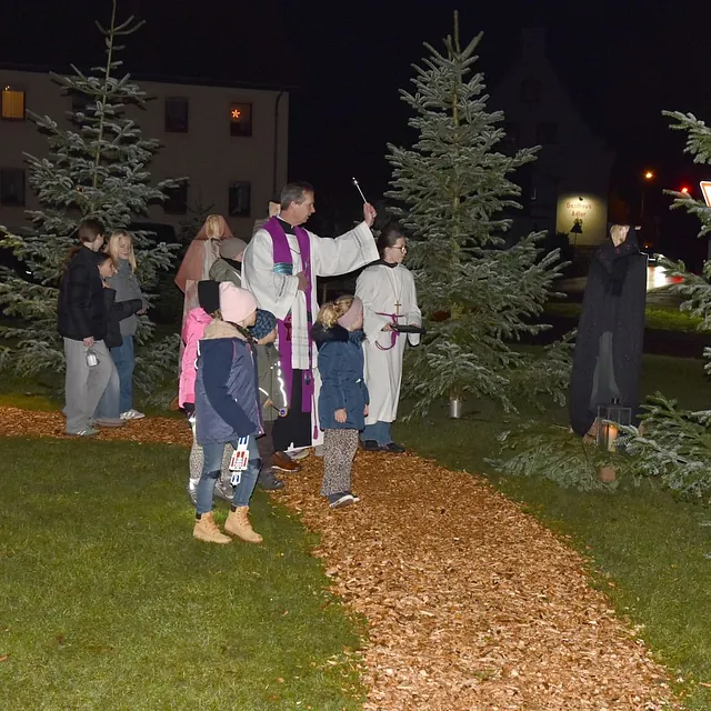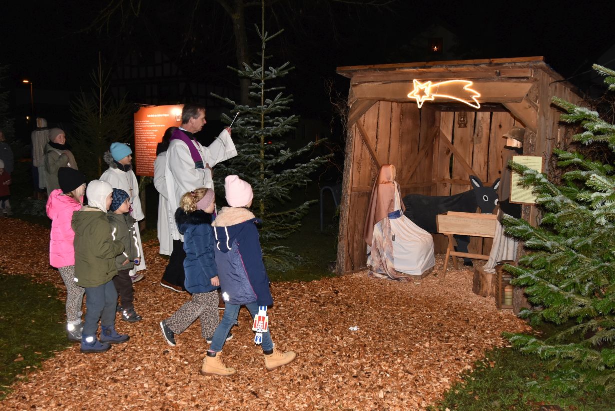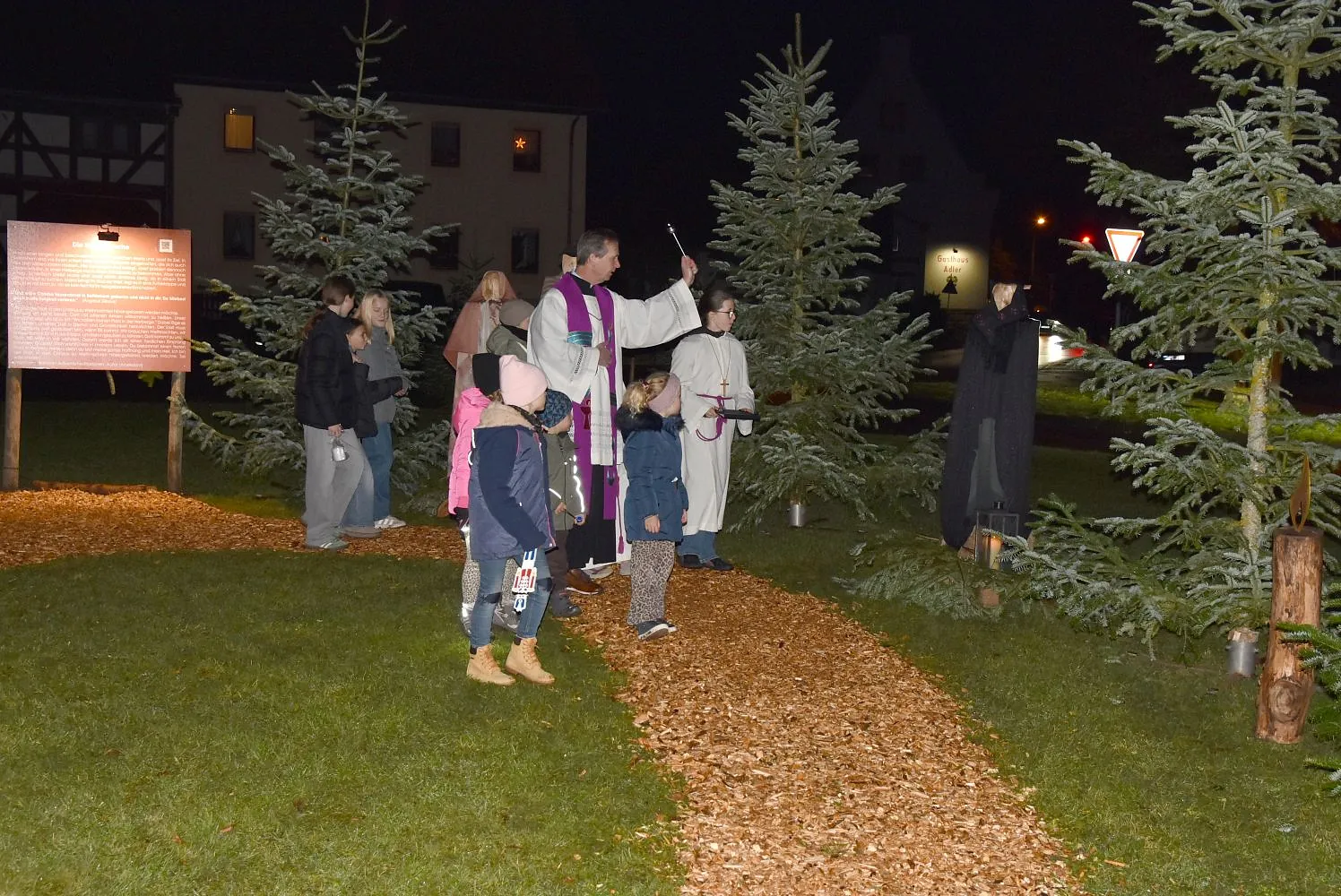 Nach einem Segensgebet zog Pfarrer Matthäi gemeinsam mit Messdienerinnen und Kindern von Station zu Station und segnete diese mit Weihwasser. Mit dem Schlusssegen und dem Lied „Macht hoch die Tür, die Tor macht weit“ endete die Eröffnungsfeier. Musikalisch gestaltet wurde sie vom Kindersingkreis Rasdorf unter der Leitung von Stephanie Hardegen und Jacqueline Mathes, der unter anderem „Macht die Türen auf“ und „Eins, Zwei, Drei, Vier – Weihnachten steht vor der Tür“ sang. Nadine Lenz dankte zudem dem Aufbauteam unter der Leitung von Theo Lenz, dem gemeindlichen Bauhof sowie den Baumpaten und Sponsoren für ihre Unterstützung.