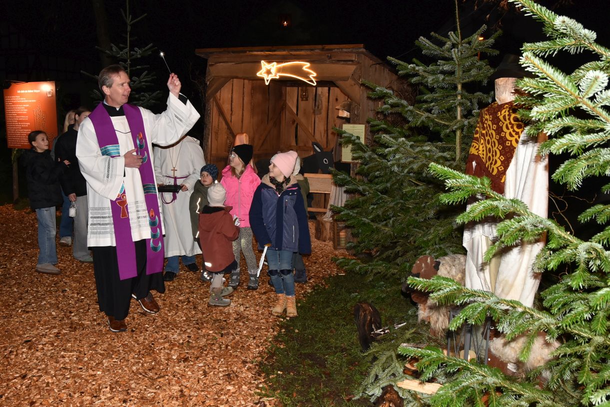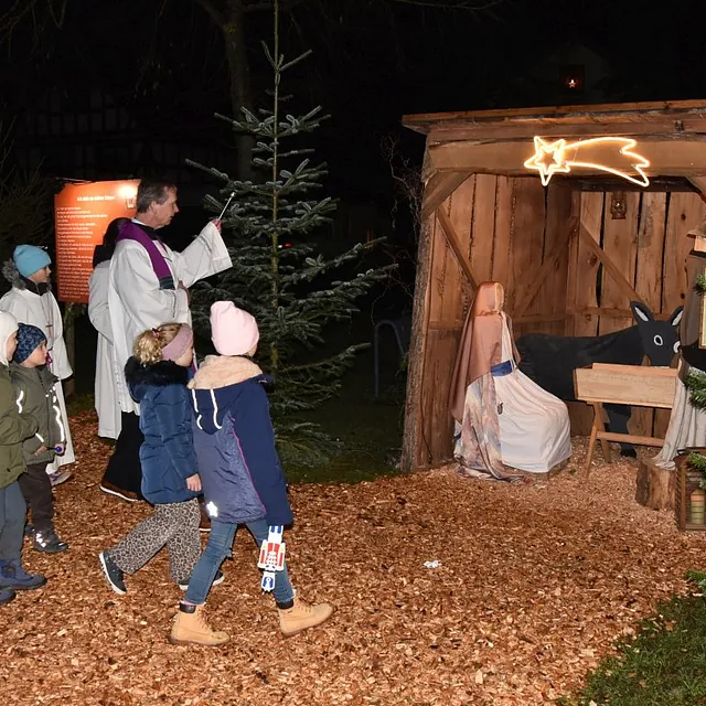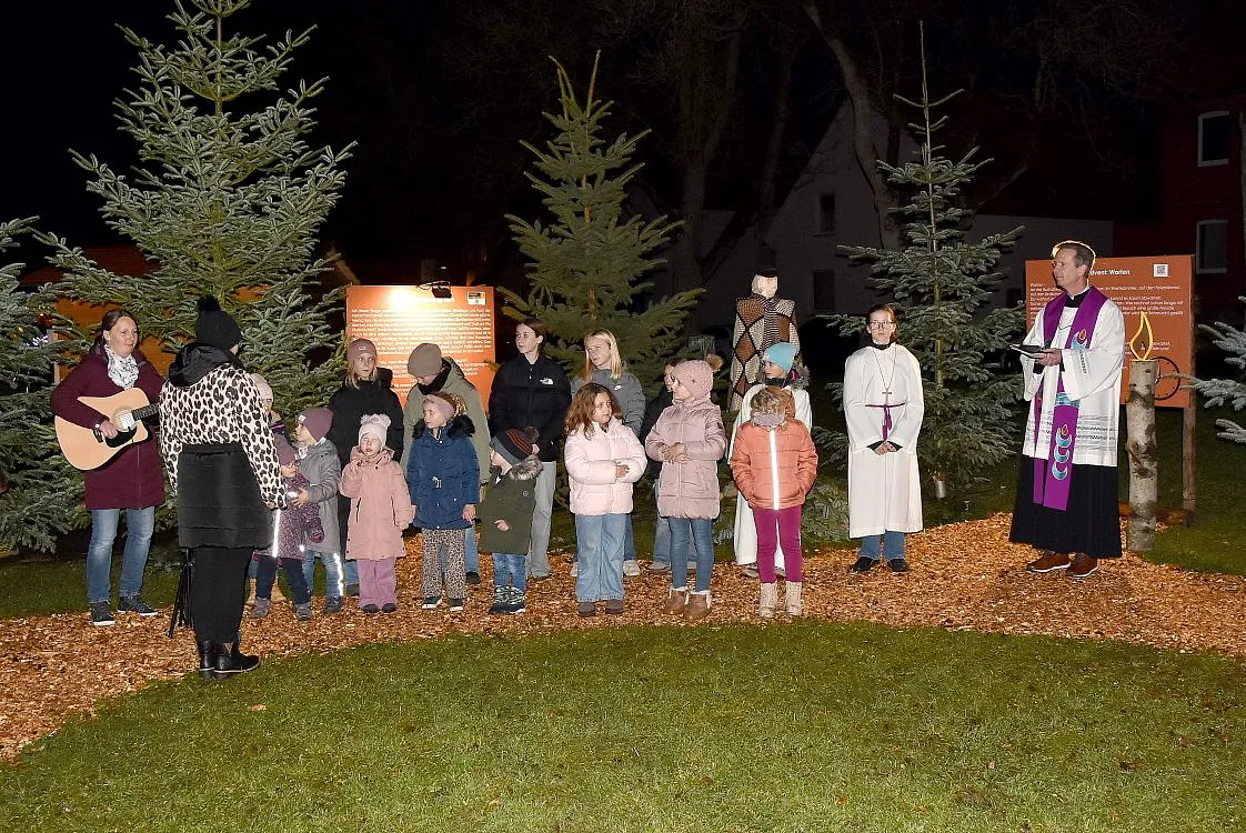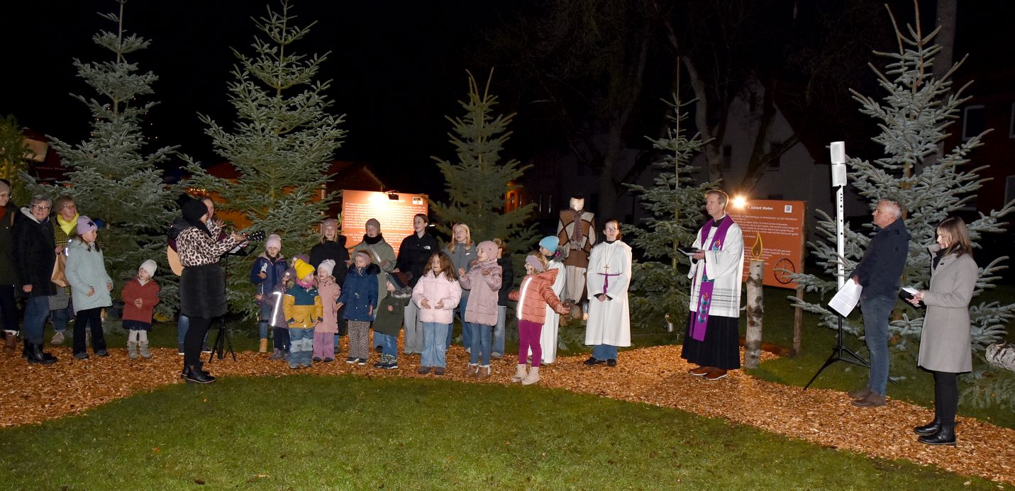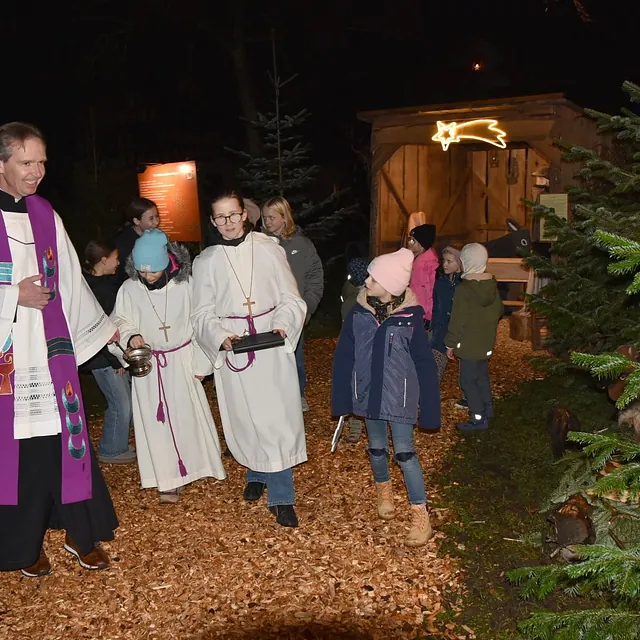 Nach einem Segensgebet zog Pfarrer Matthäi gemeinsam mit Messdienerinnen und Kindern von Station zu Station und segnete diese mit Weihwasser. Mit dem Schlusssegen und dem Lied „Macht hoch die Tür, die Tor macht weit“ endete die Eröffnungsfeier. Musikalisch gestaltet wurde sie vom Kindersingkreis Rasdorf unter der Leitung von Stephanie Hardegen und Jacqueline Mathes, der unter anderem „Macht die Türen auf“ und „Eins, Zwei, Drei, Vier – Weihnachten steht vor der Tür“ sang. Nadine Lenz dankte zudem dem Aufbauteam unter der Leitung von Theo Lenz, dem gemeindlichen Bauhof sowie den Baumpaten und Sponsoren für ihre Unterstützung.