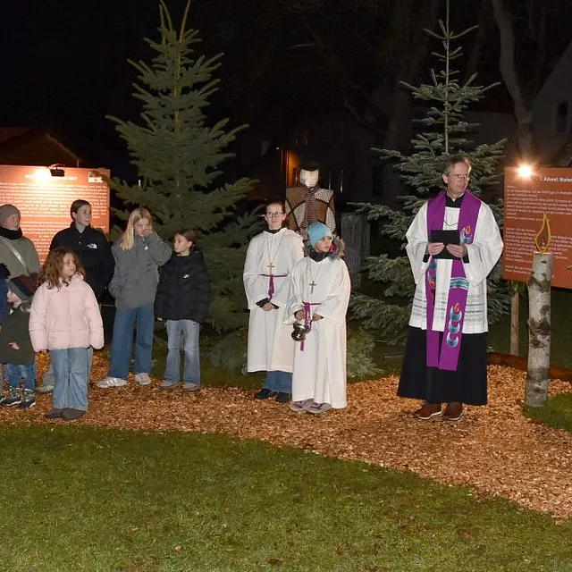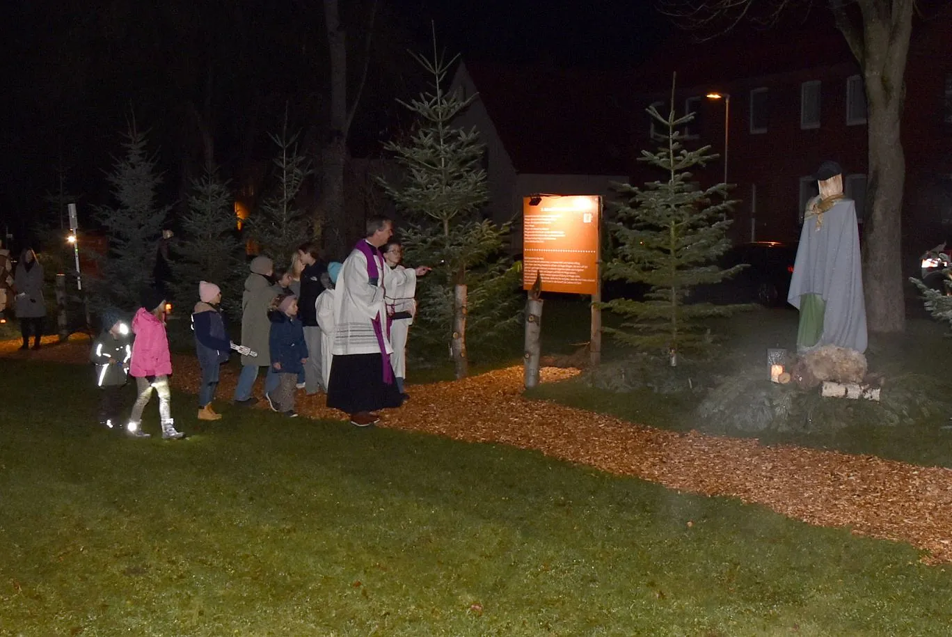 In drei Tagen hatte das Aufbauteam rund 50 Weihnachtsbäume besorgt, die Stationen errichtet und den Weg mit von der Gemeinde gestifteten Hackschnitzeln so hergerichtet, dass er auch bei nassem Wetter gut begehbar ist. Die 14 Stationen sowie die Krippe können täglich bis zum 6. Januar 2026 besucht werden. Der Eintritt ist frei, der Weg bis 22 Uhr beleuchtet. Zehn Tafeln mit meditativen Texten und QR-Codes sollen eine besondere Atmosphäre schaffen und dazu einladen, sich auf das Geheimnis der Advents- und Weihnachtszeit einzulassen. Für Kinder ist der Adventsweg besonders geeignet, da sie die lebensgroßen Figuren berühren sowie Schaffiguren mit echter Wolle anfassen können.